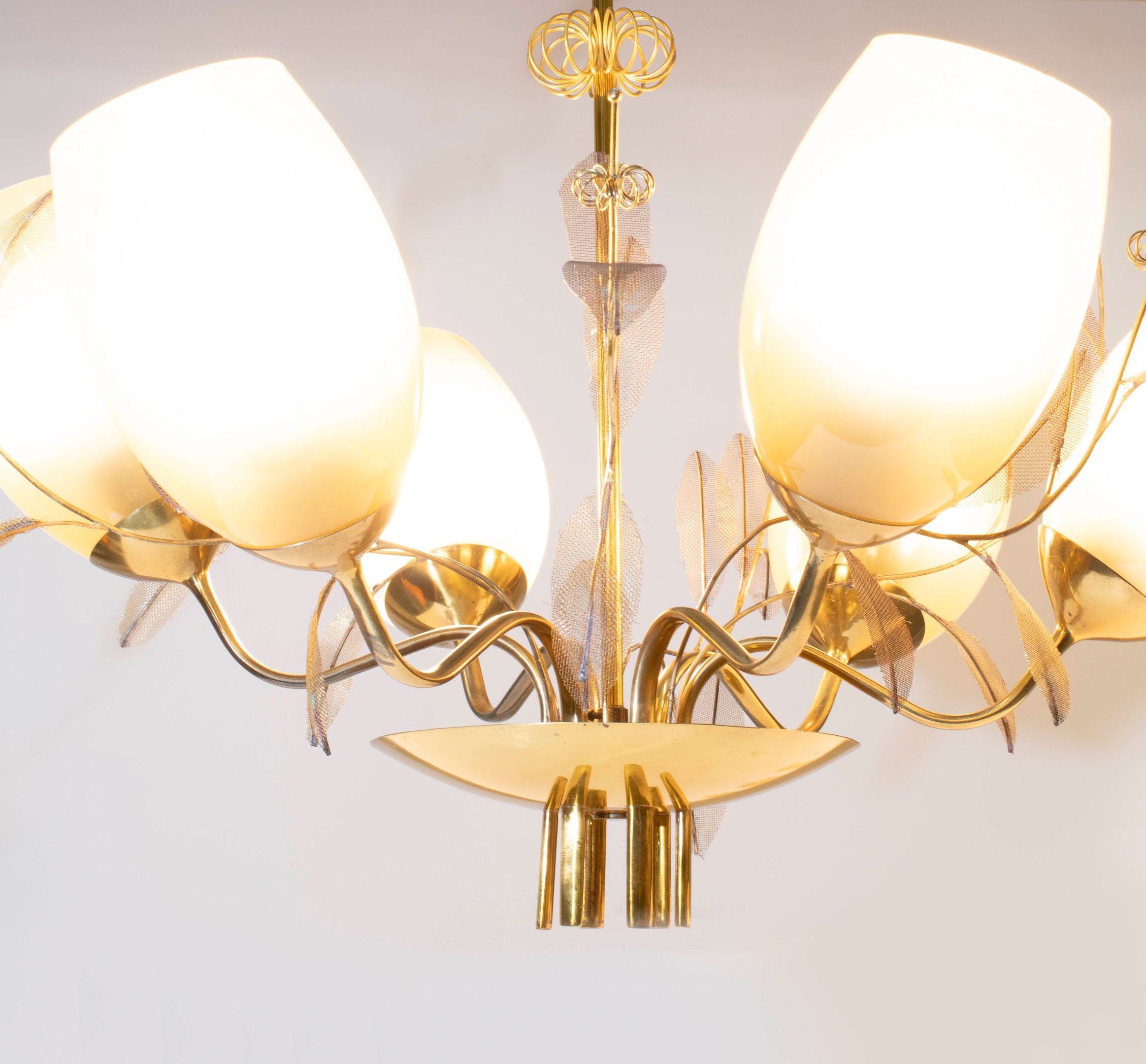 A pair of brass and opalin glass mod. 9029/6 ceiling lamps by Paavo Tynell for Taito Oy - circa 1950