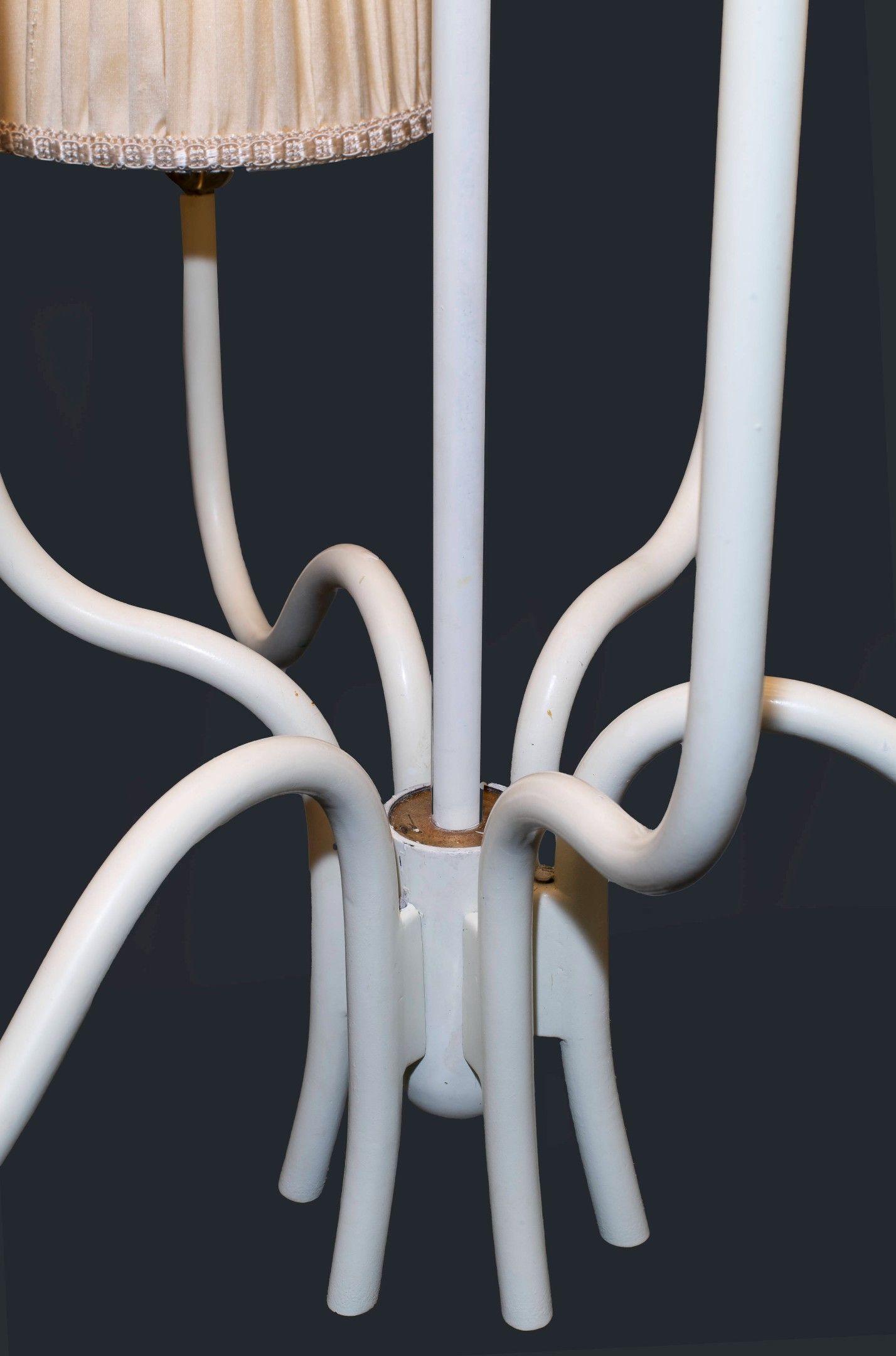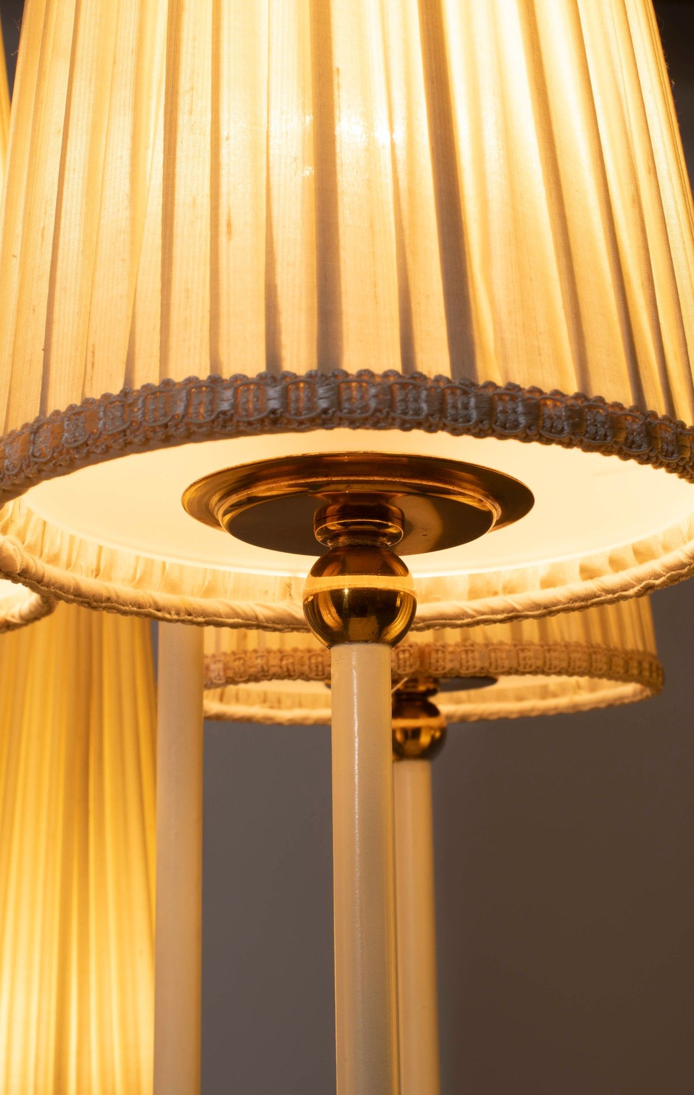 White lacquered metal structure, brass details, frosted glass diffusers, silk shades