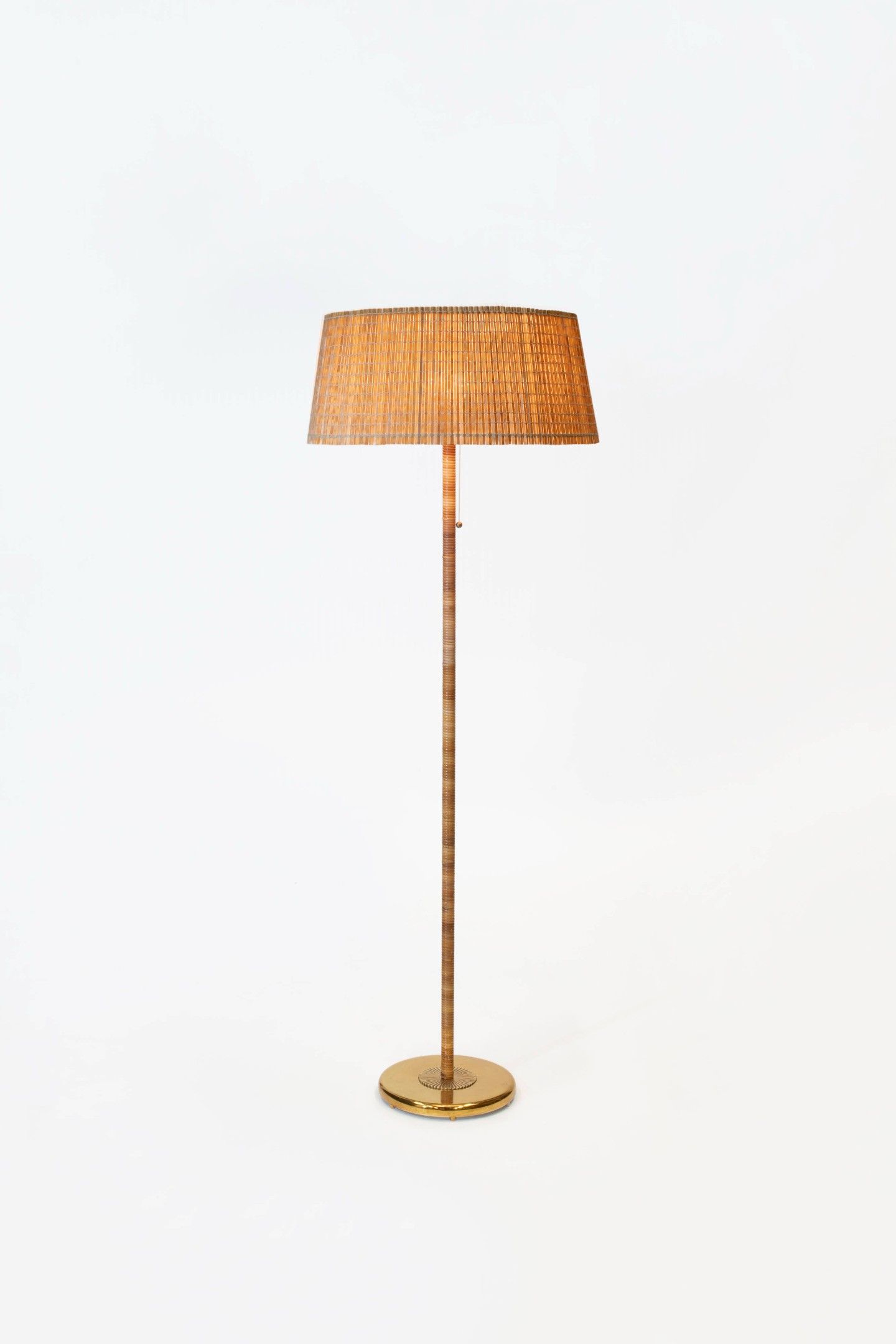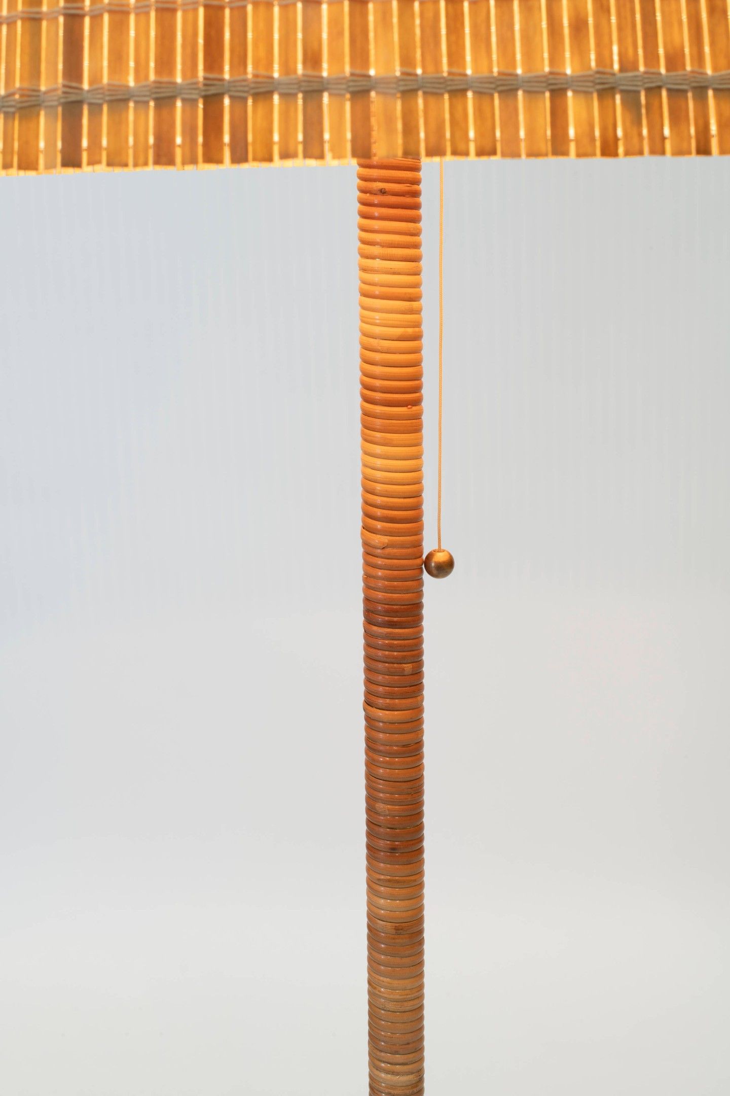 Brass structure, rattan-wrapped shaft, birch and silk lamella shade