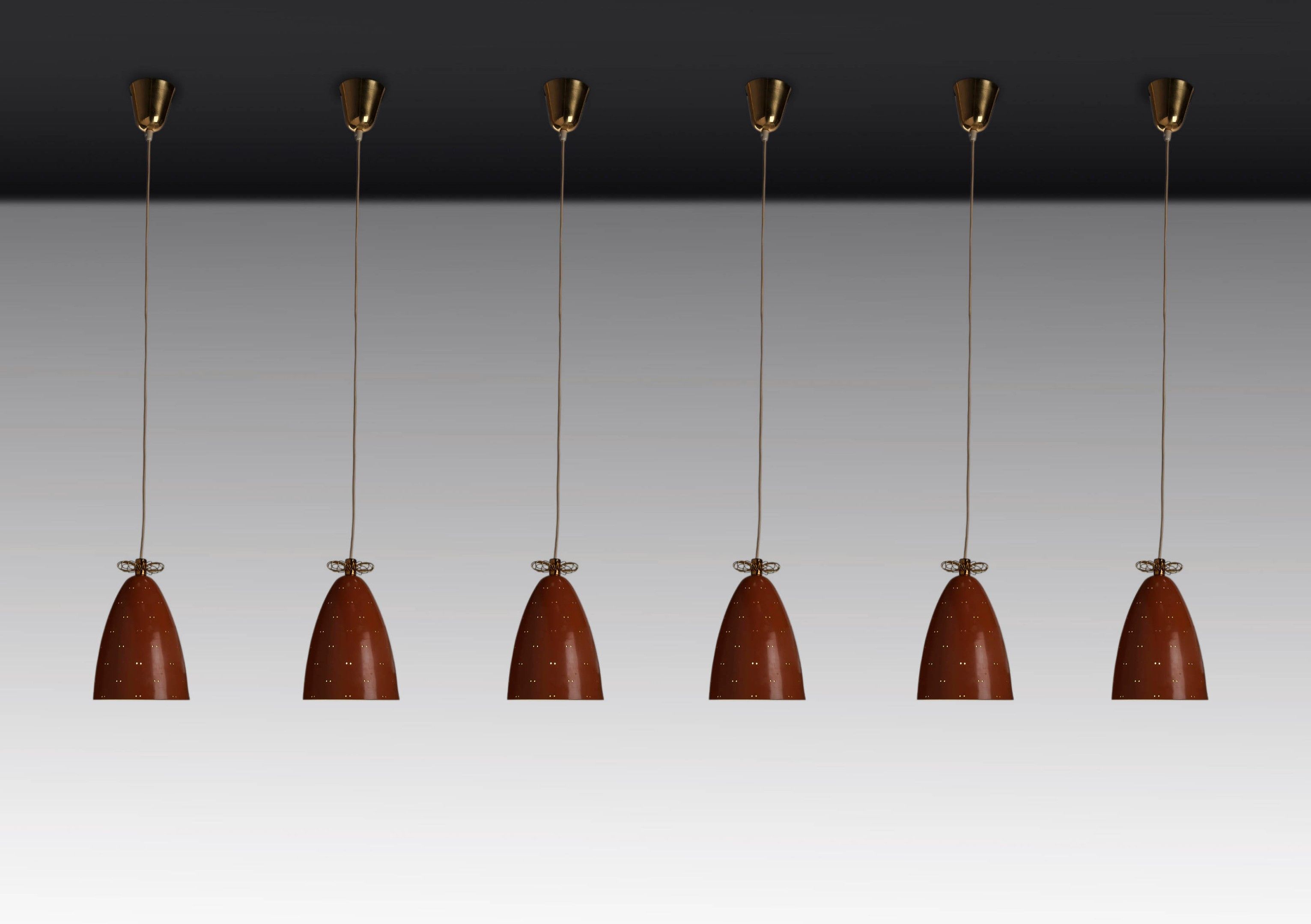 A set of six lacquered metal and brass mod. J1979 ceiling lamps by Paavo Tynell for Taito Oy - circa 1950