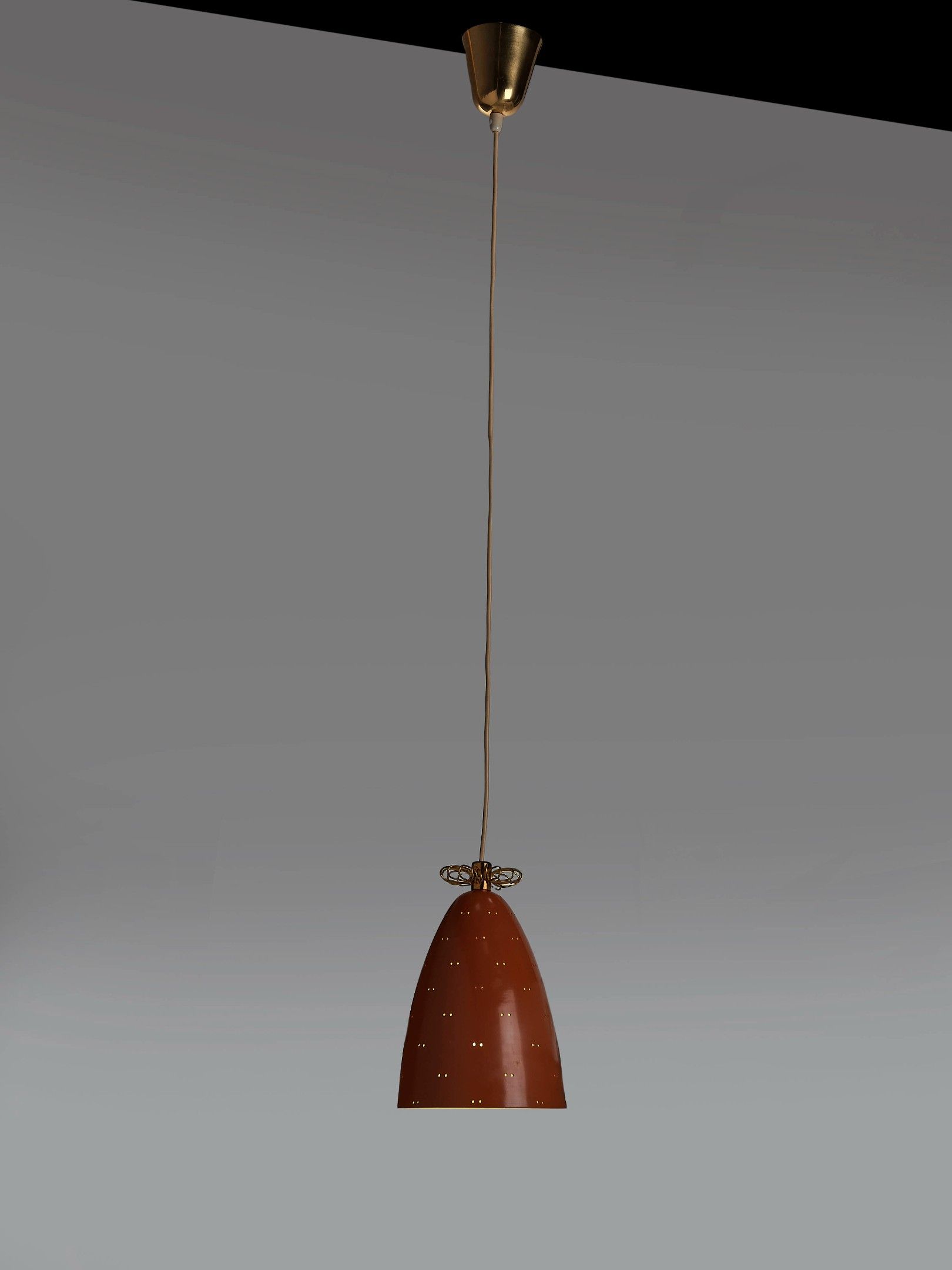 Perforated white and coral lacquered metal lampshade, brass cover and decoration