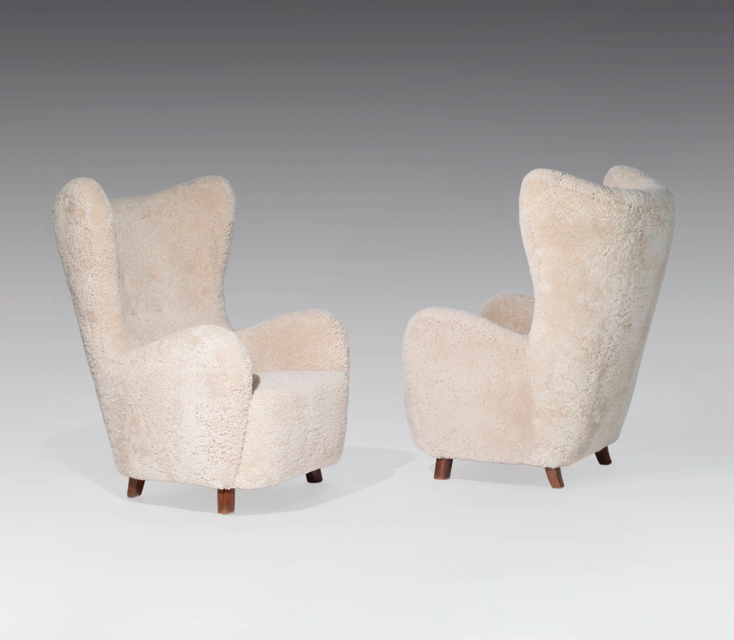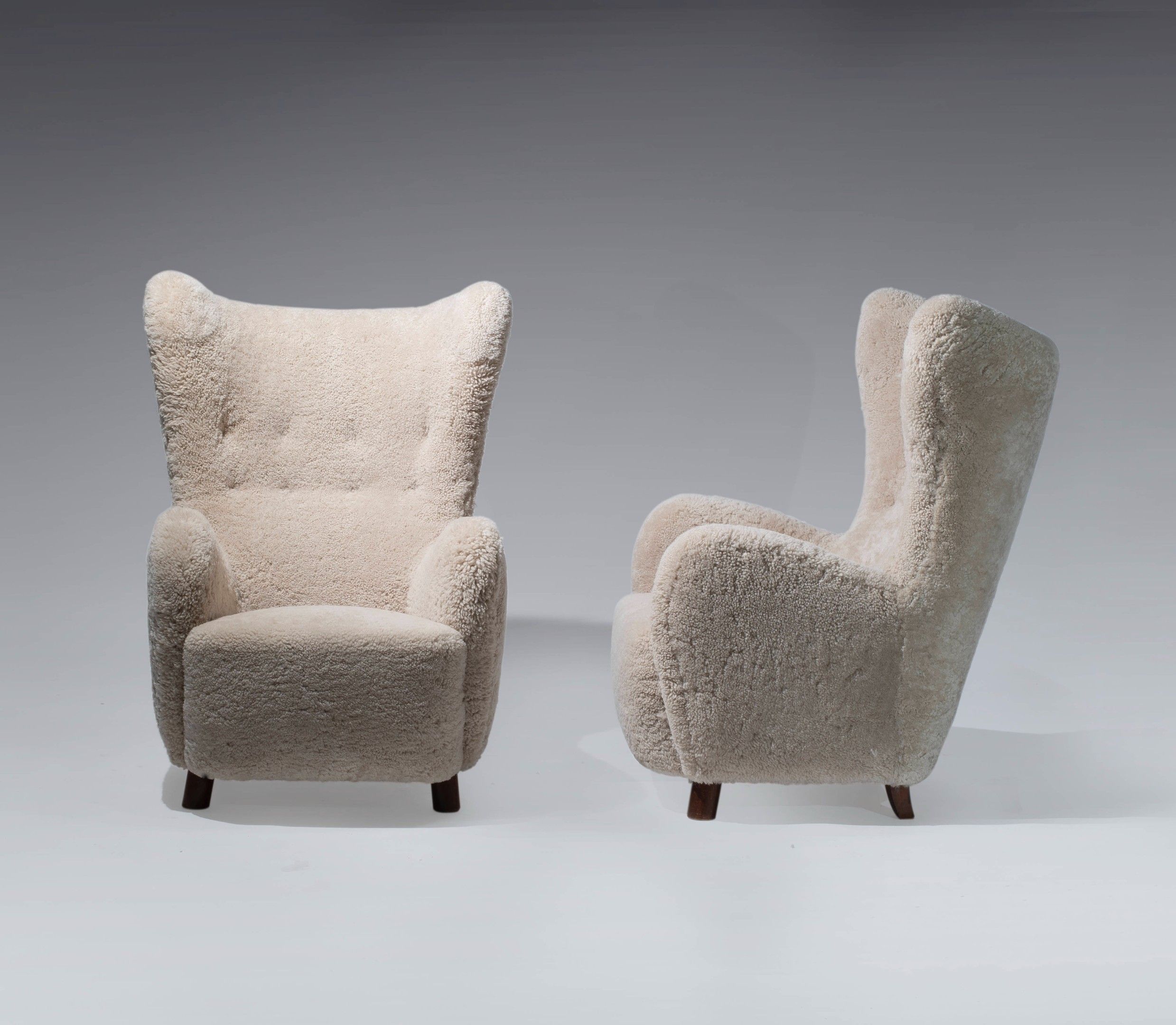 A pair of mahogany and sheepskin "Wing Chairs" by Mogens Lassen - model created in 1930