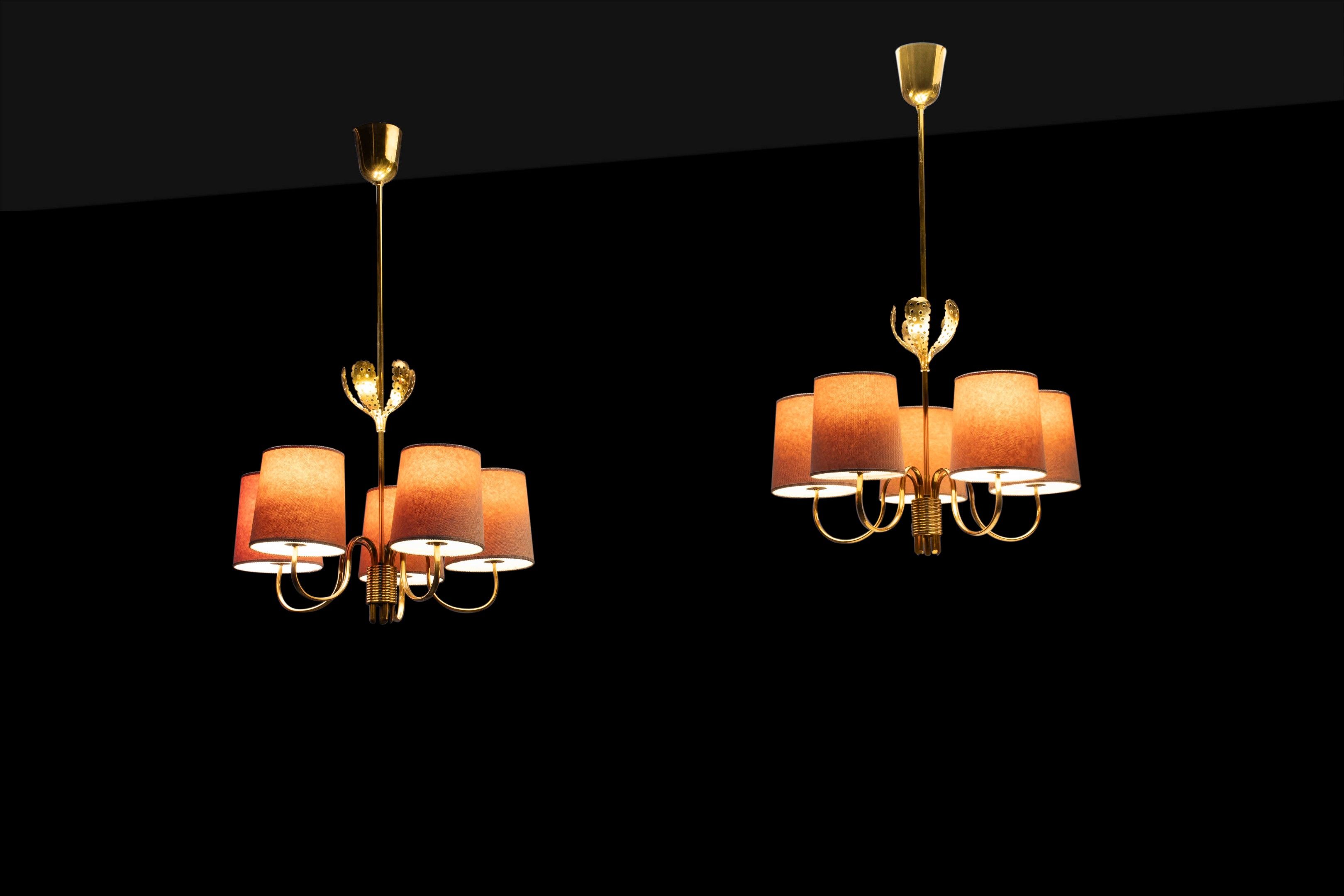 A pair of brass, frosted glass and fabric mod. 9030 ceiling lamps by Paavo Tynell for Taito Oy - circa 1950