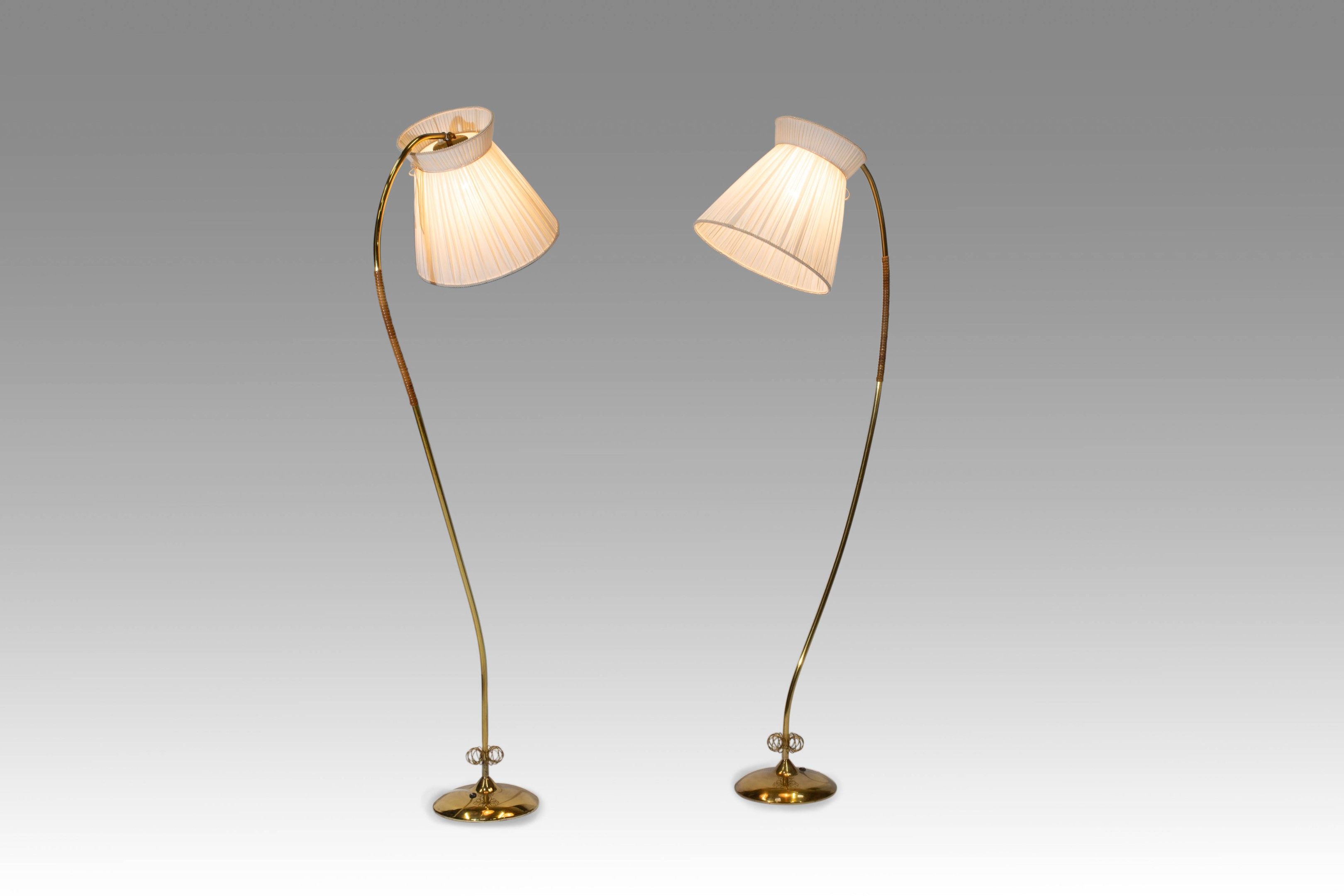 A pair of brass, rattan and silk floor lamps by Soini - circa 1950