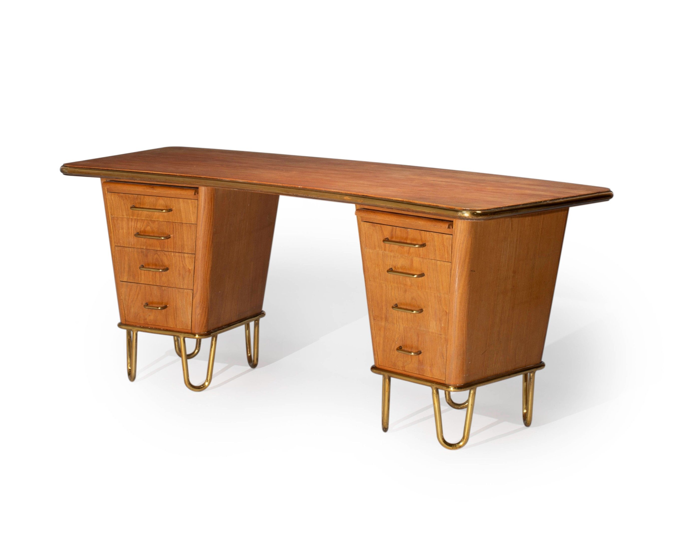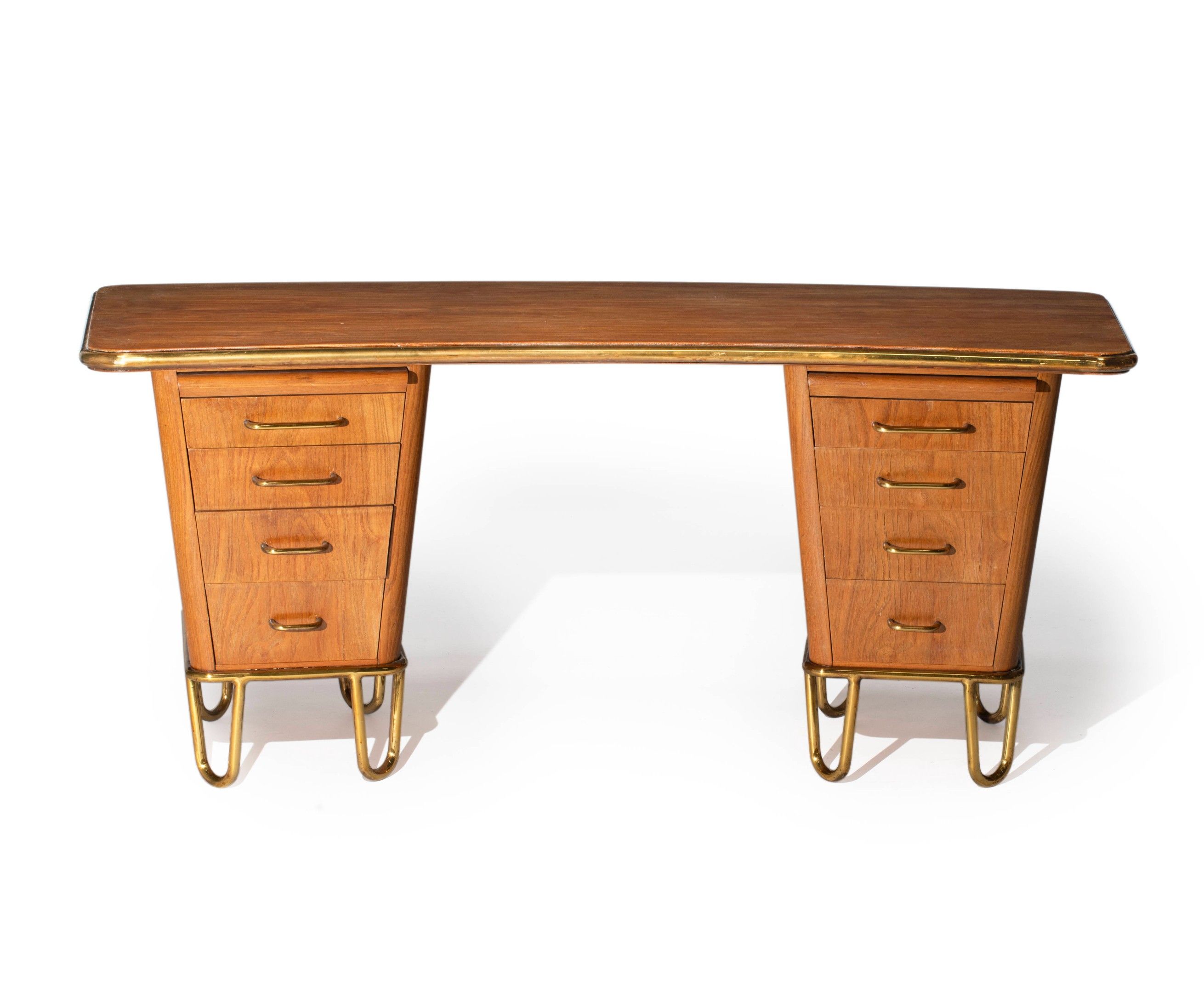 Gilded brass legs and components, ash structure consisting of a top, eight drawers and two pull-out shelves.