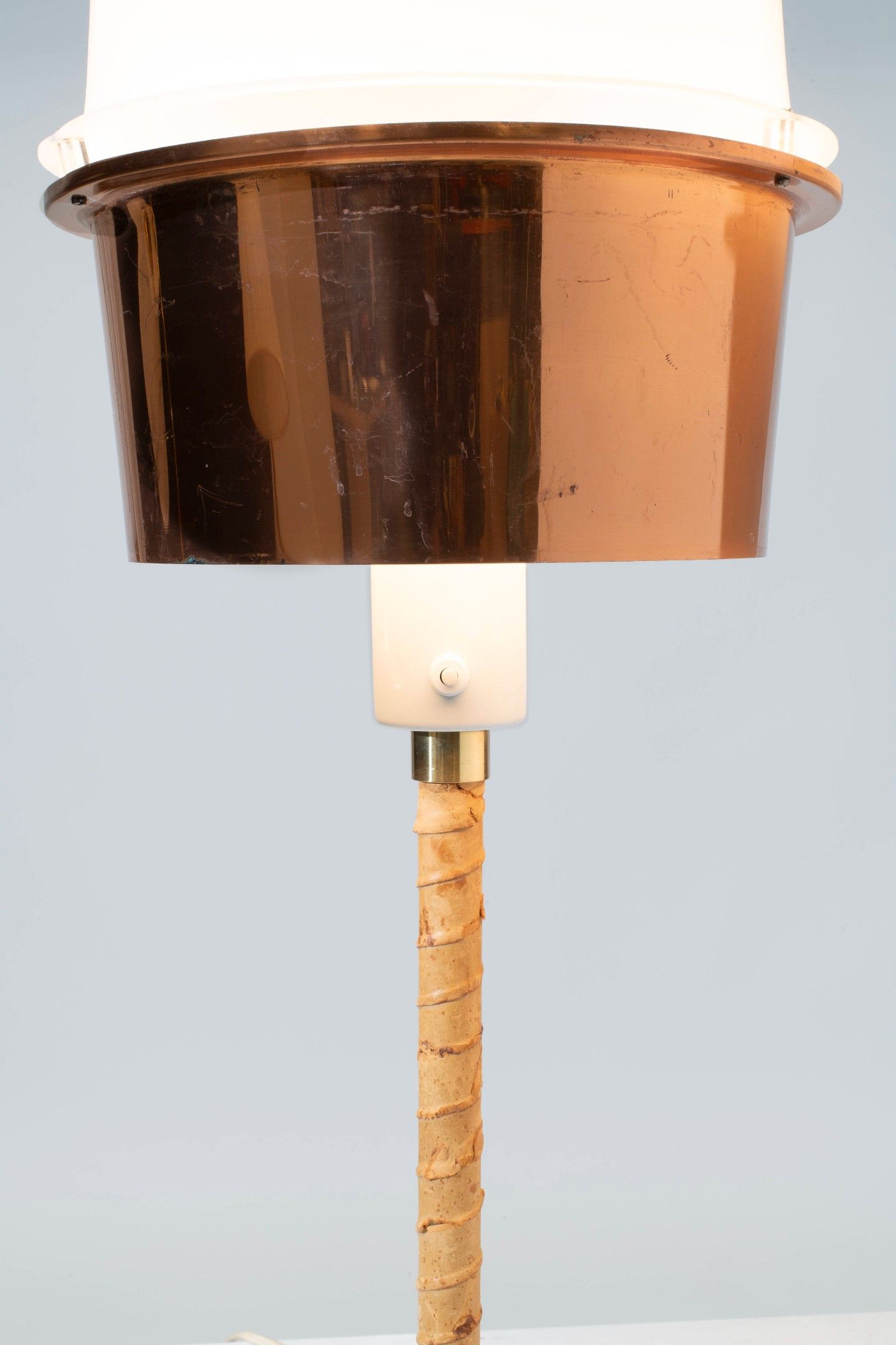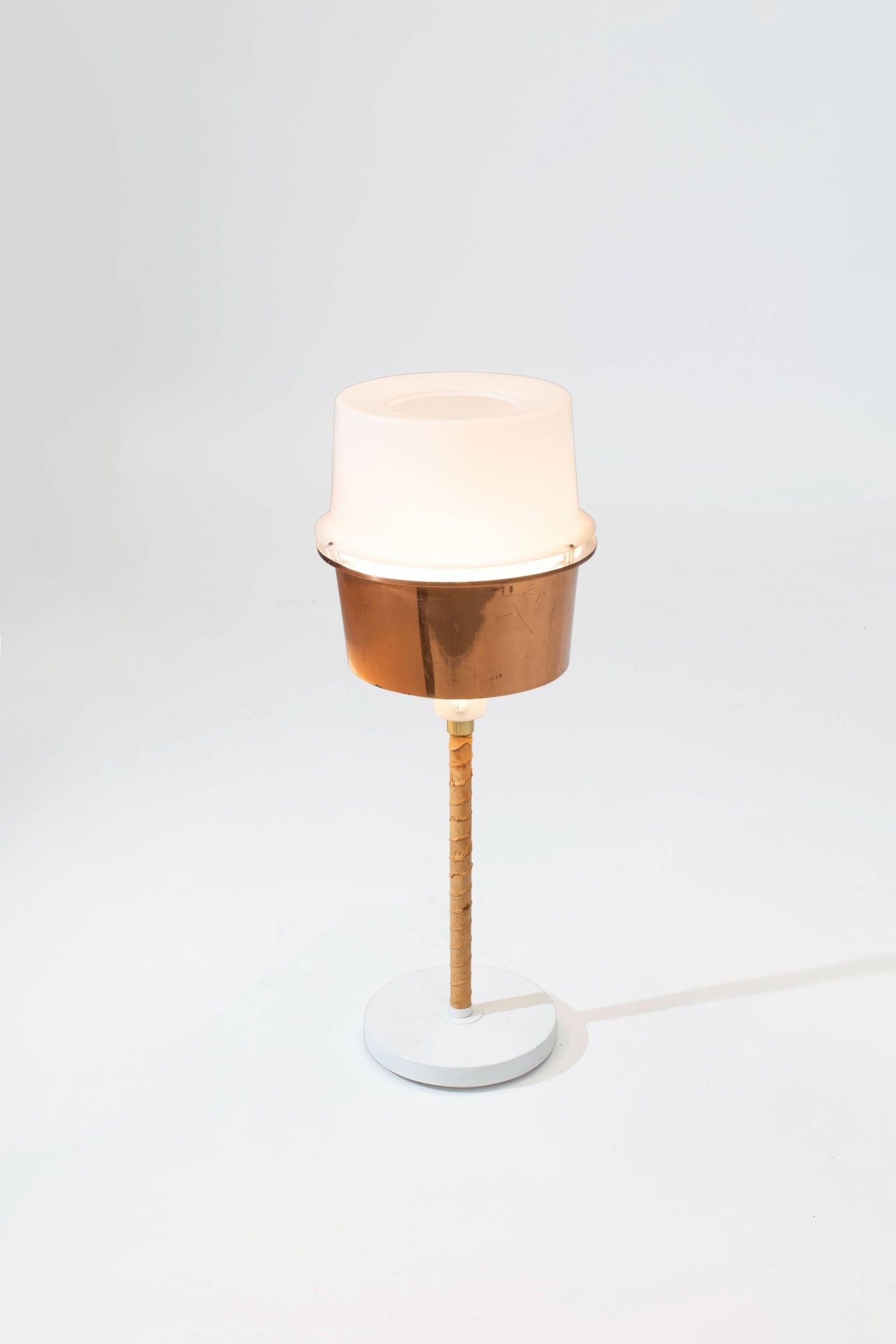 White lacquered metal base, leather-wrapped shaft, lacquered copper-coloured aluminium and acrylic reflector