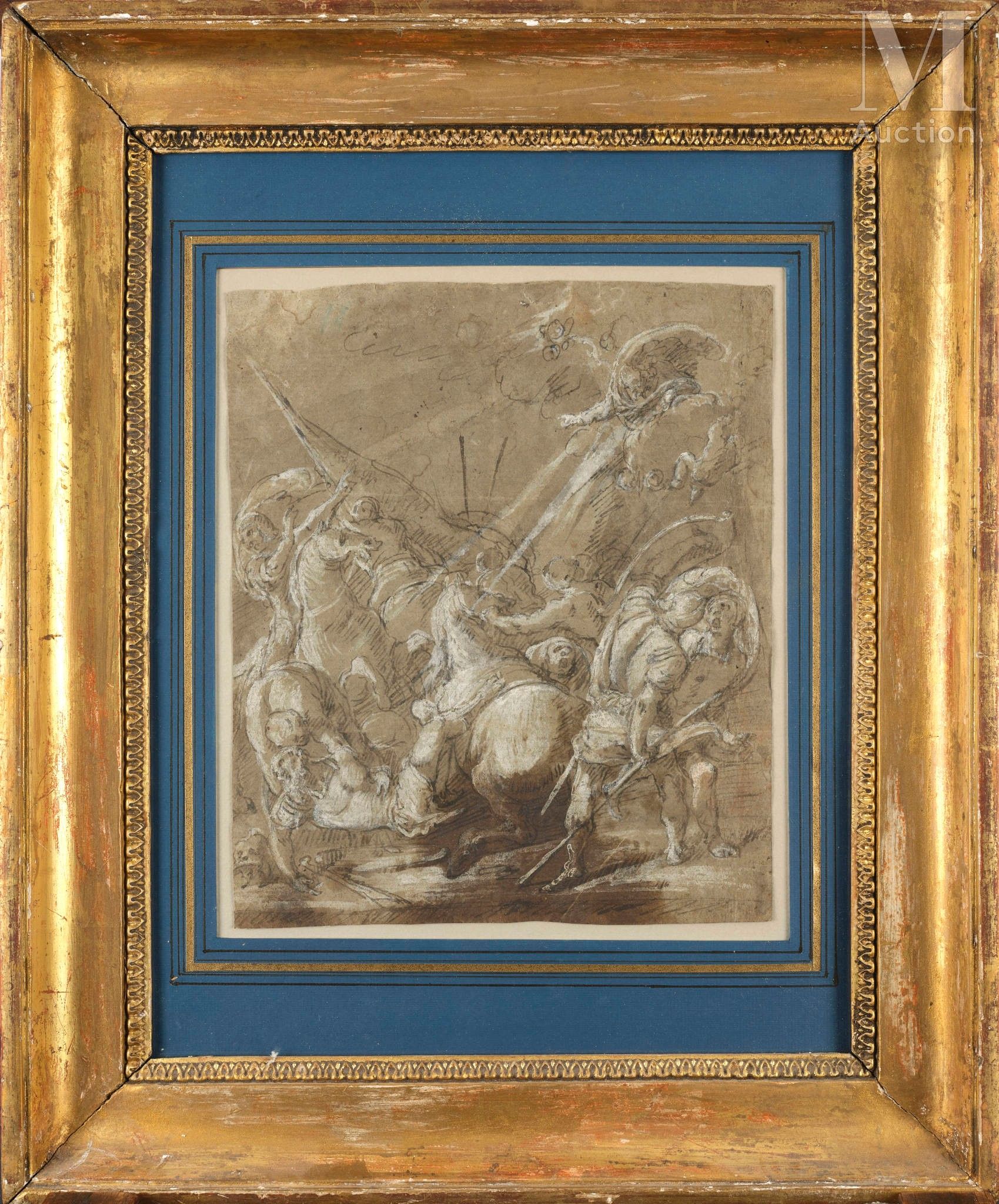 Pen and brown ink, brown wash and white gouache highlights on half-tone paper