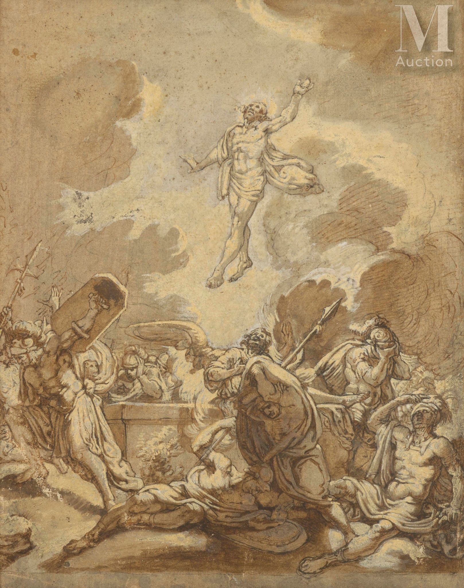 Pen and black ink, brown wash and white gouache highlights on prepared paper