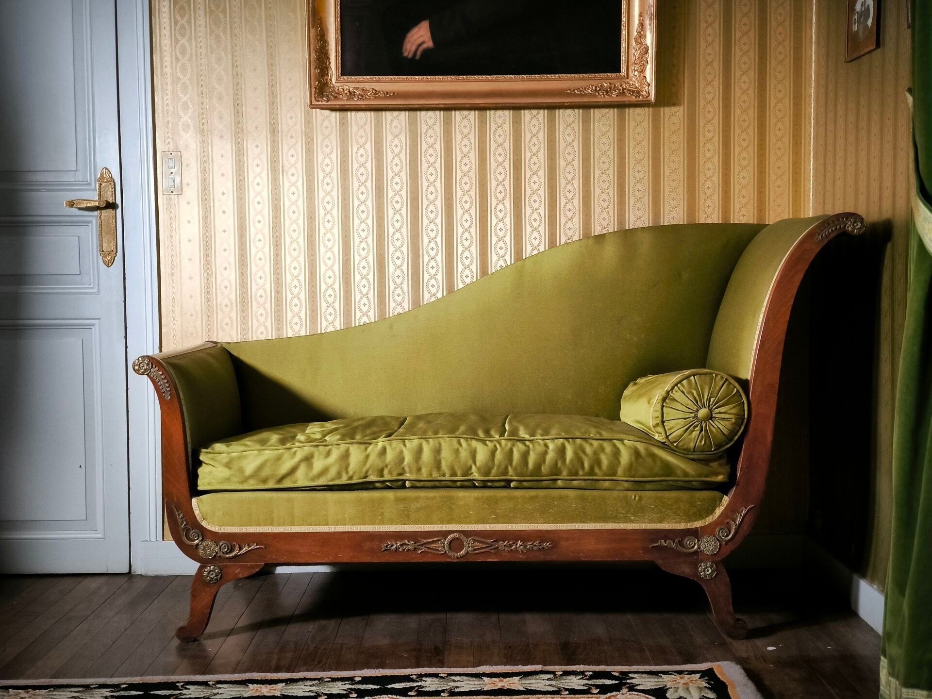 Mahogany and mahogany veneer meridienne, green fabric trim, …