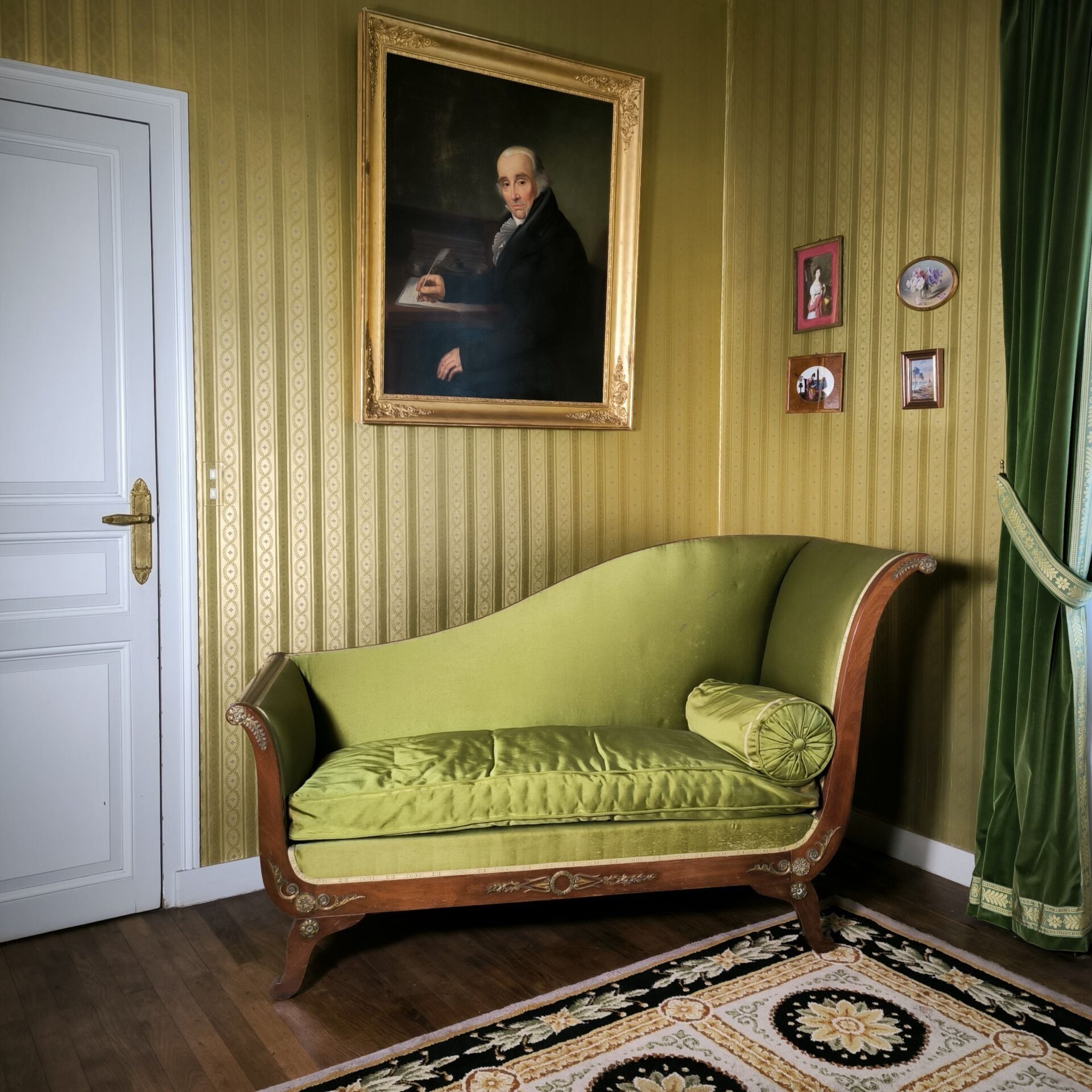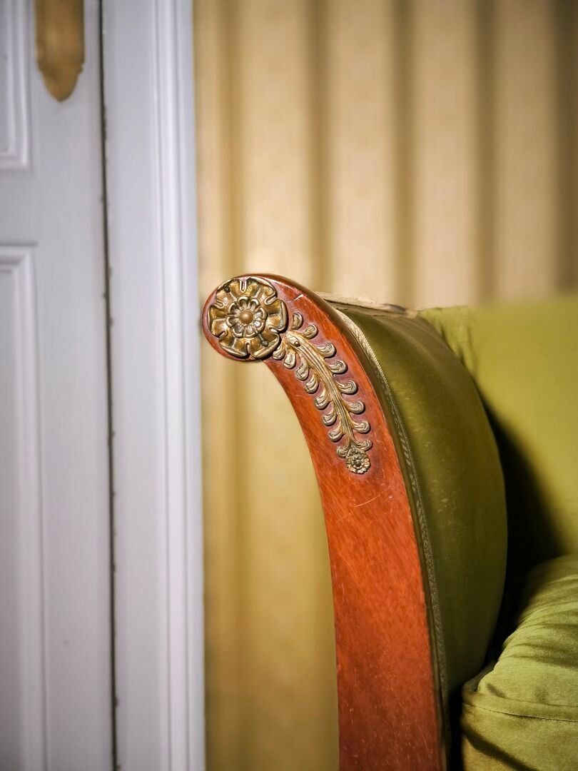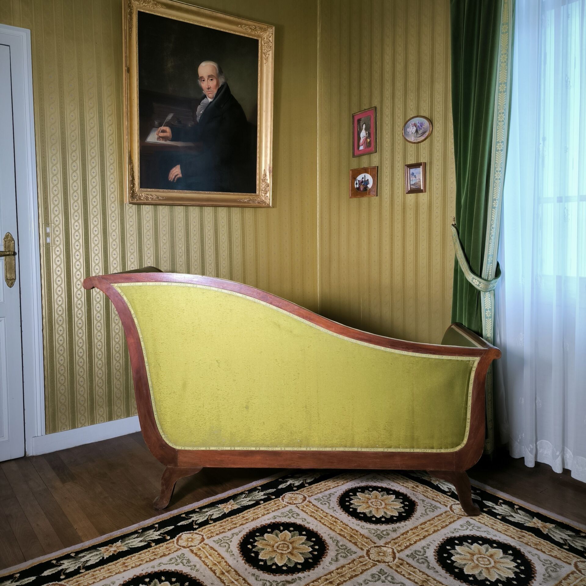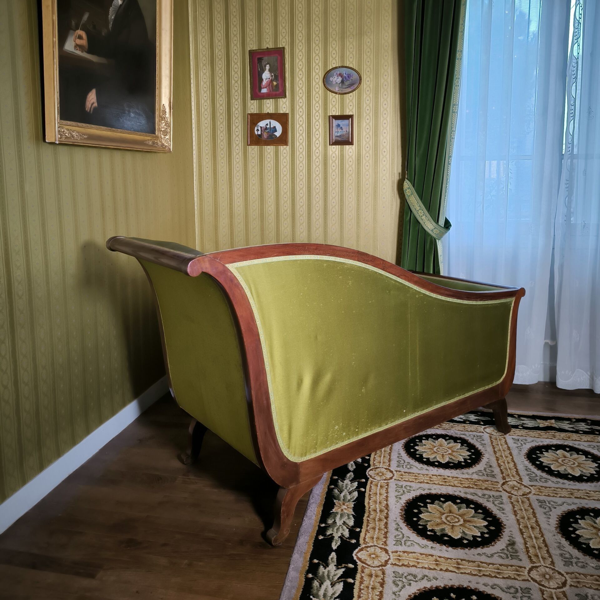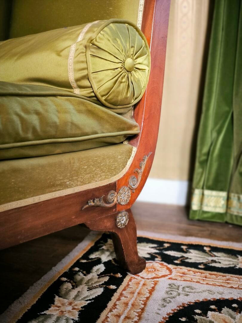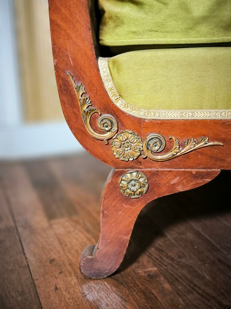 Mahogany and mahogany veneer meridienne, green fabric trim, bronze ornamentation. Restoration period. (minor wear) Height 100 cm, length 171 cm, depth 69.5 cm