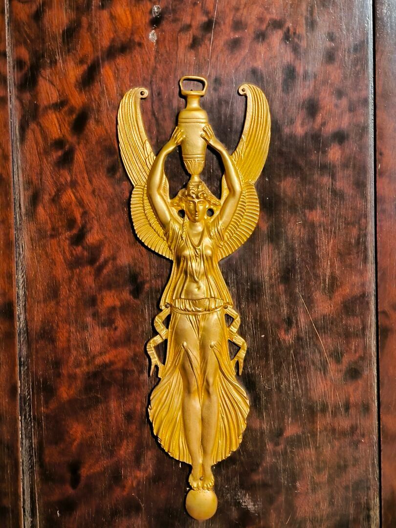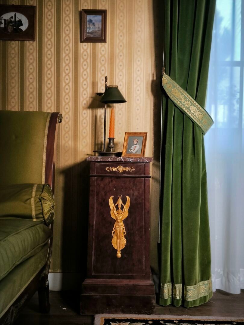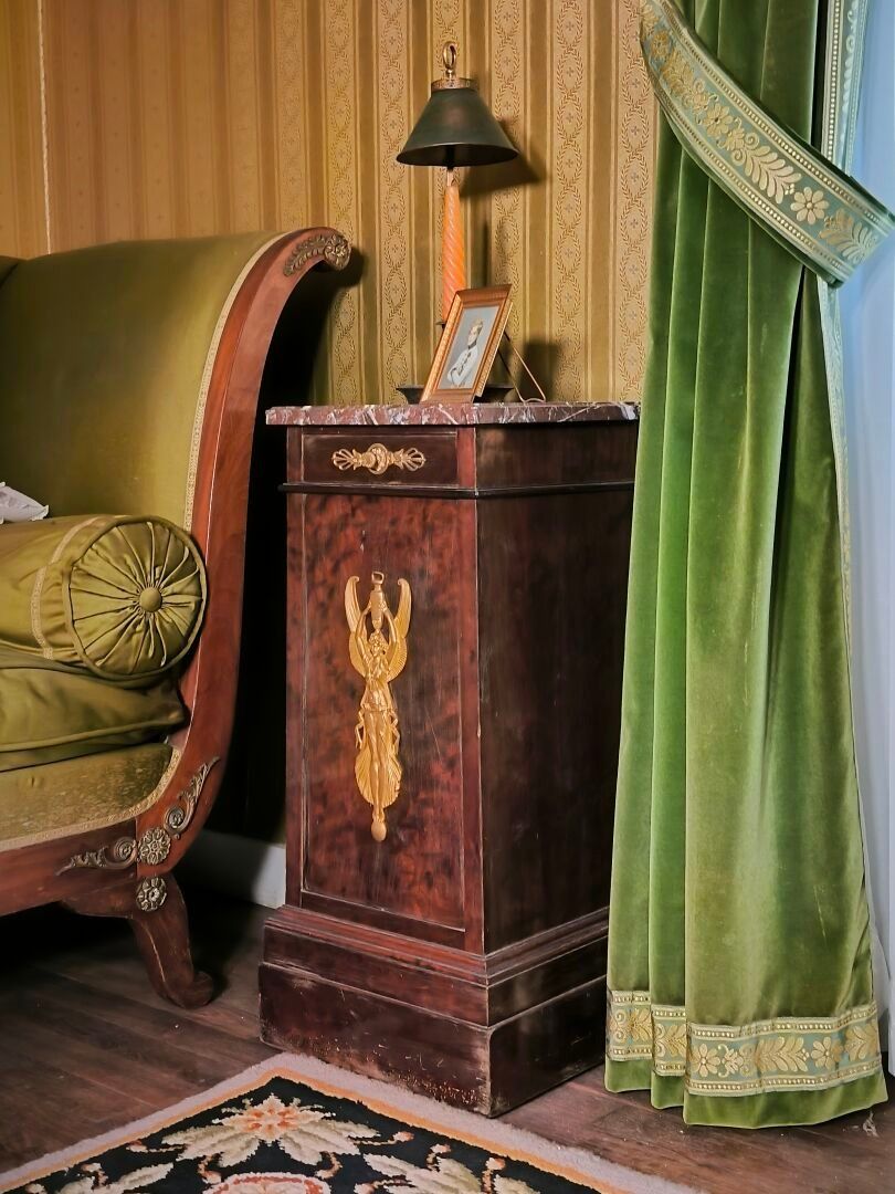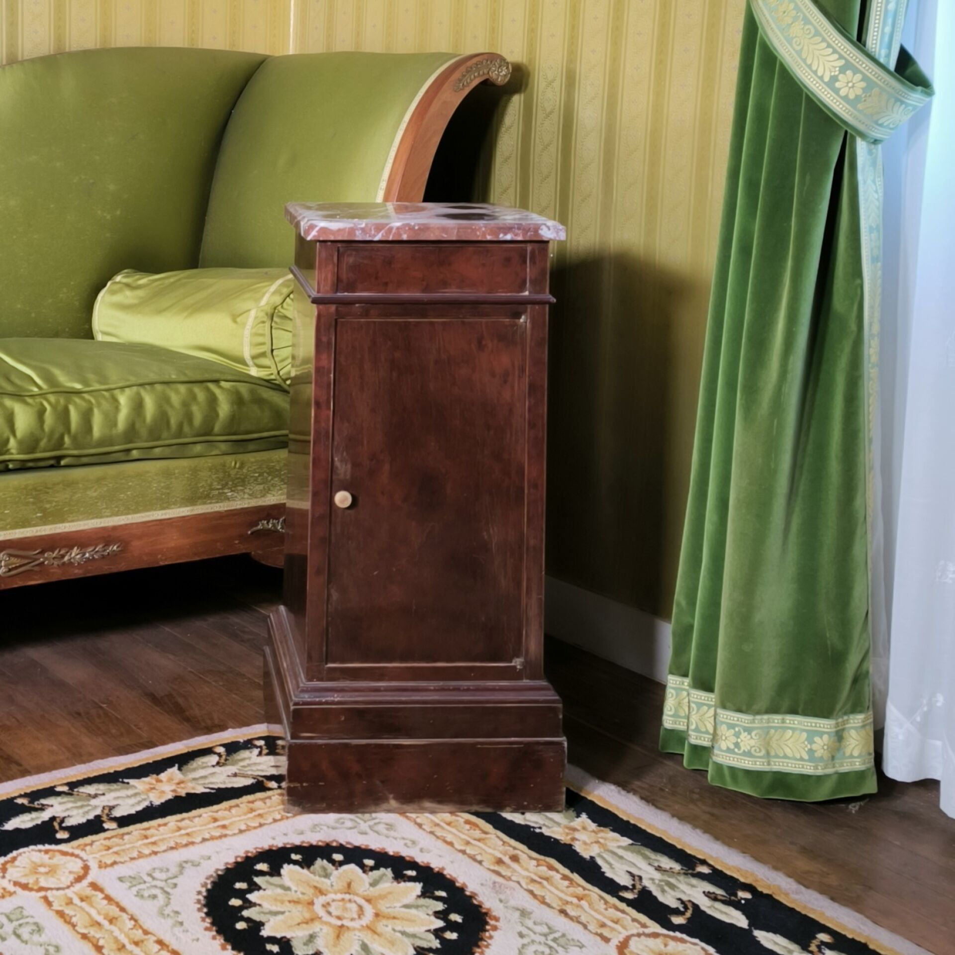 Mahogany and mahogany veneer bedside table, opening with a door and a drawer, bronze ornaments, marble top, Empire style (small accidents and scratches) Height 76 cm, length 36 cm, depth 36 cm