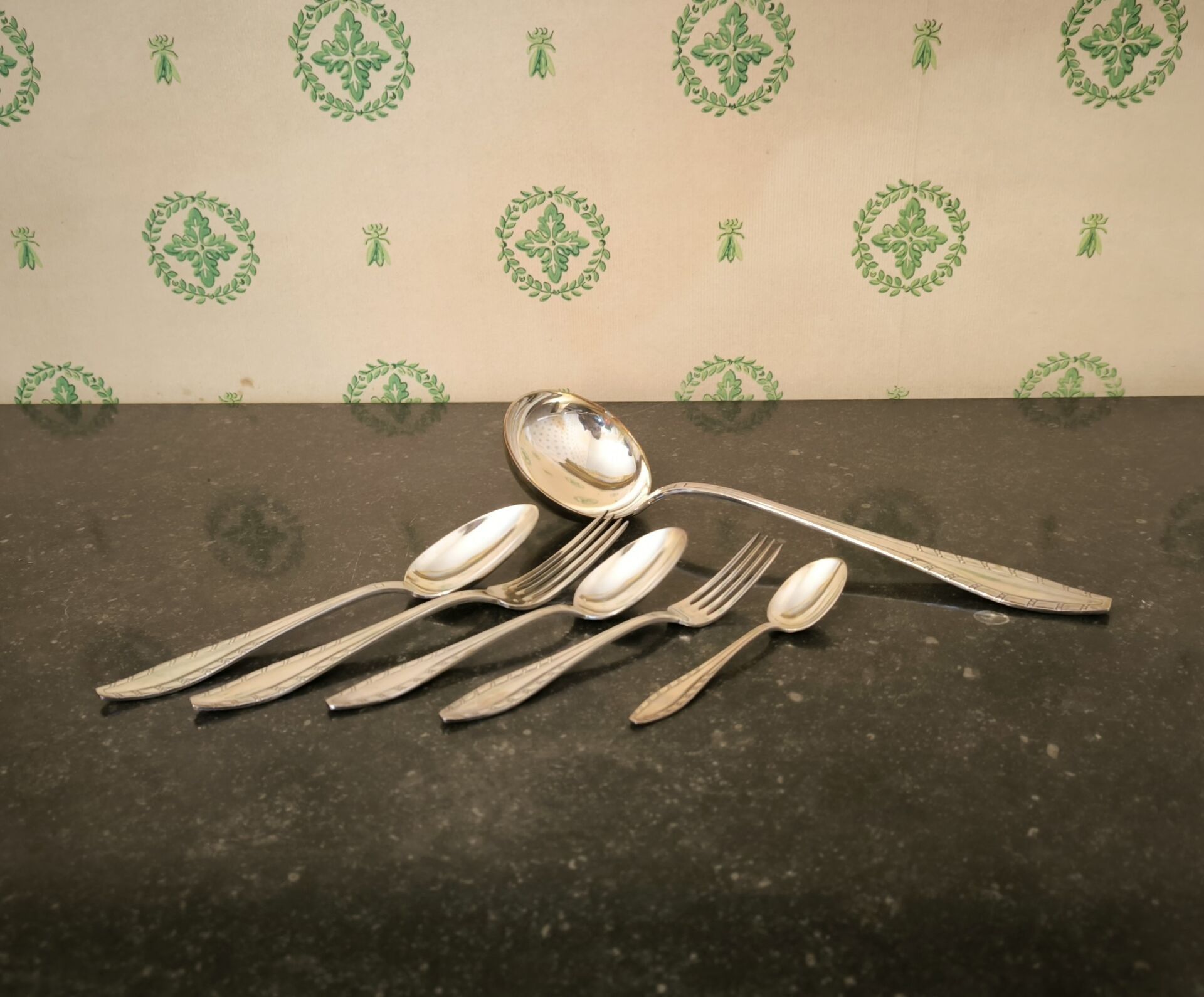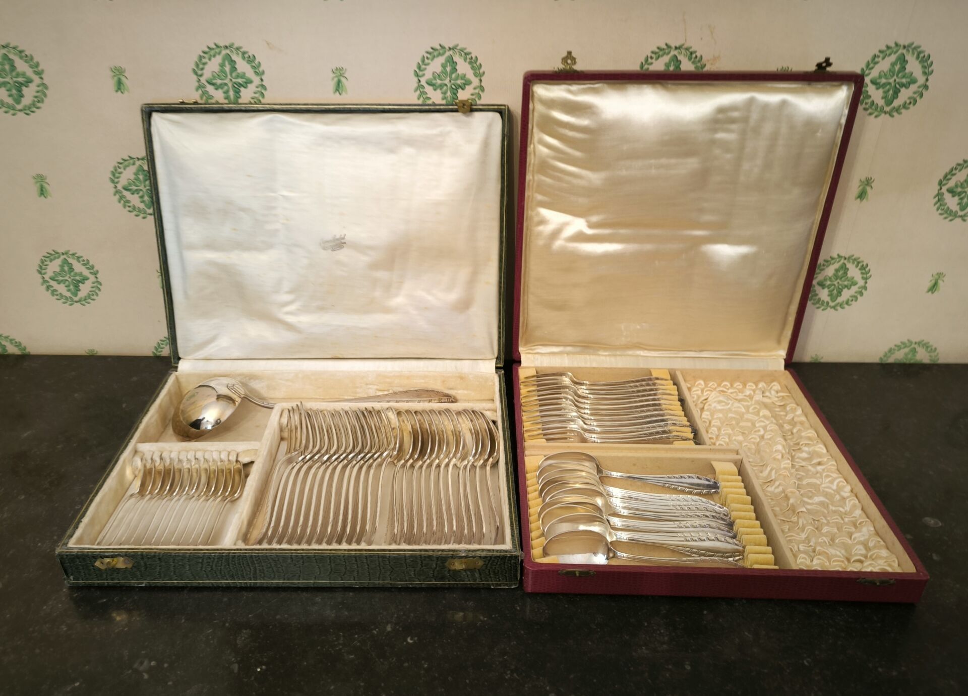 . Set of silver-plated cutlery, numbered "CS": 12 place settings, 12 dessert sets, 12 teaspoons, 1 ladle. Cases