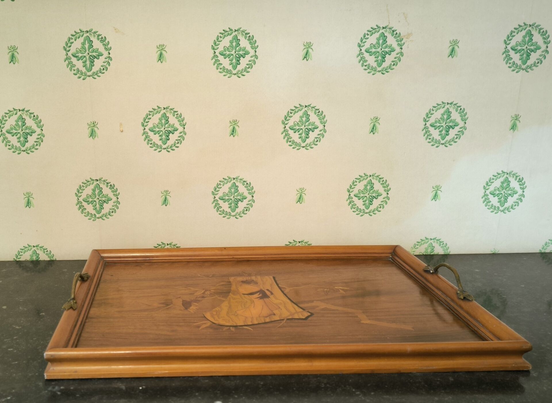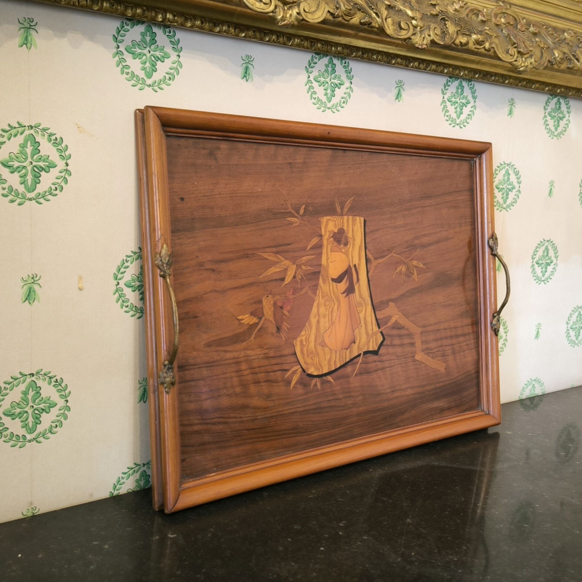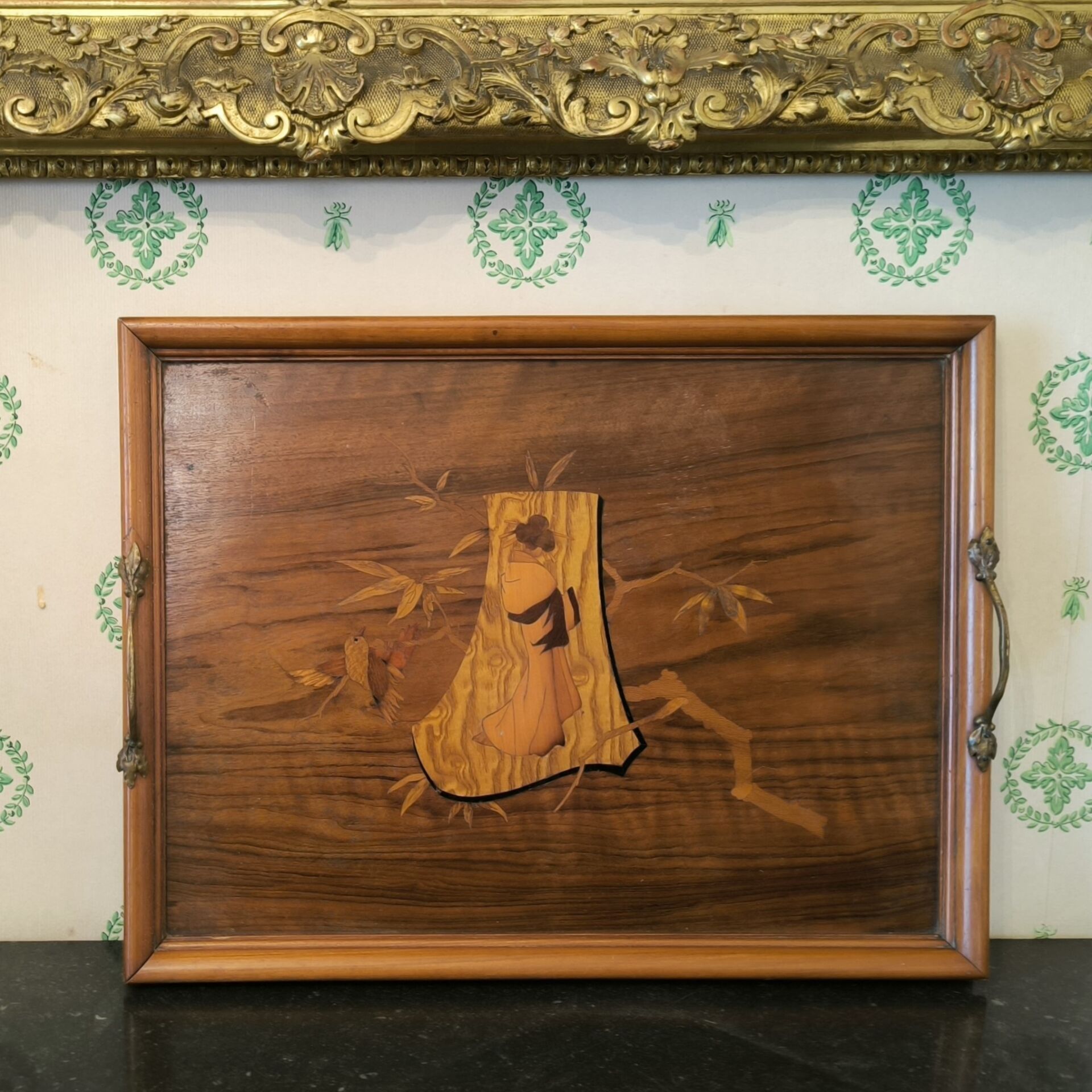 Veneered wood top decorated with a japanese woman, a bird and debranchages, Art Nouveau. 41.5 x 54 cm