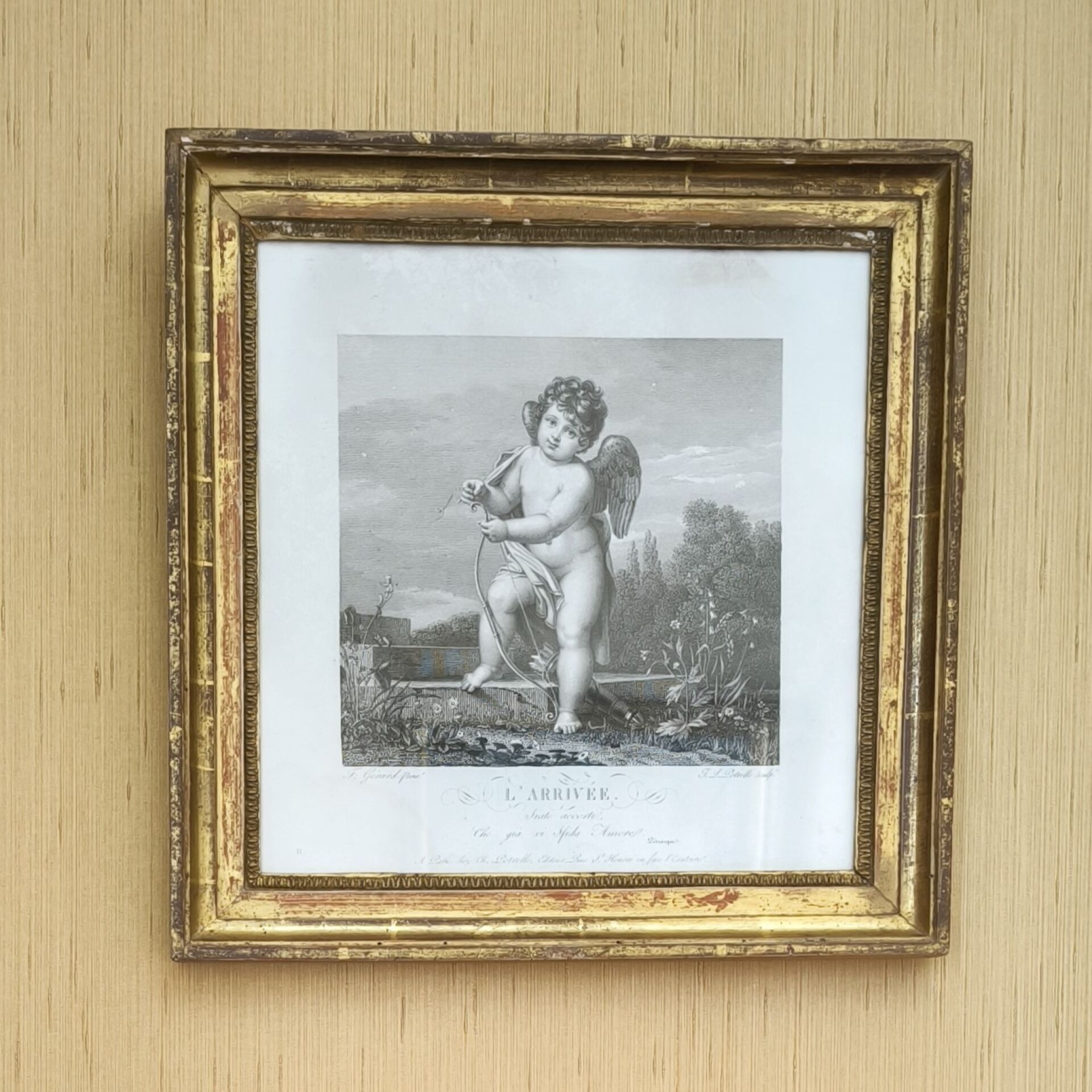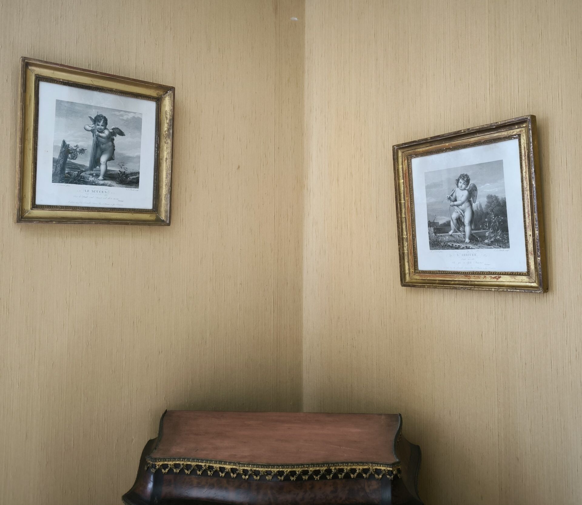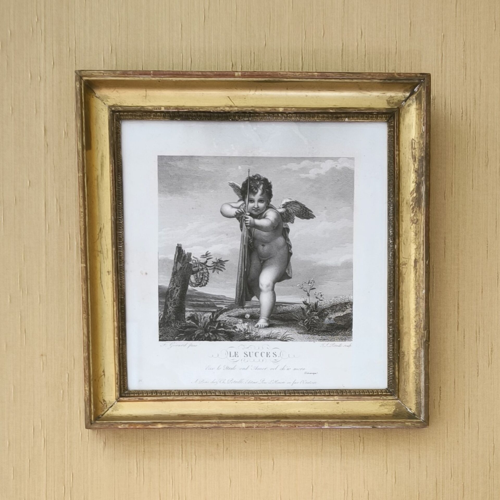 Set of 2 engravings, 19th century: Le succès and L'arrivée. 26 x 26 cm (view). Gilt frame