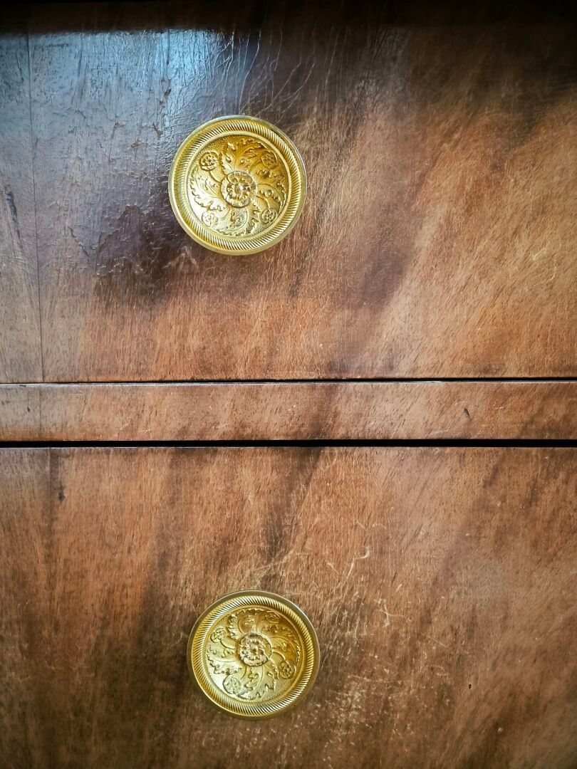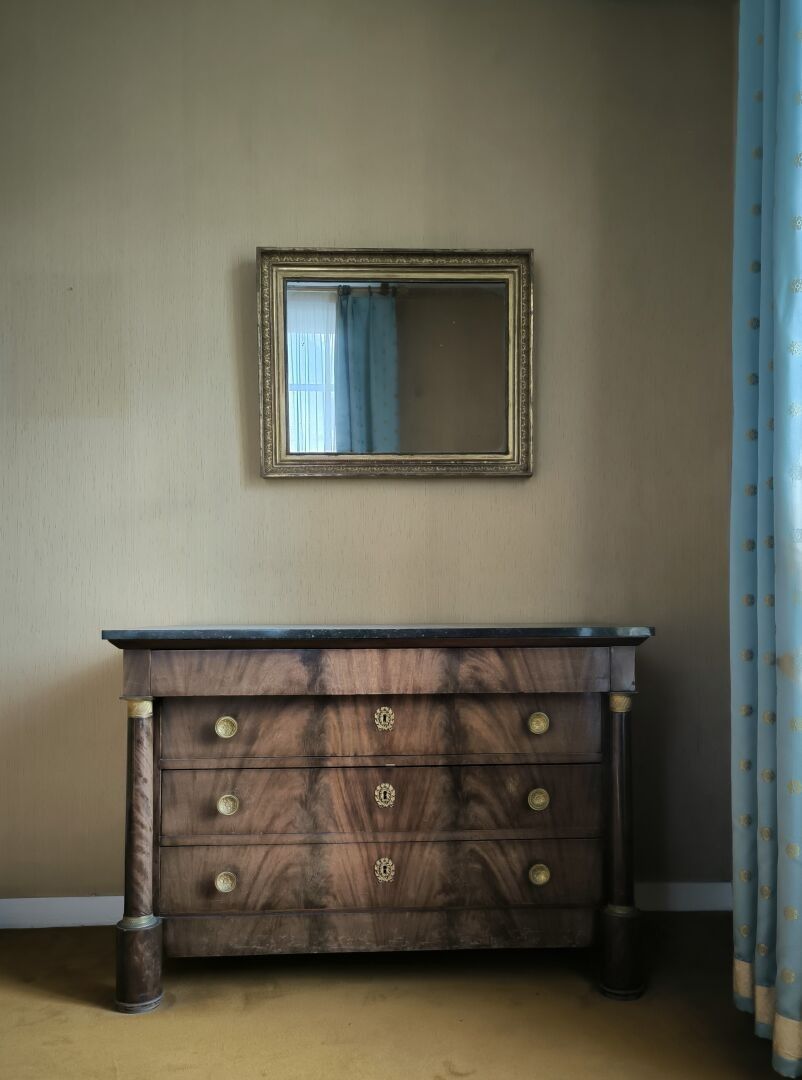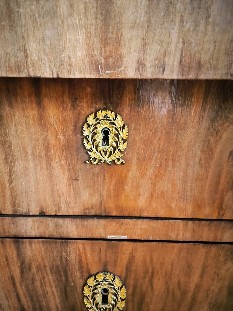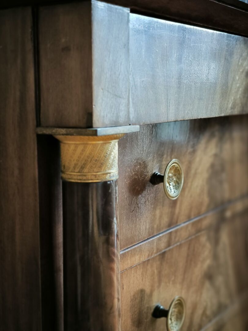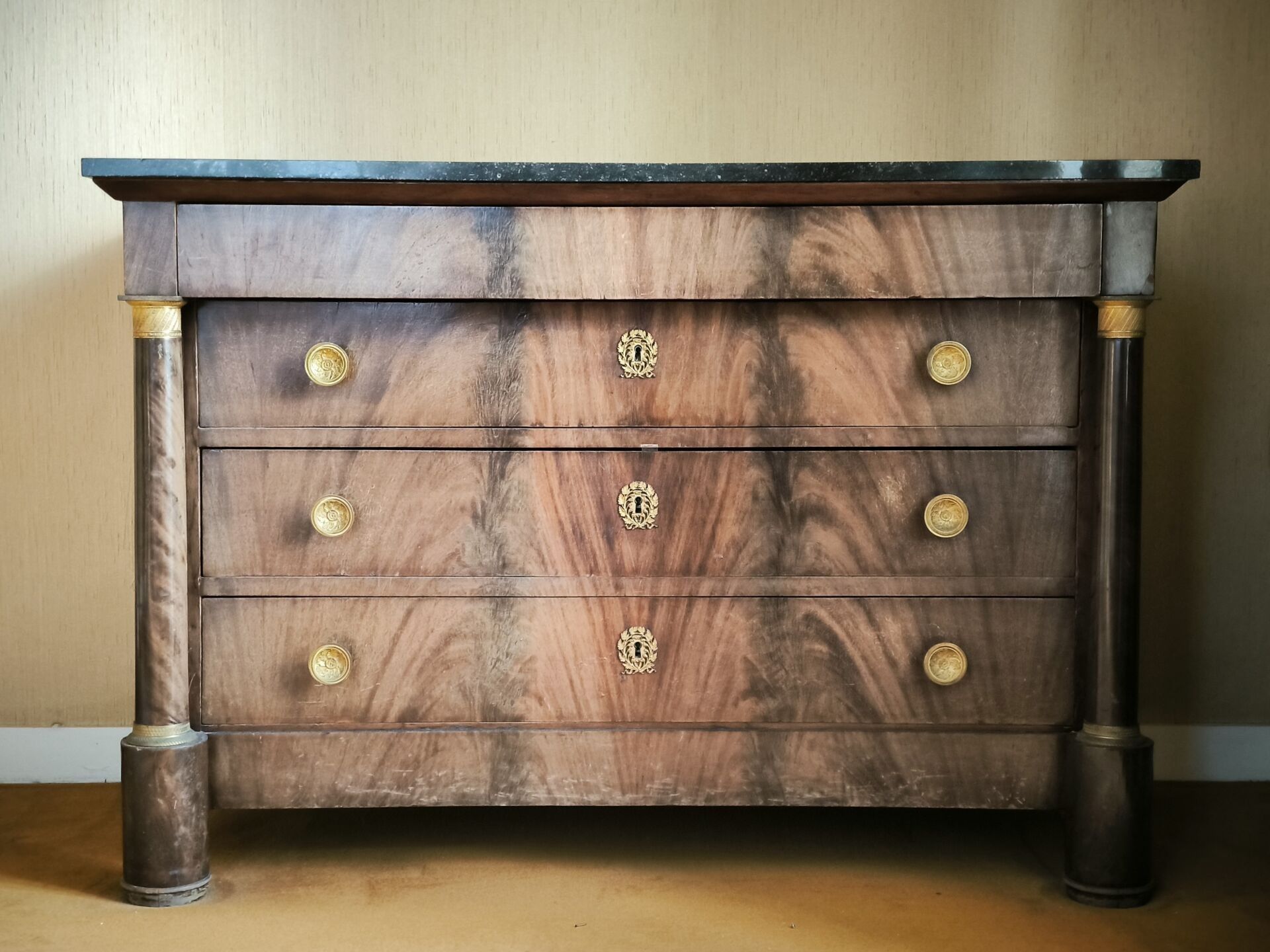 A mahogany and mahogany veneer chest of drawers, opening with 4 drawers, with detached columns, bronze ornaments, marble top. Empire period (wear, damage, insolate) Huat. 89 cm, length 129 cm, depth 61.5 cm
