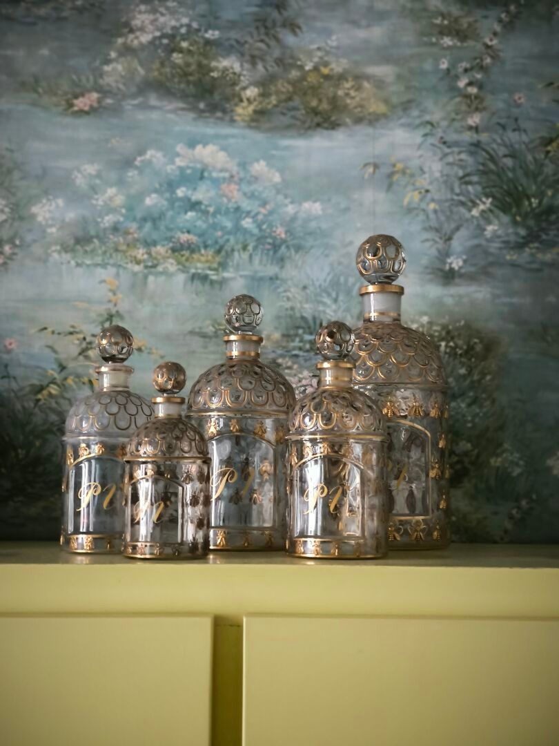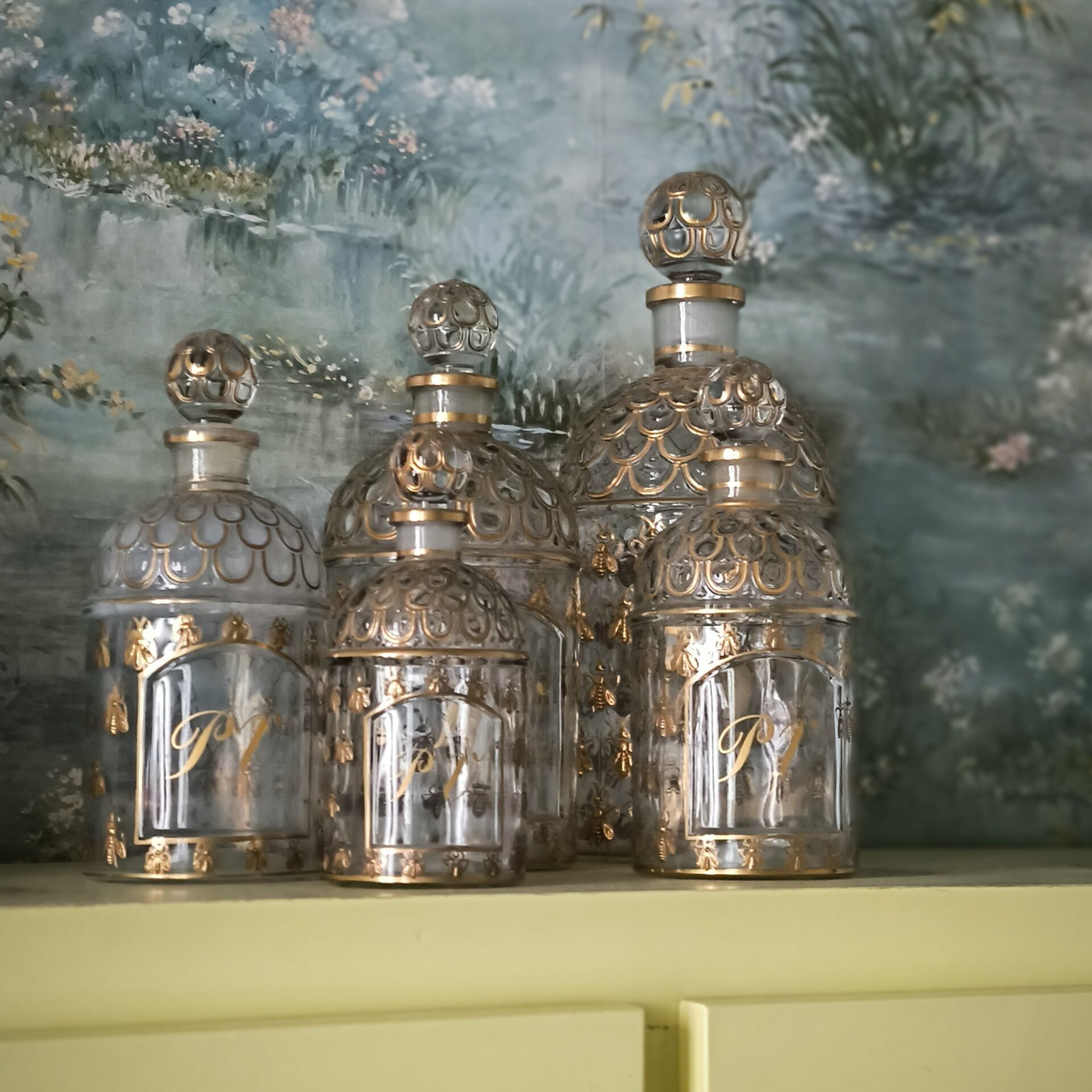 GUERLAIN. Suite of 5 perfume bottles, numbered PV. Height 16 to 30 cm (empty)