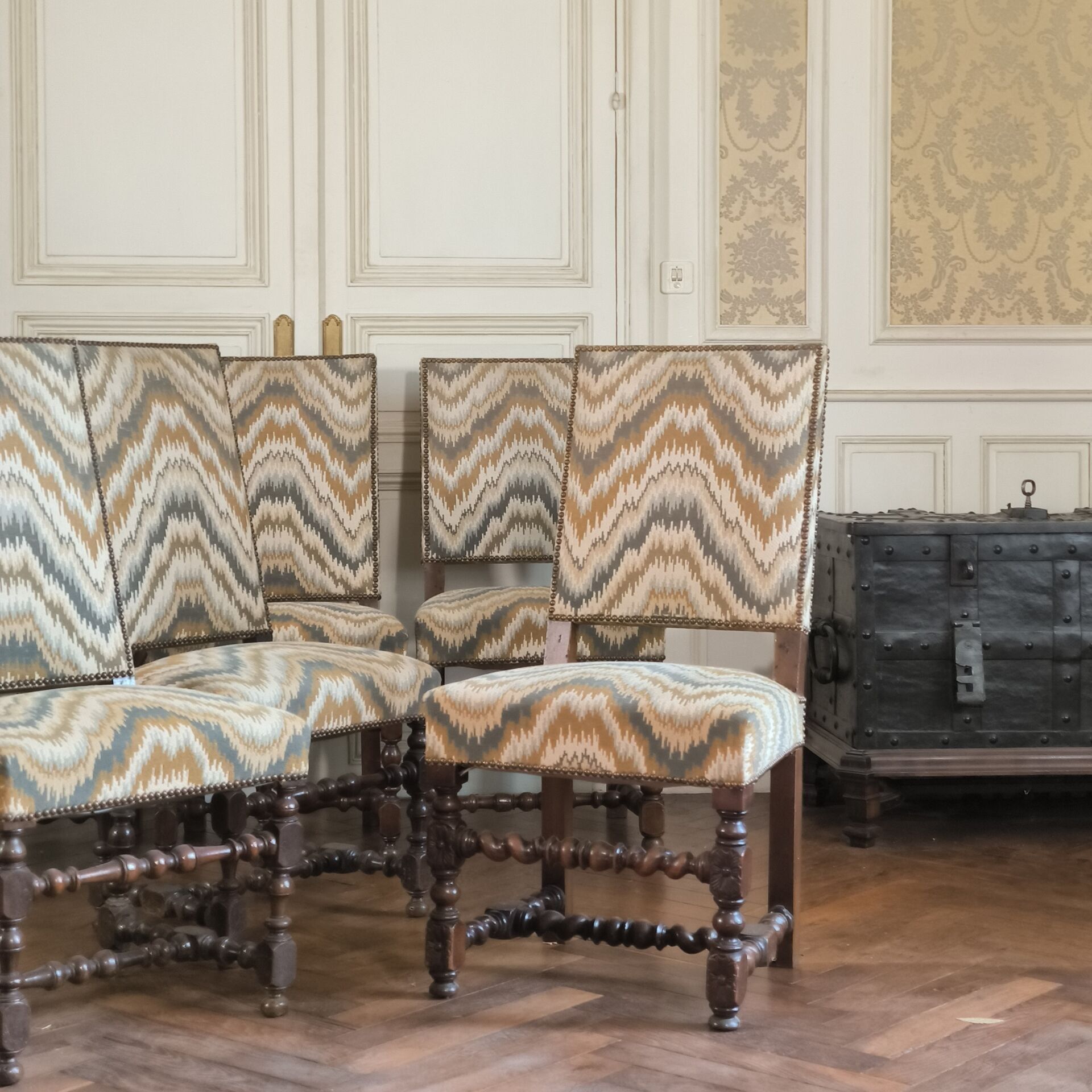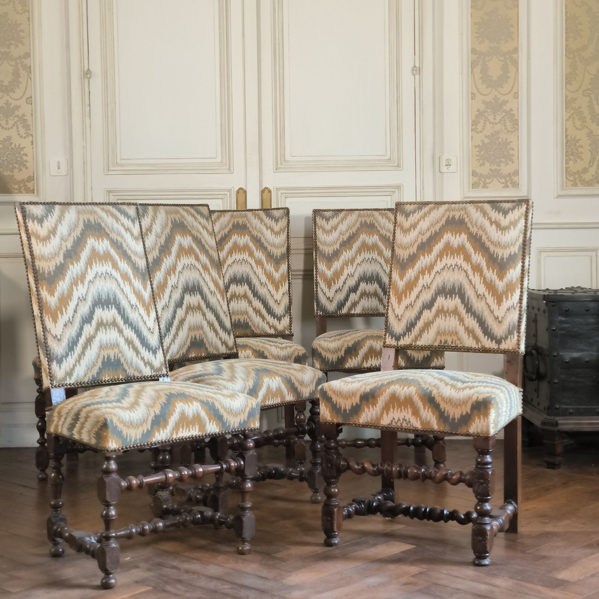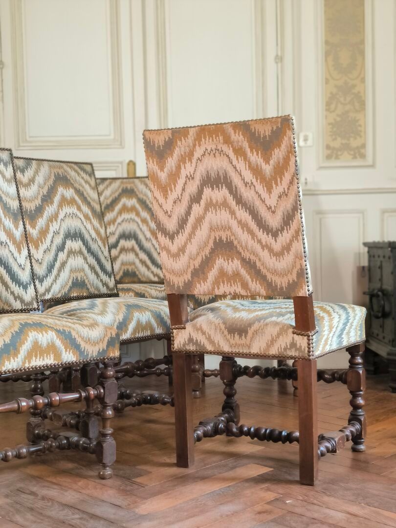 Suite of 6 carved and moulded walnut chairs, upholstered in fabric, partly Louis XIV period. Height: 100 cm