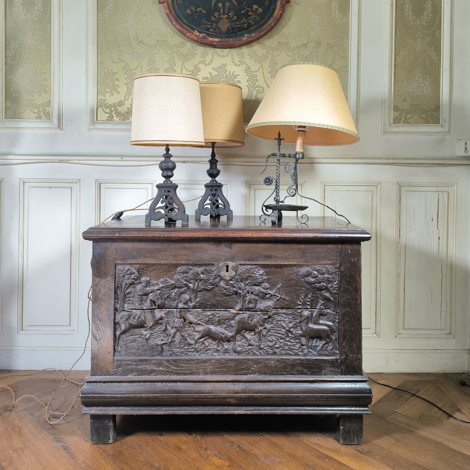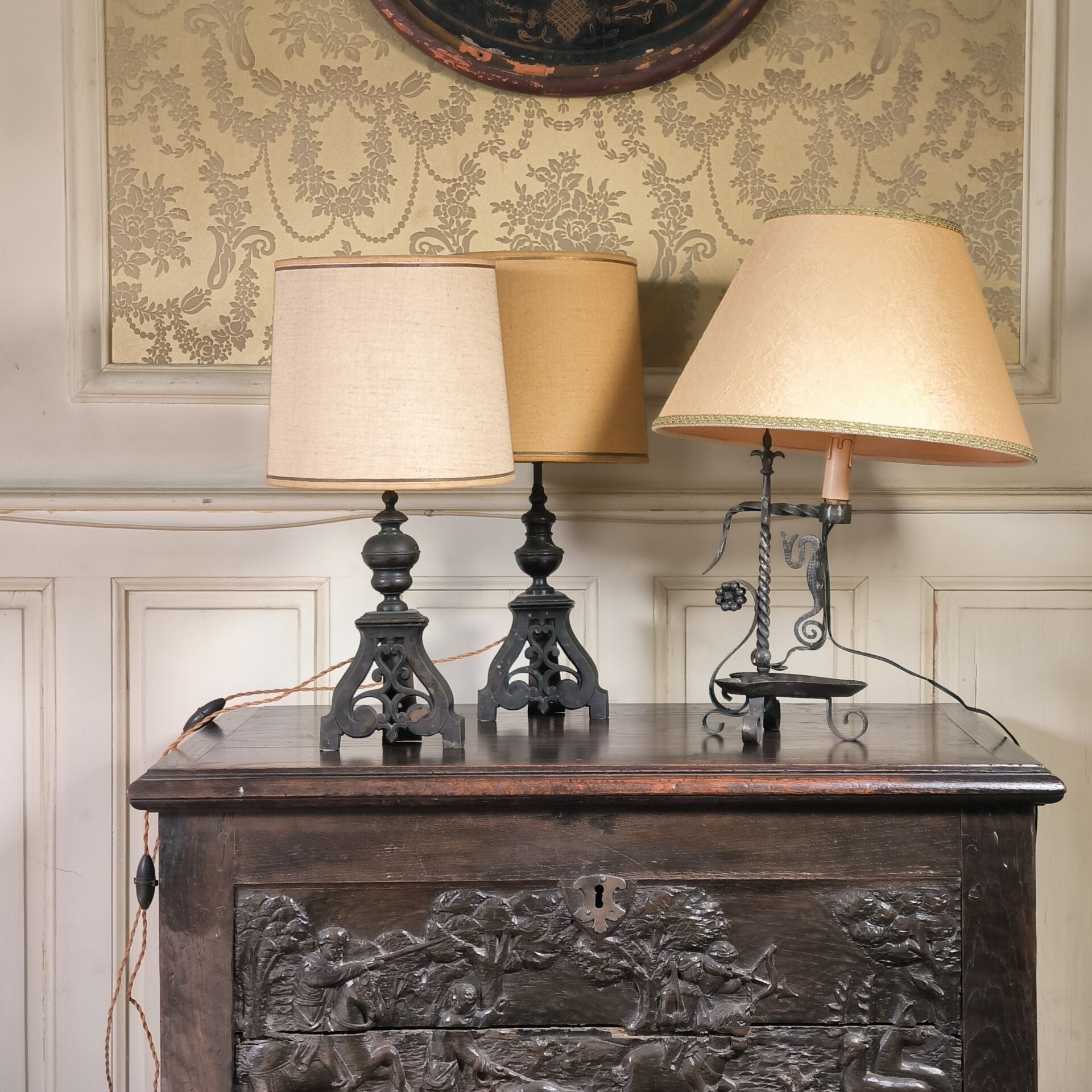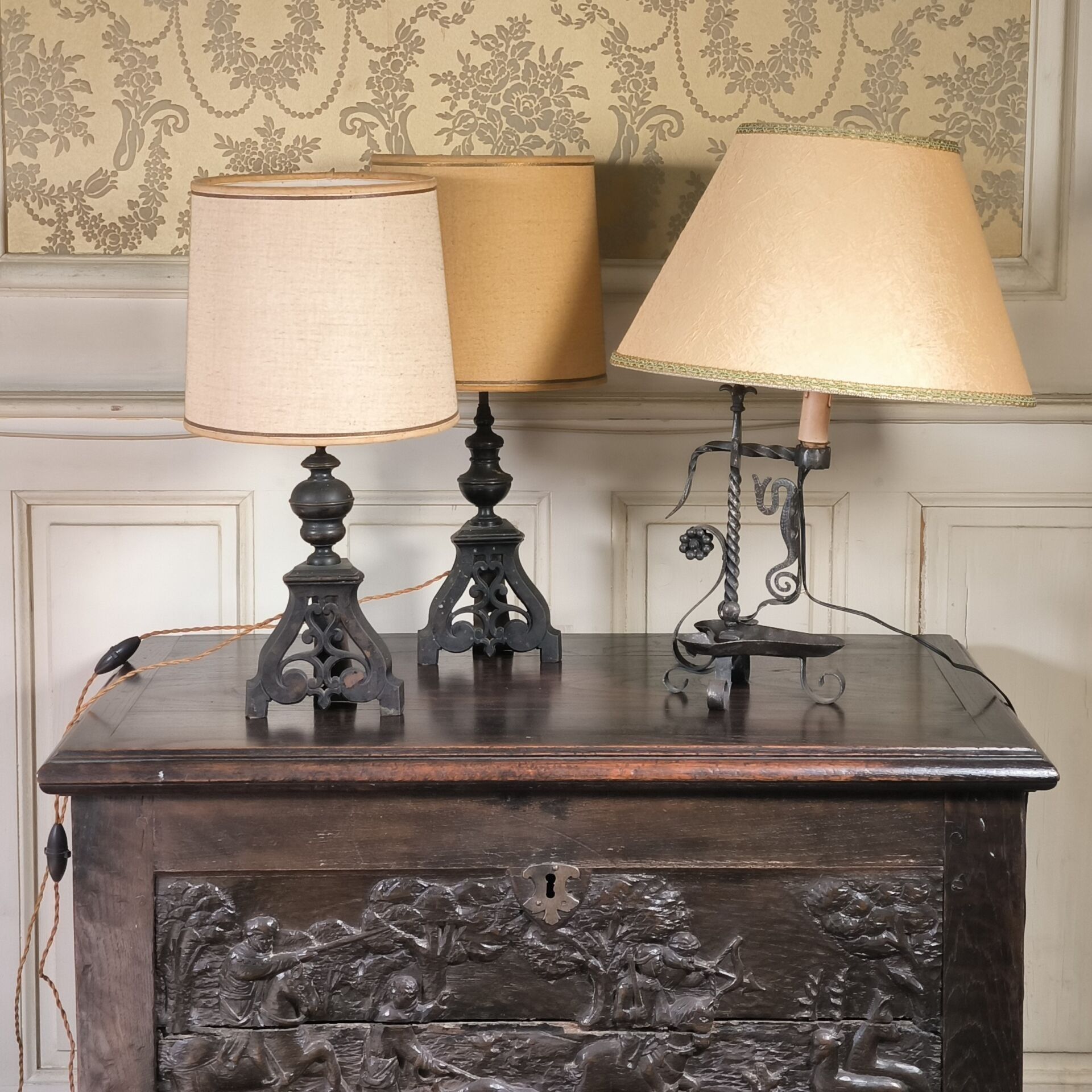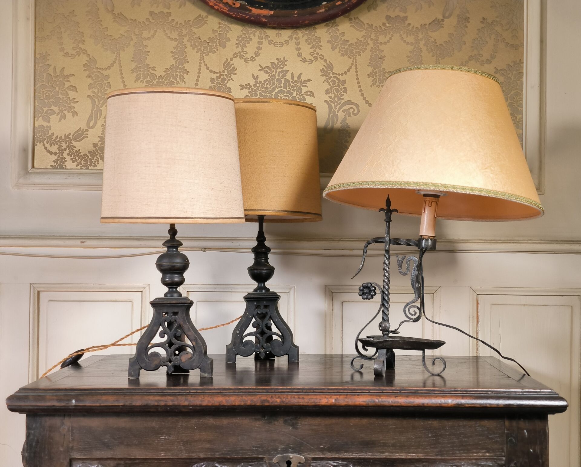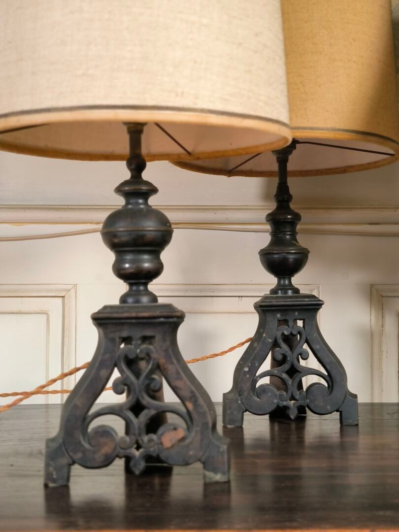 Lot: a pair of bronze torches (andirons reassembled - Height 34 cm) and an iron lamp (Height 35 cm)