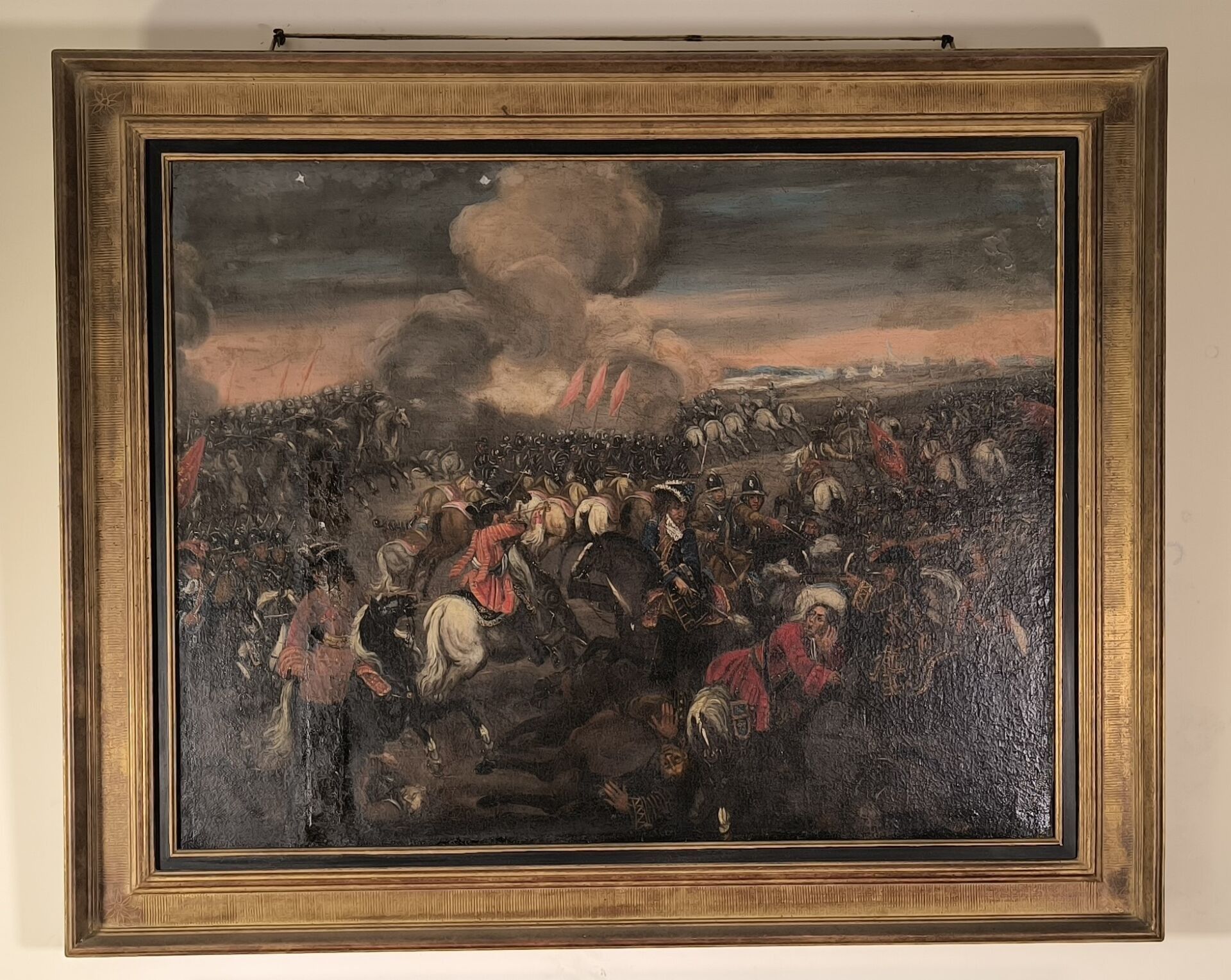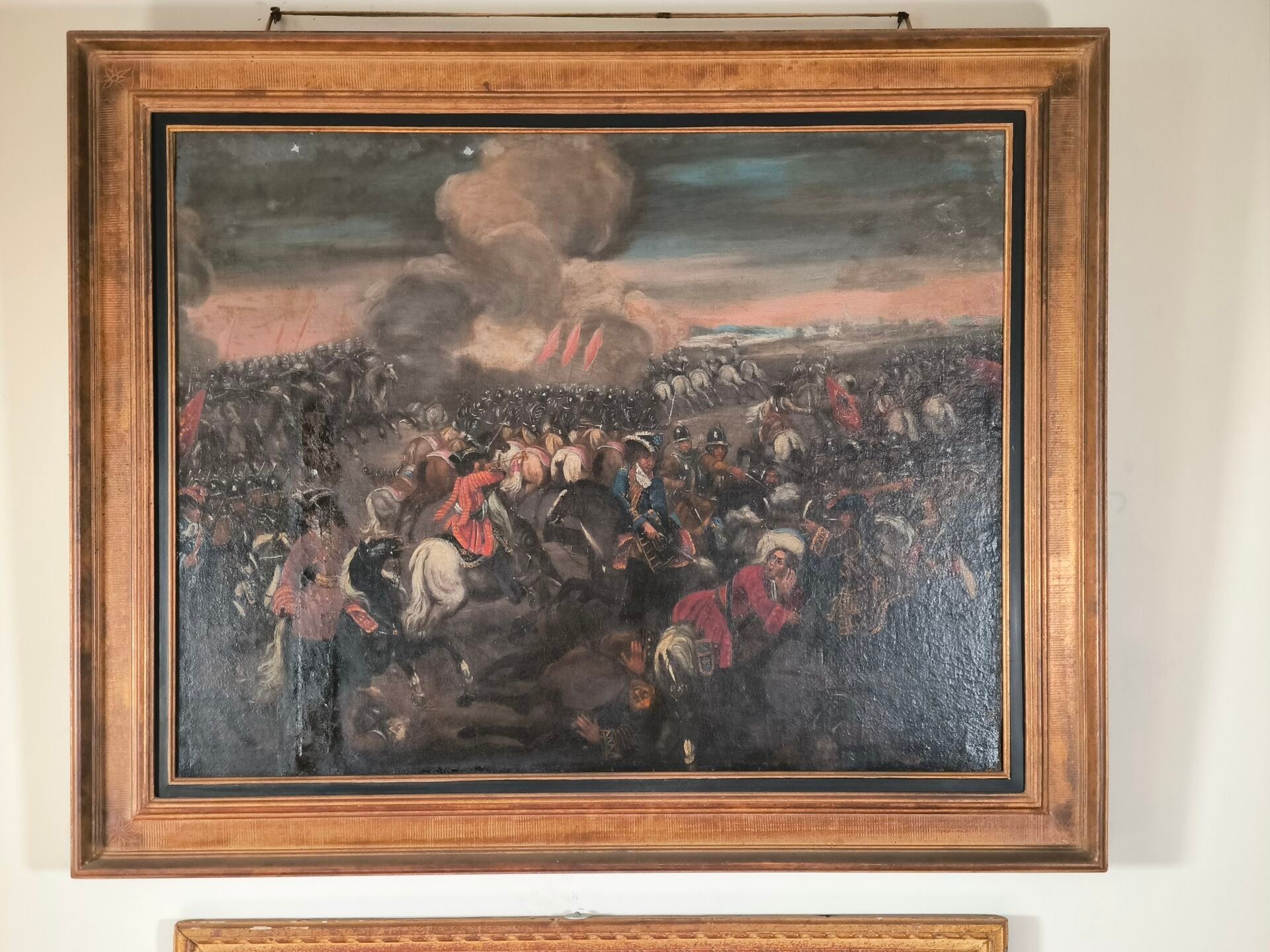 Flemish school of the XVIIth century. Battle scene. Oil on canvas (accidents, missing parts and restorations) 74 x 94 cm. Frame