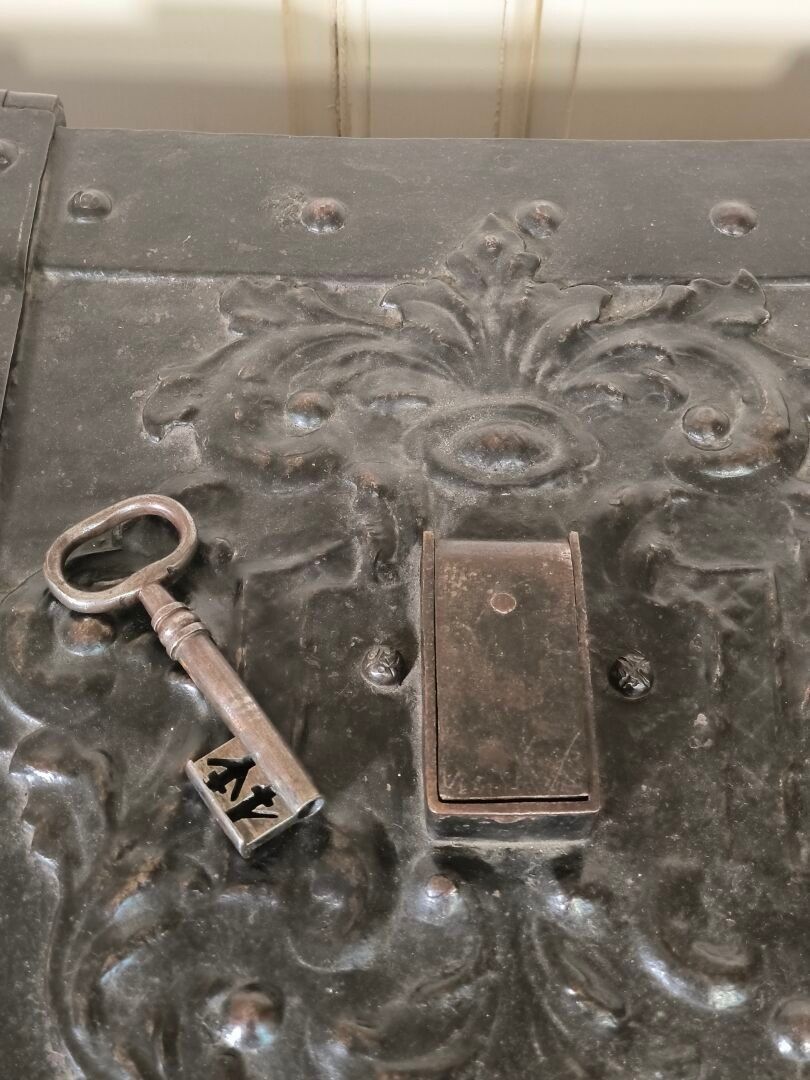 . Iron chest. Southern Germany, 18th century. On a later base Chest: 47 x 90 x 46 cm Base: 40 x 93 x 52 cm