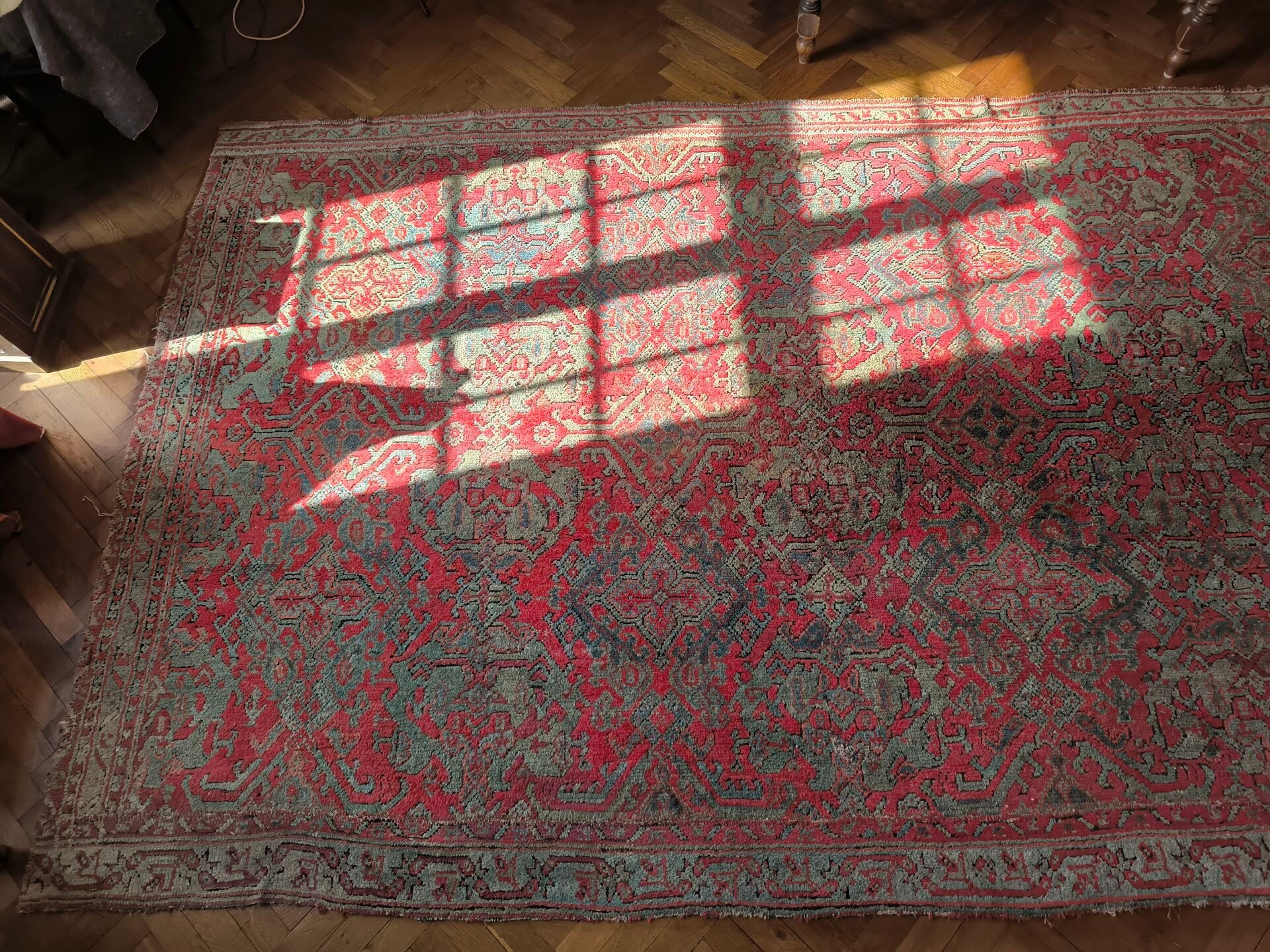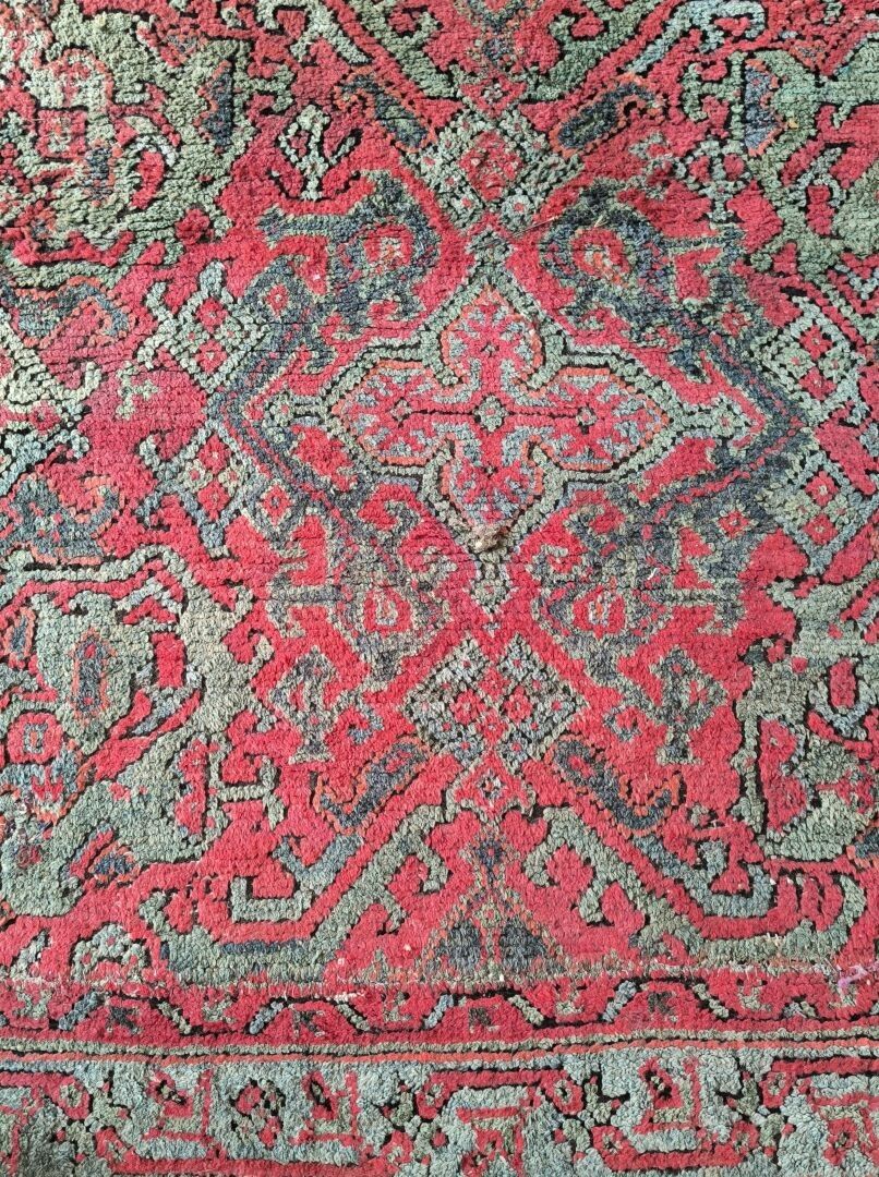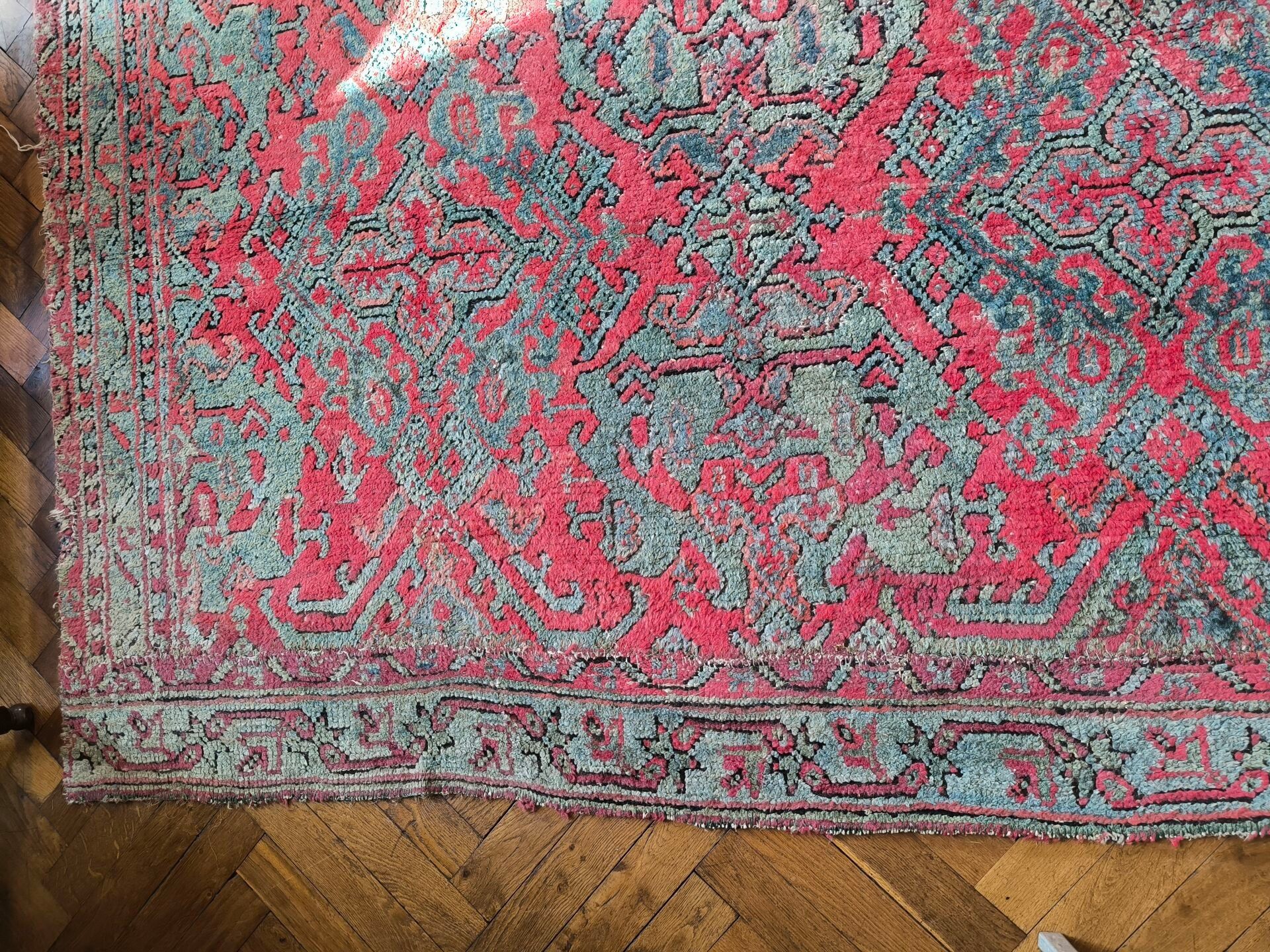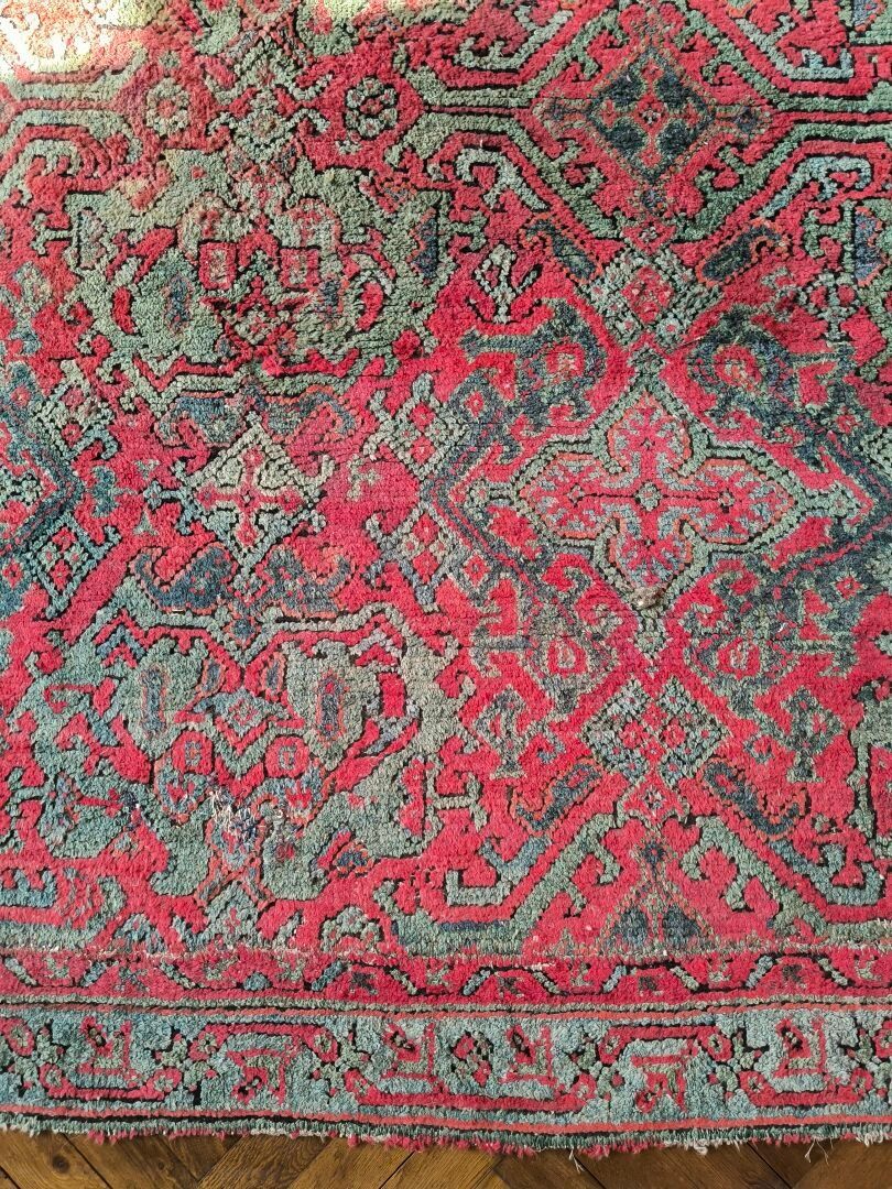 . SMYRNE? Large red carpet (recut - wear). 435 x 462 cm