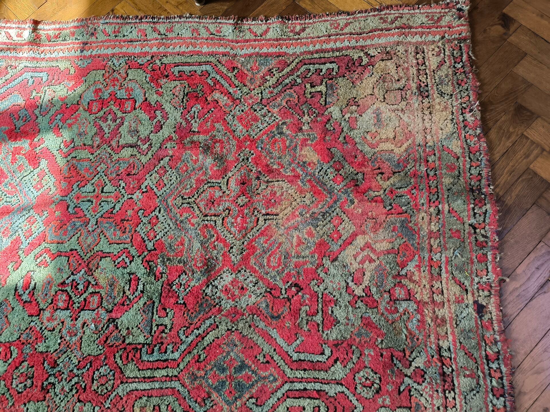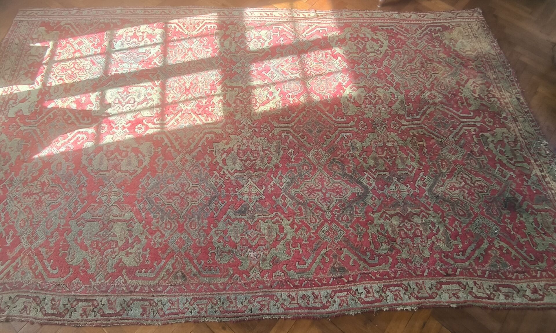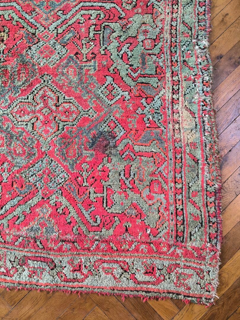 . SMYRNE? Large red carpet (recut - wear). 435 x 462 cm