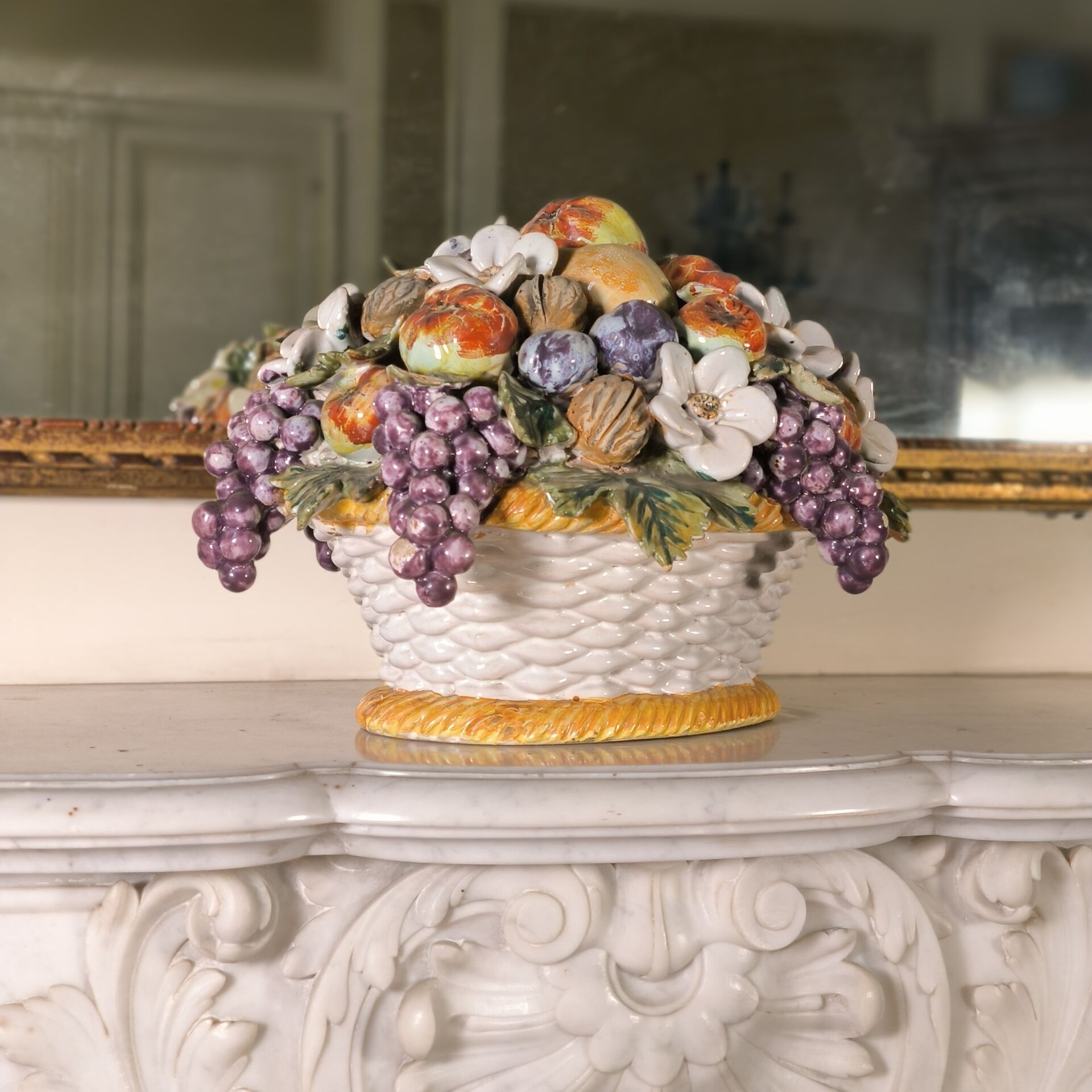 MALICORNE. Polychrome enamelled earthenware basket of flowers and fruit. (small chips and acc.) Height 24 cm, length 33 cm, width 24 cm