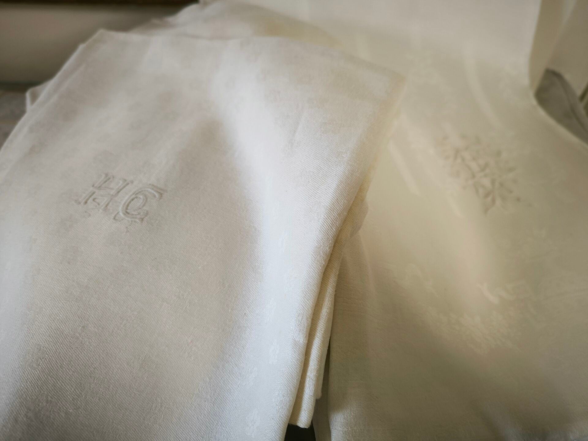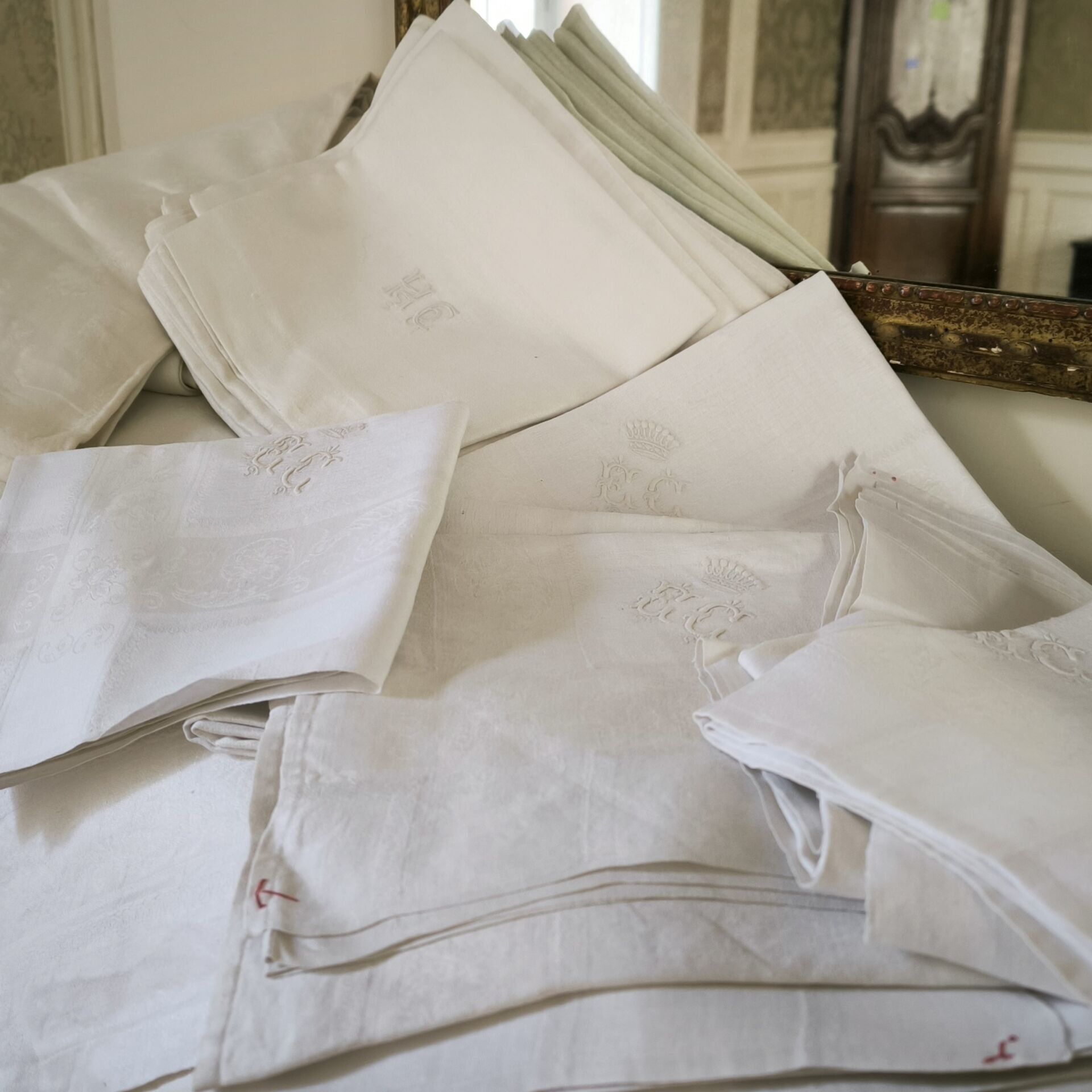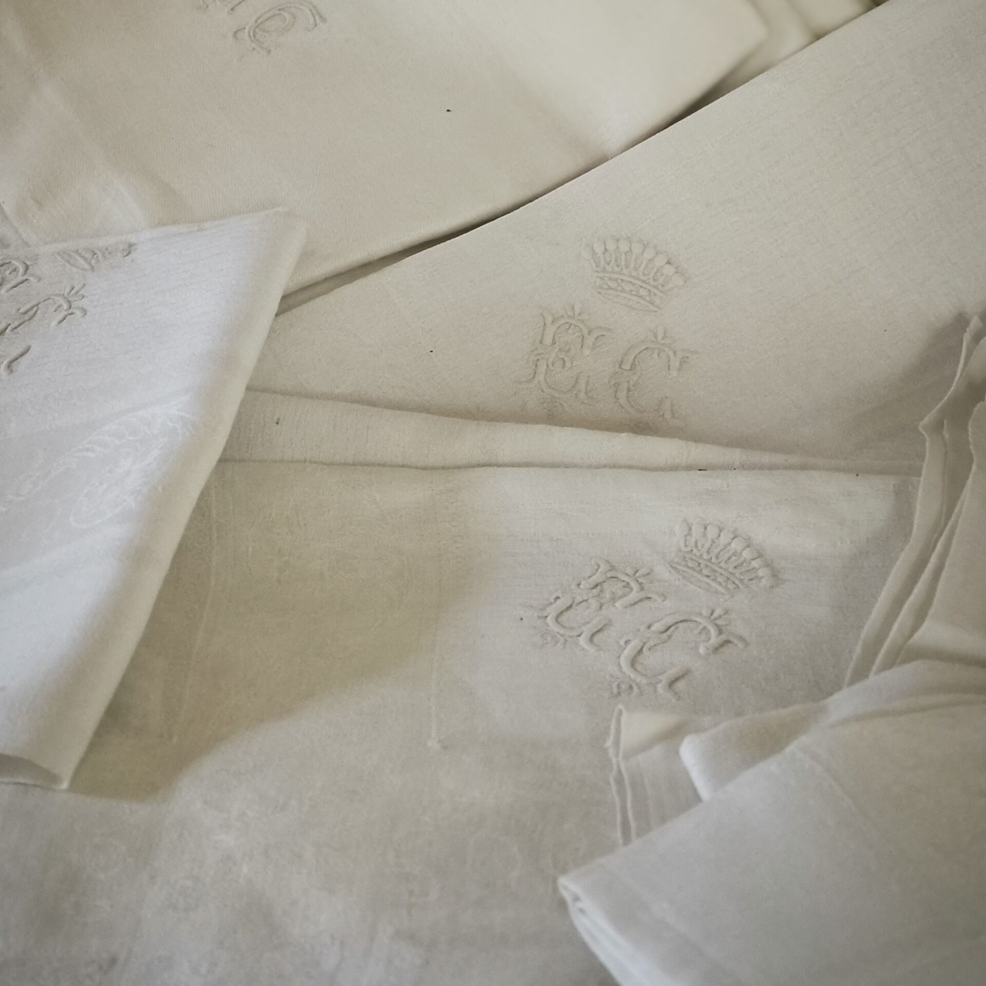 Important set of household linen (minor wear and stains): embroidered and figured tablecloths and napkins, some figured GC surmounted by a count's crown