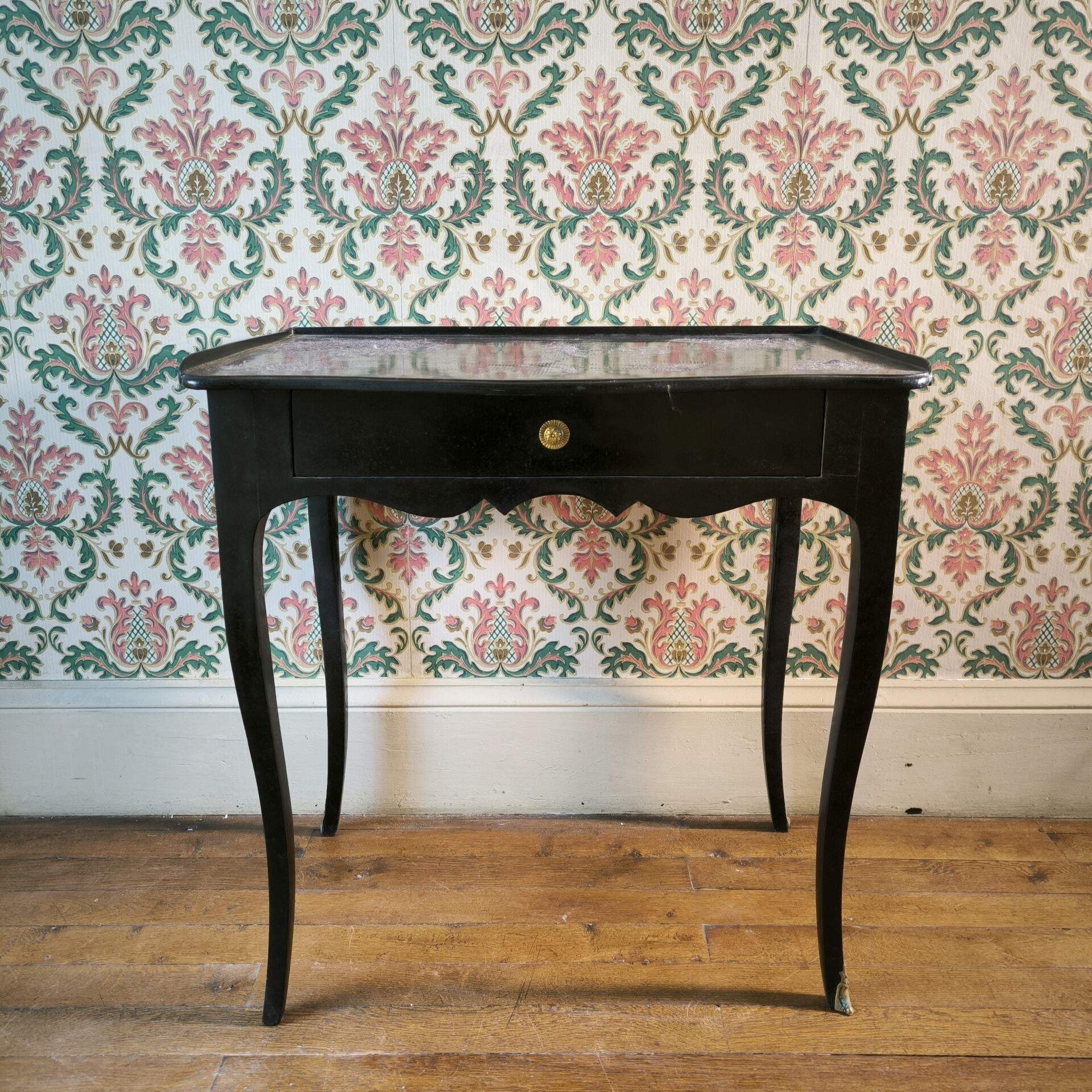 Small desk in blackened wood, one drawer in the belt, bronze ornaments. Partly 19th century (minor wear) Height 74 cm, length 74 cm, width 47 cm.