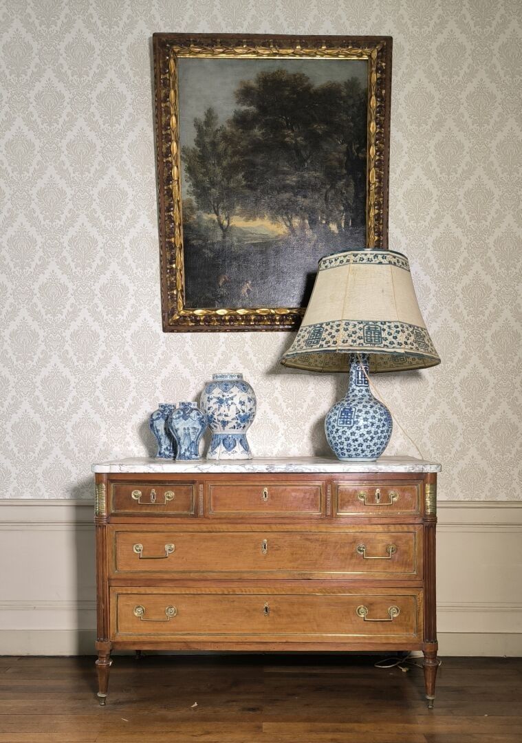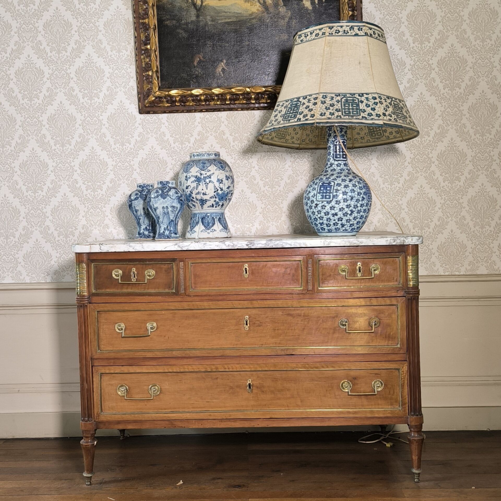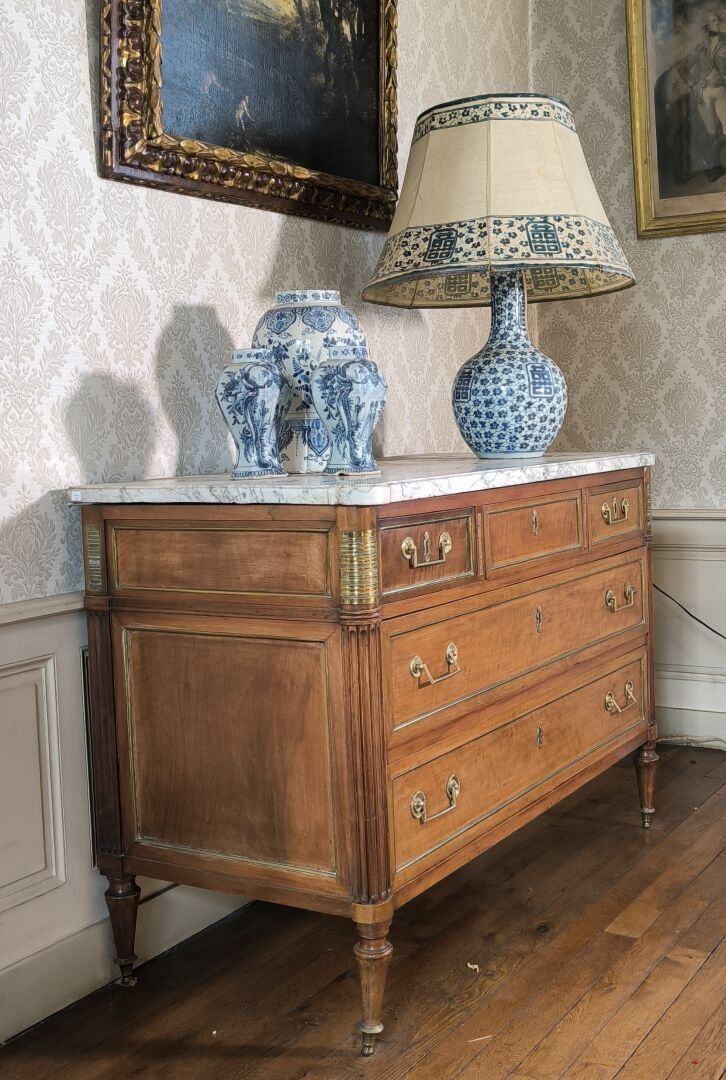 Chest of drawers in fruitwood, opening with 5 drawers on 3 levels, marble top. Louis XVI period (missing, slightly oiled, minor wear). 90 cm high, 126 cm long, 63.5 cm deep.