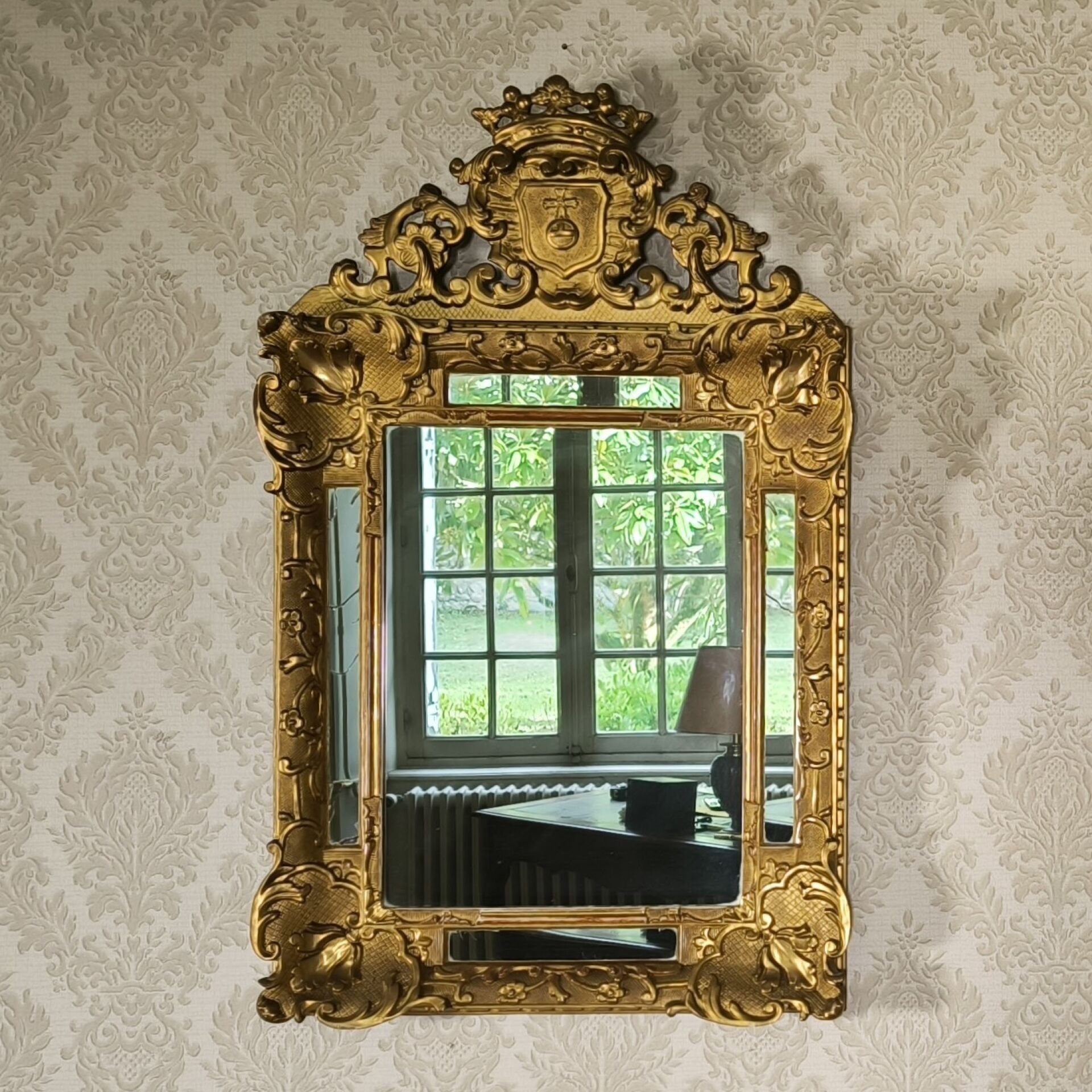 Small Louis XV style gilded wood mirror with pediment and glazing beads, decorated with a coat of arms surmounted by a crown.