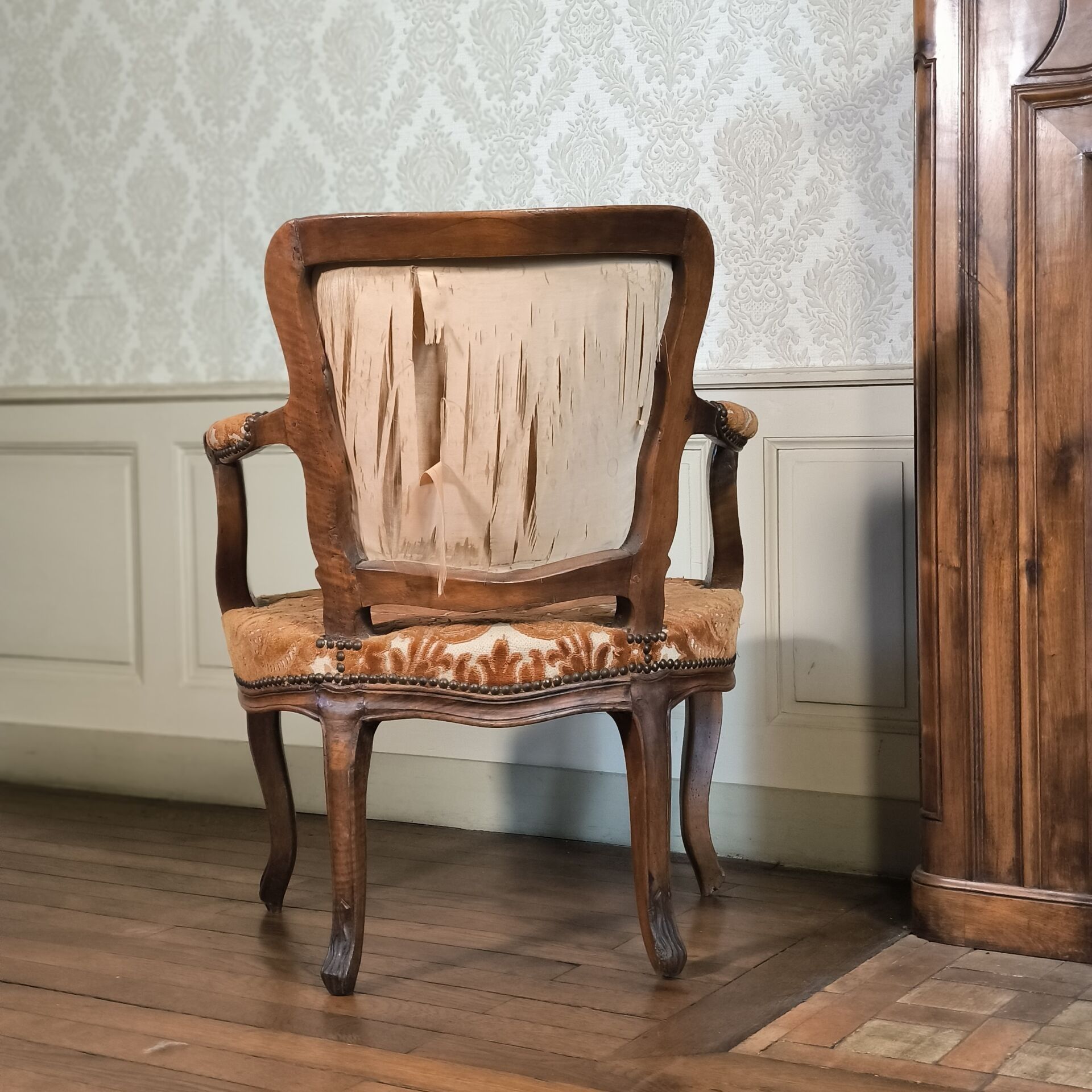 Armchair in natural wood, cambered legs, upholstery in fabric, Louis XV period (wear) Height 83.5 cm