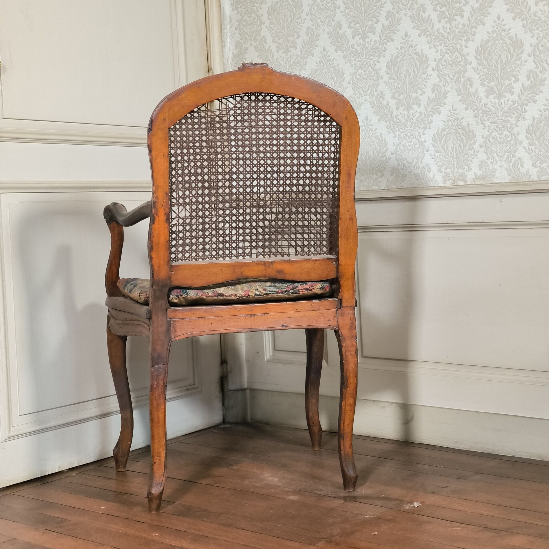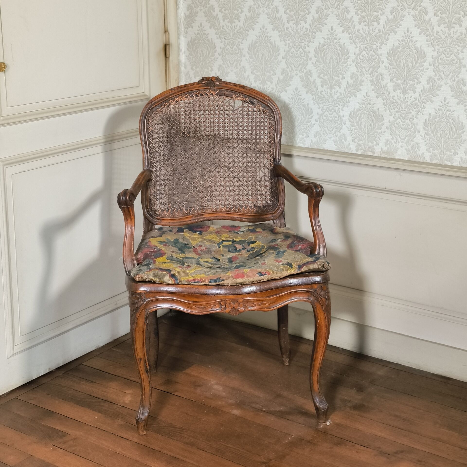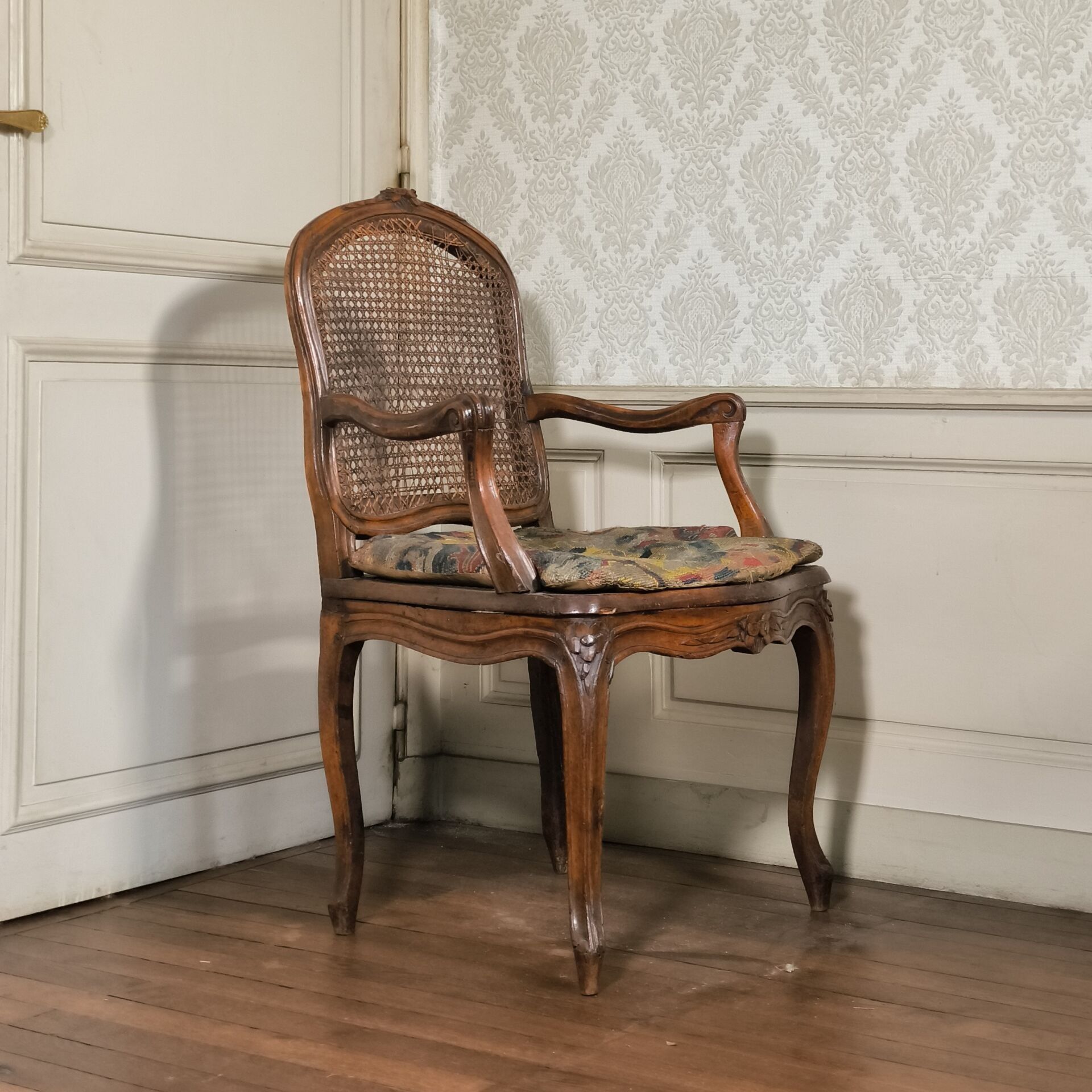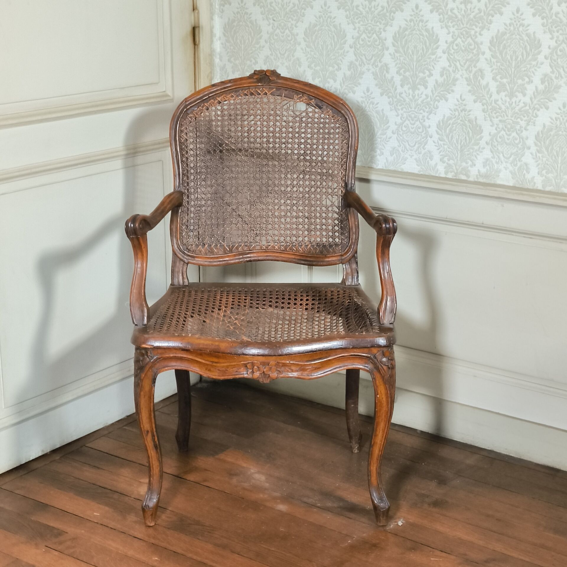 Cabriolet armchair in moulded natural wood, caned back and seat. Louis XV period. Height 94.5 cm