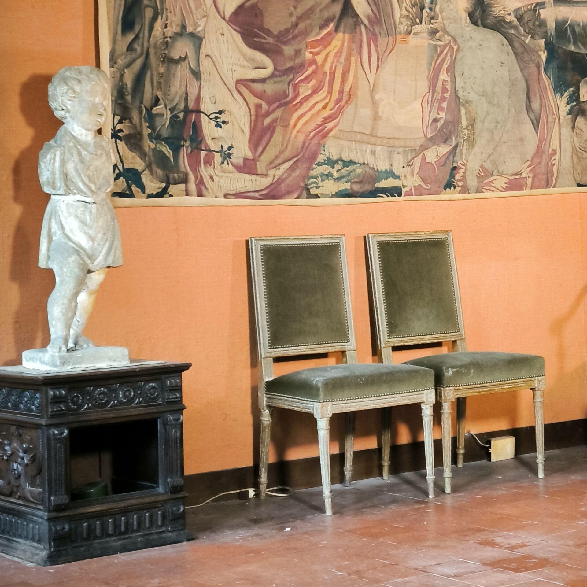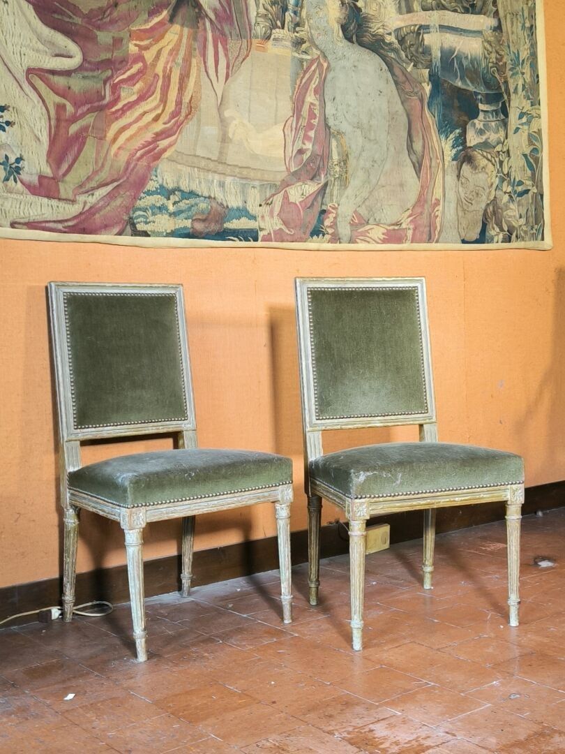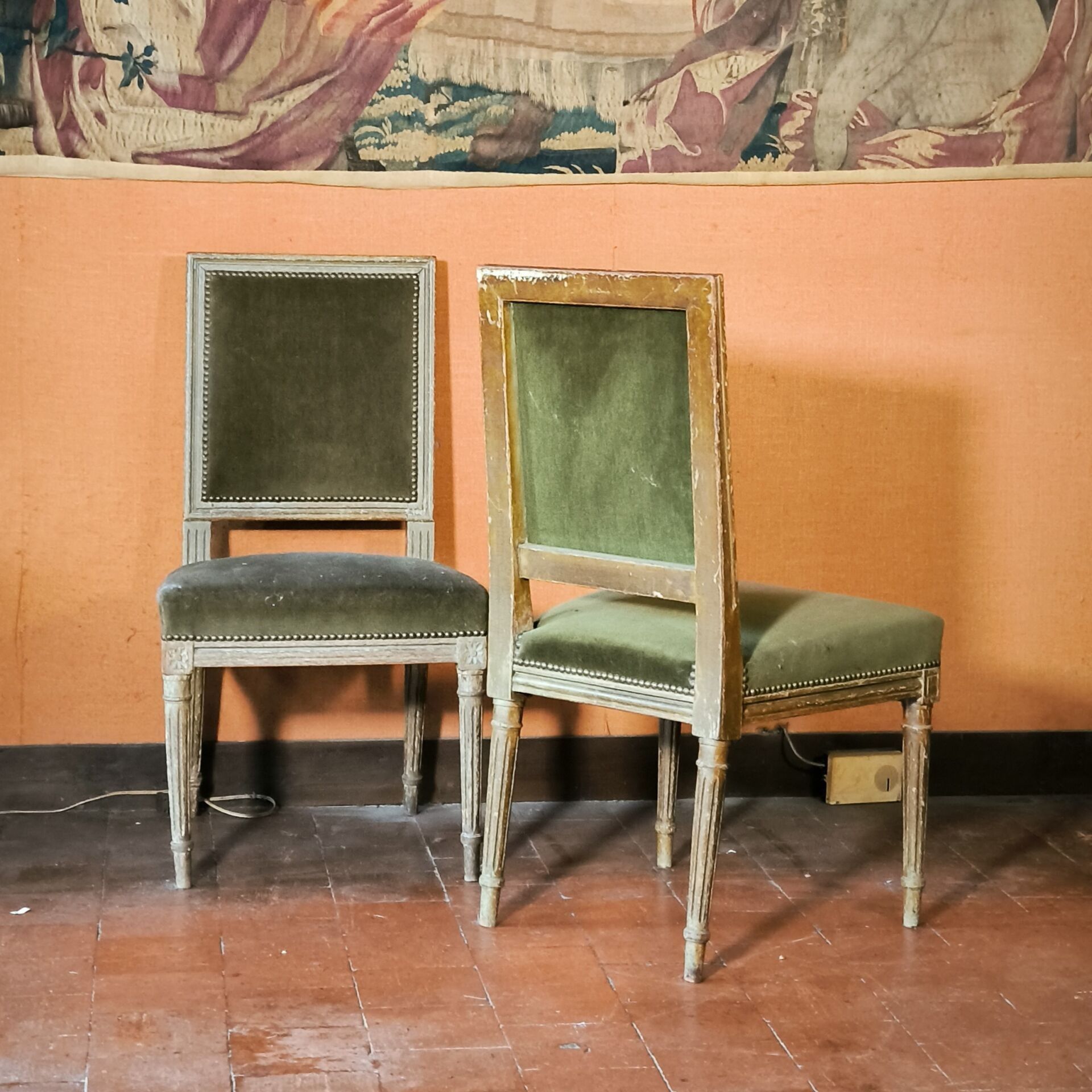 Pair of wooden chairs, green velvet upholstery, Louis XVI style (small accidents) Height 81.5 cm