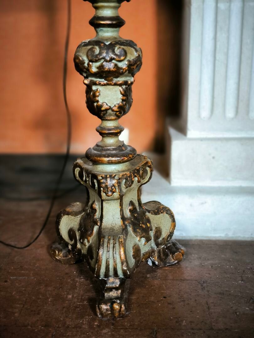 Pique-cierge in repainted and gilded wood, 18th C. (minor damage and missing parts) Height 119 cm
