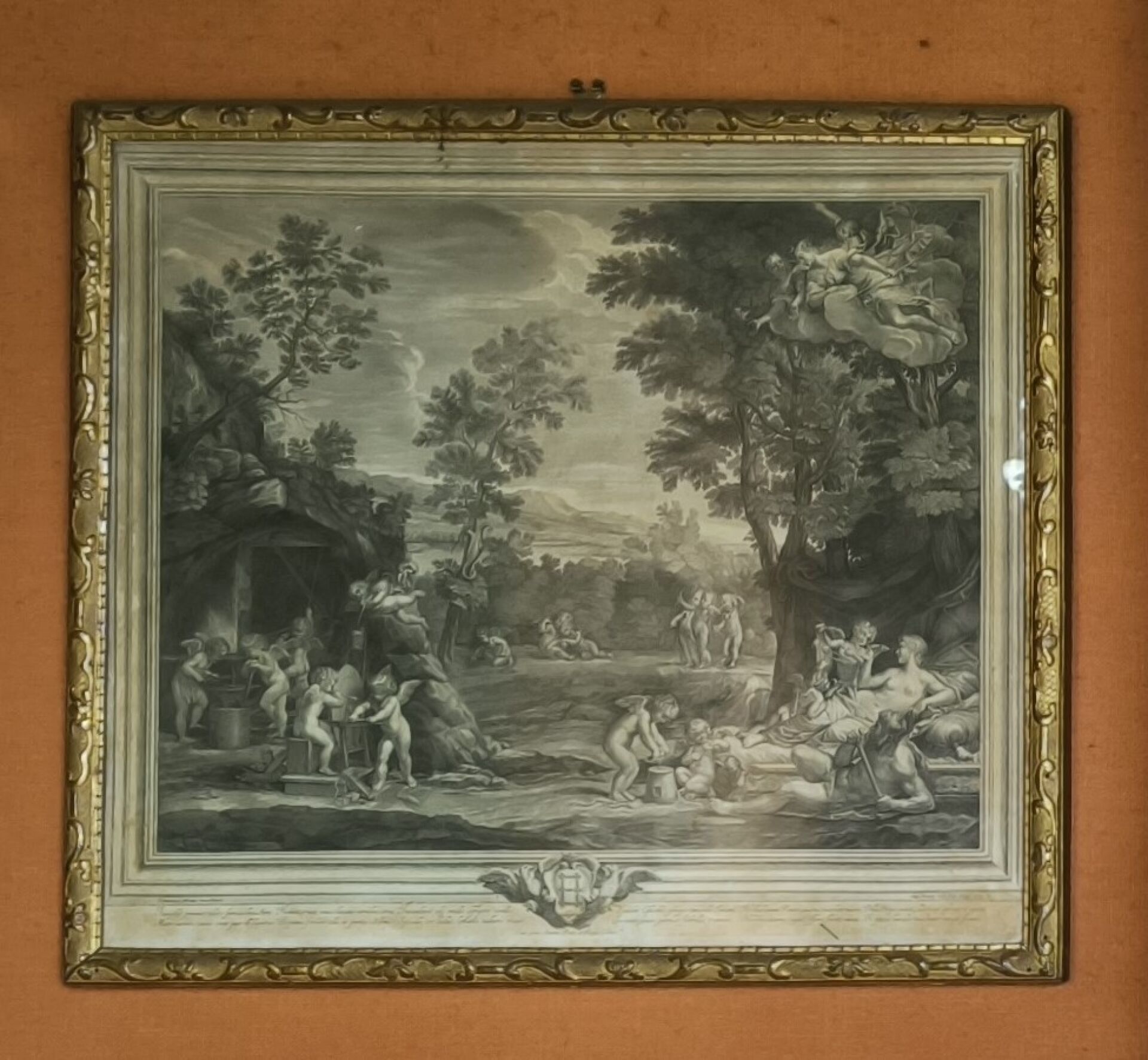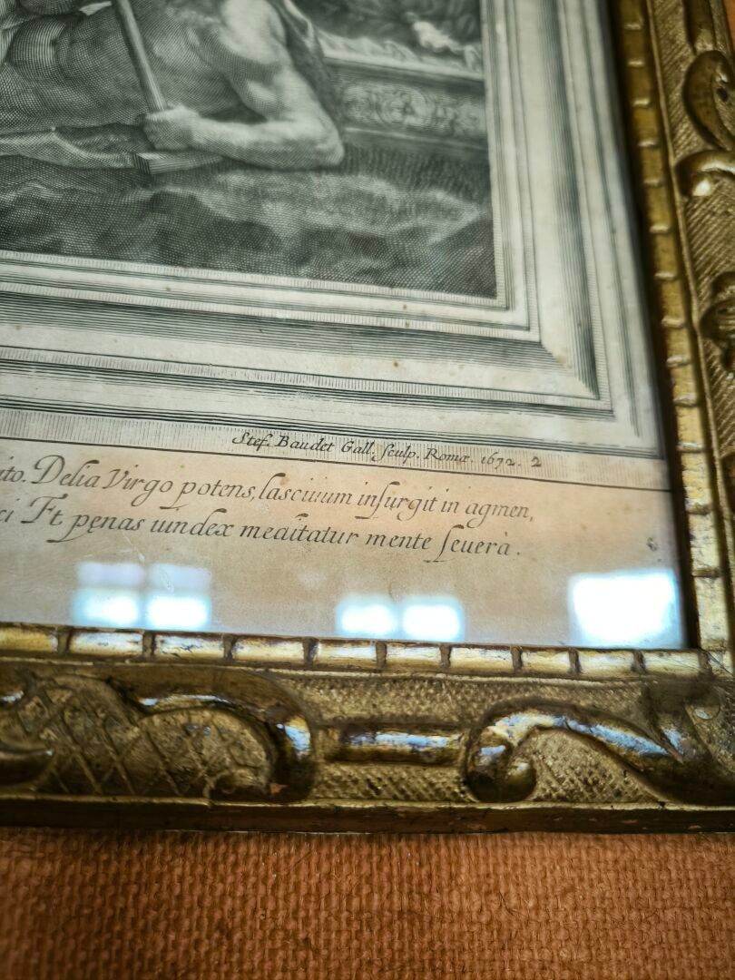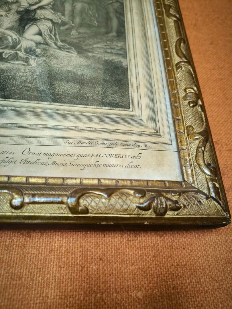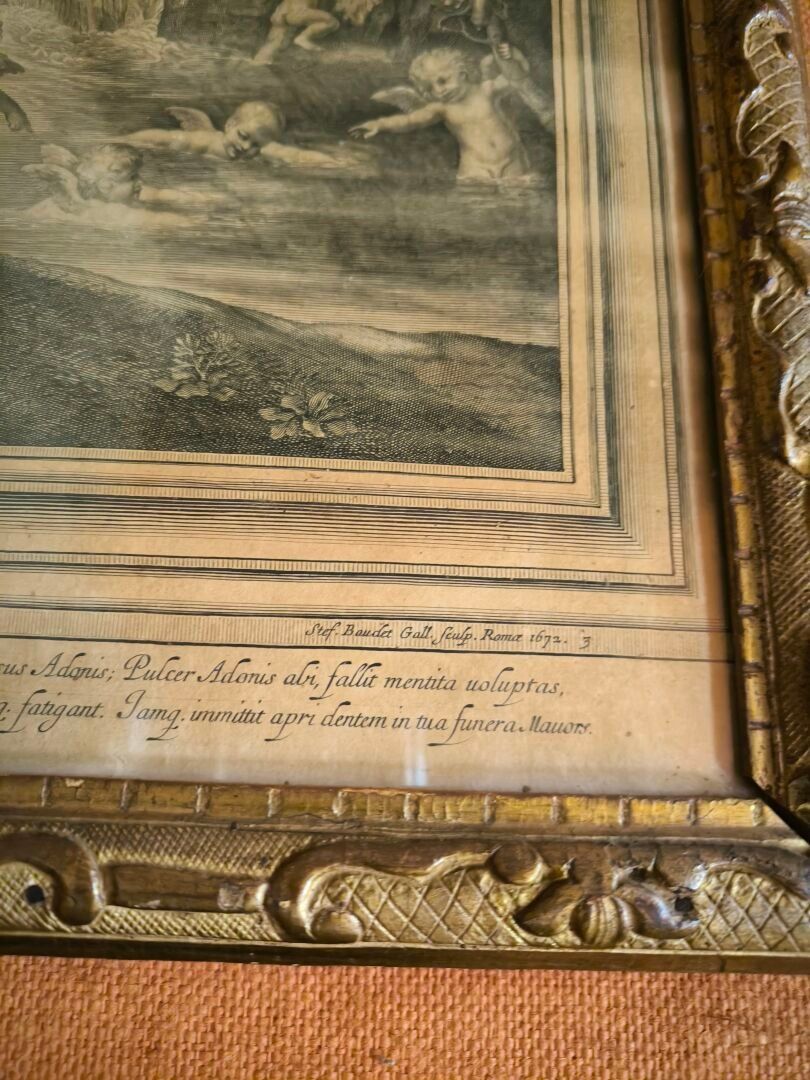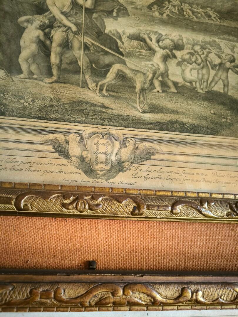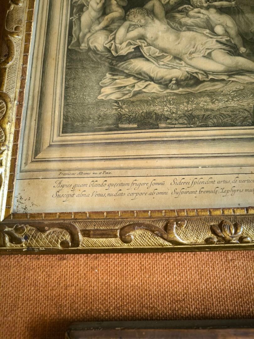 L'ALBANE (after). Set of 4 engravings: La toilette de Vénus, Vénus et Adonis , Les nymphes désarmant l'Amour, Les Amours fabriquant leurs armes. Small stains. 59 x 66 cm, 60 x 65,5 cm, 59 x 66 cm, 59,5 x 66 cm (view). Gilded frames