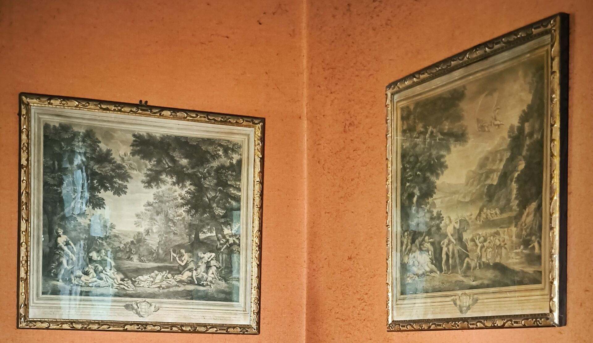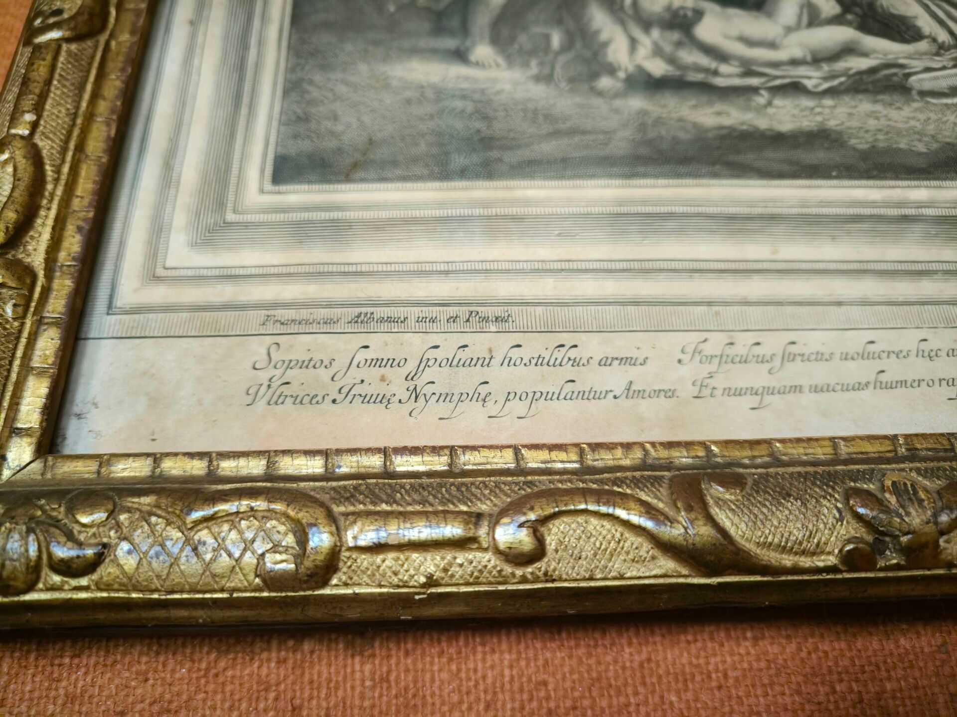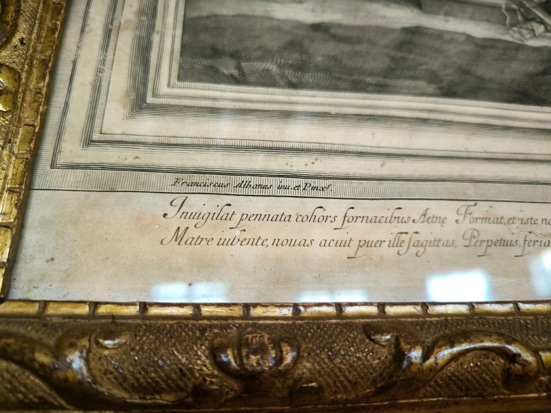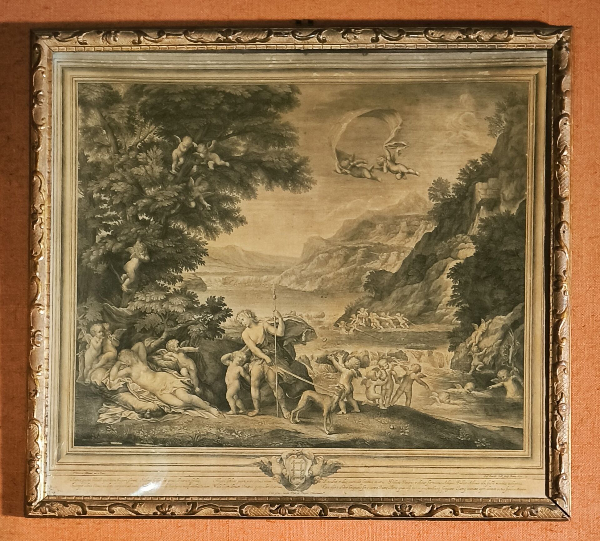 L'ALBANE (after). Set of 4 engravings: La toilette de Vénus, Vénus et Adonis , Les nymphes désarmant l'Amour, Les Amours fabriquant leurs armes. Small stains. 59 x 66 cm, 60 x 65,5 cm, 59 x 66 cm, 59,5 x 66 cm (view). Gilded frames