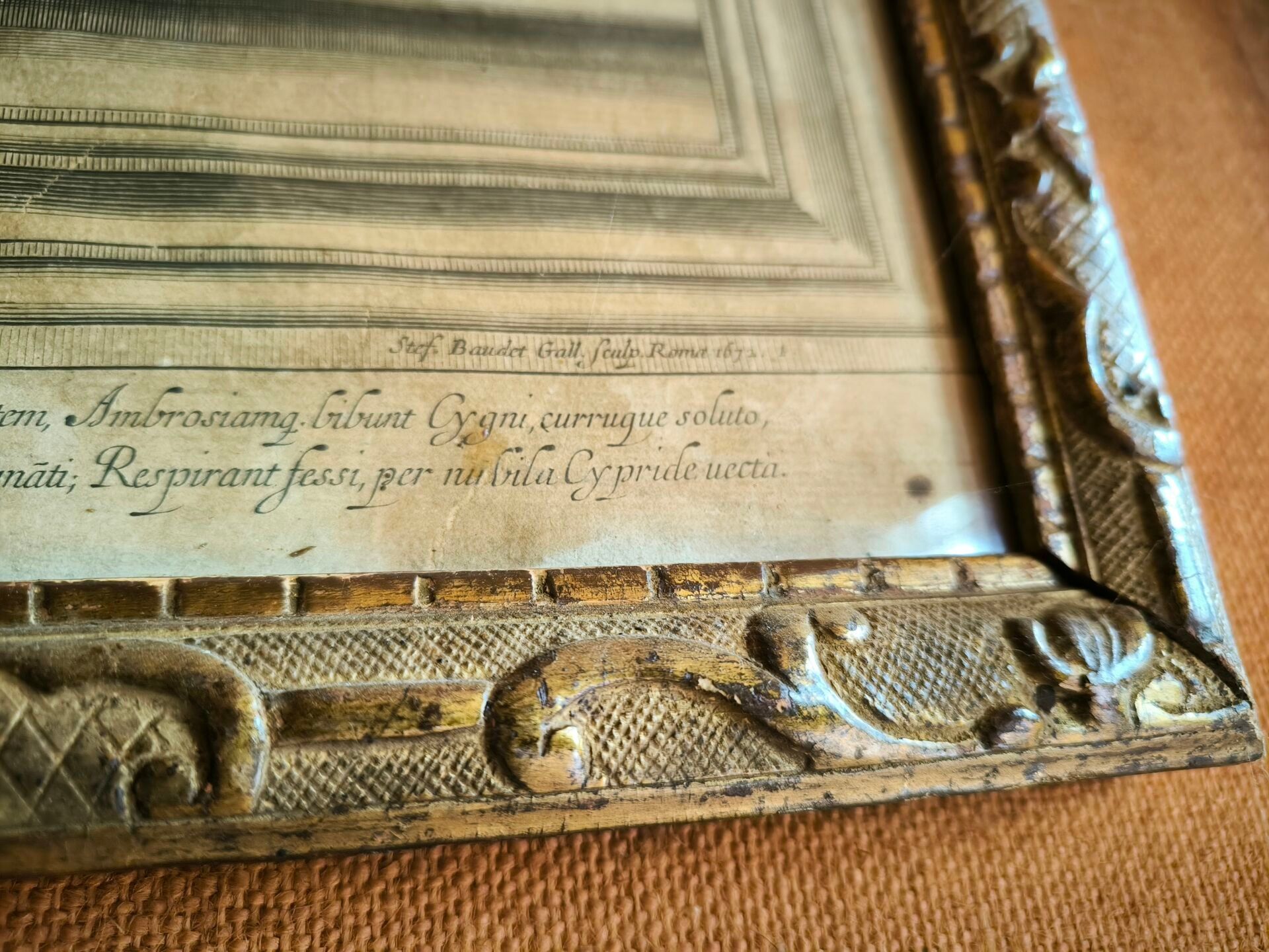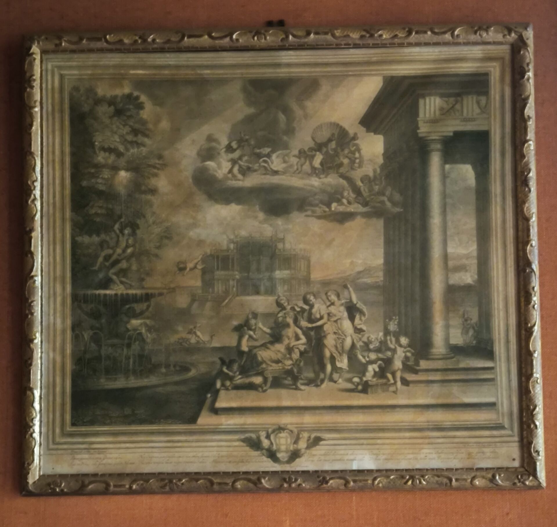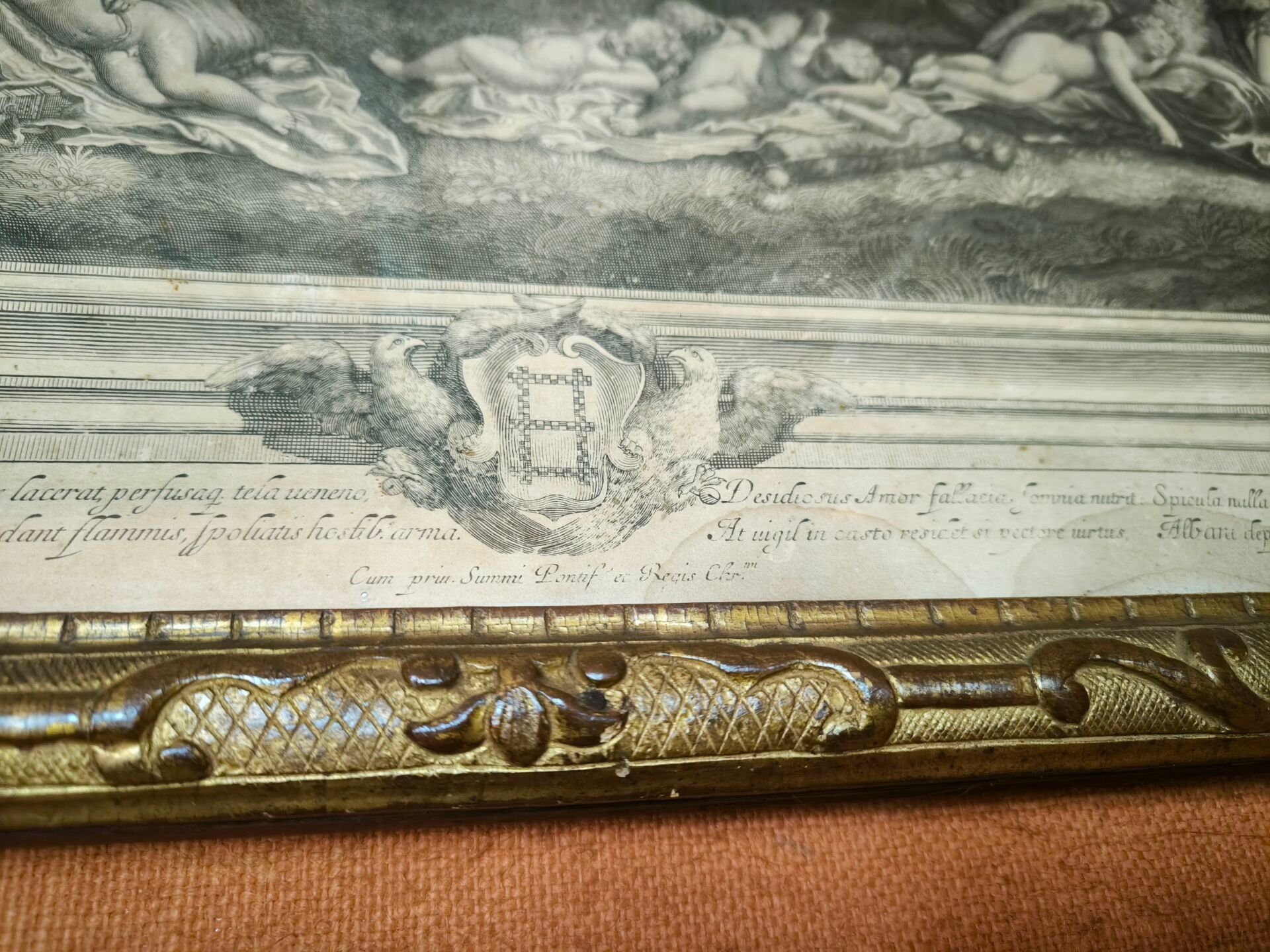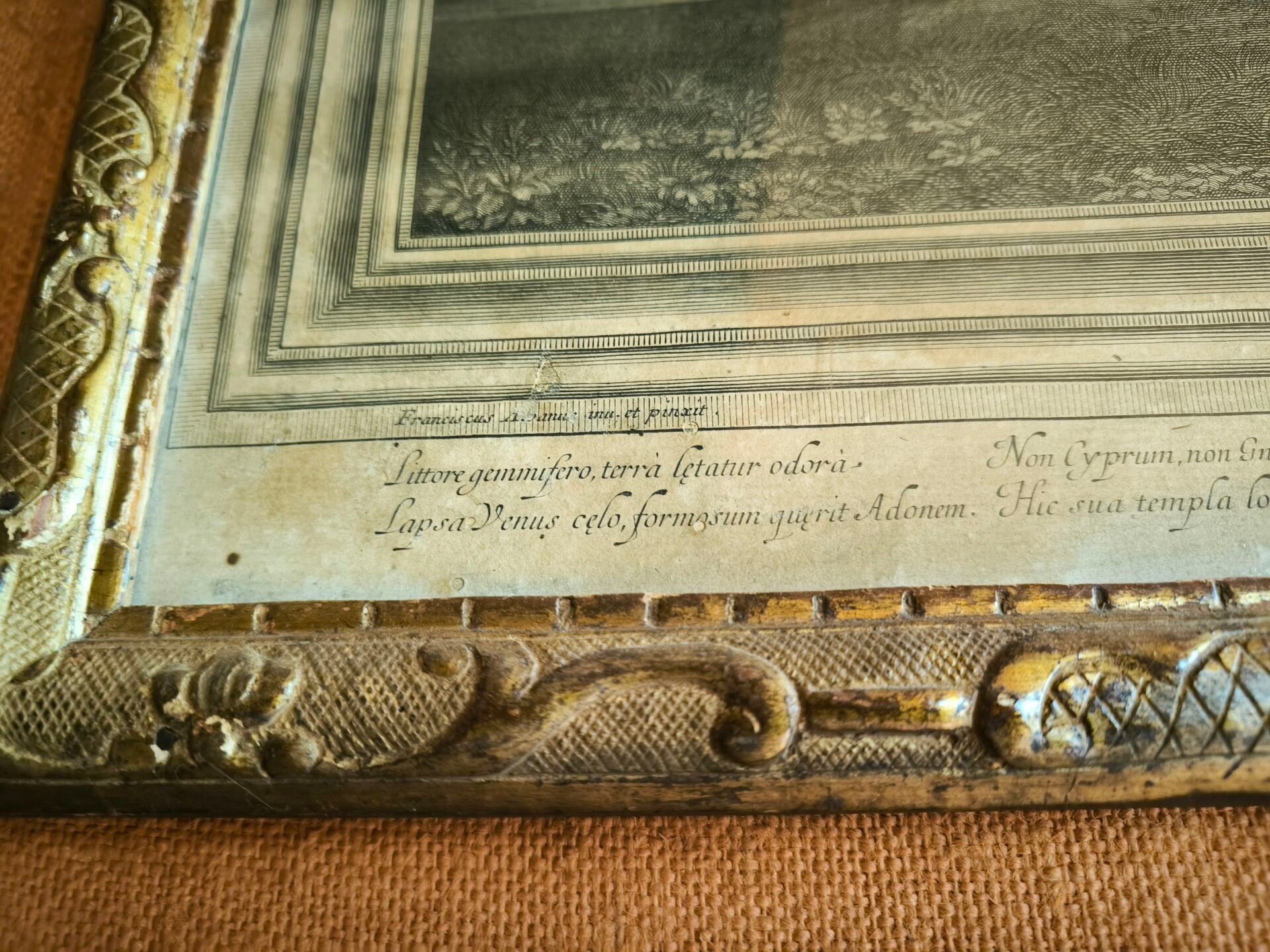 L'ALBANE (after). Set of 4 engravings: La toilette de Vénus, Vénus et Adonis , Les nymphes désarmant l'Amour, Les Amours fabriquant leurs armes. Small stains. 59 x 66 cm, 60 x 65,5 cm, 59 x 66 cm, 59,5 x 66 cm (view). Gilded frames