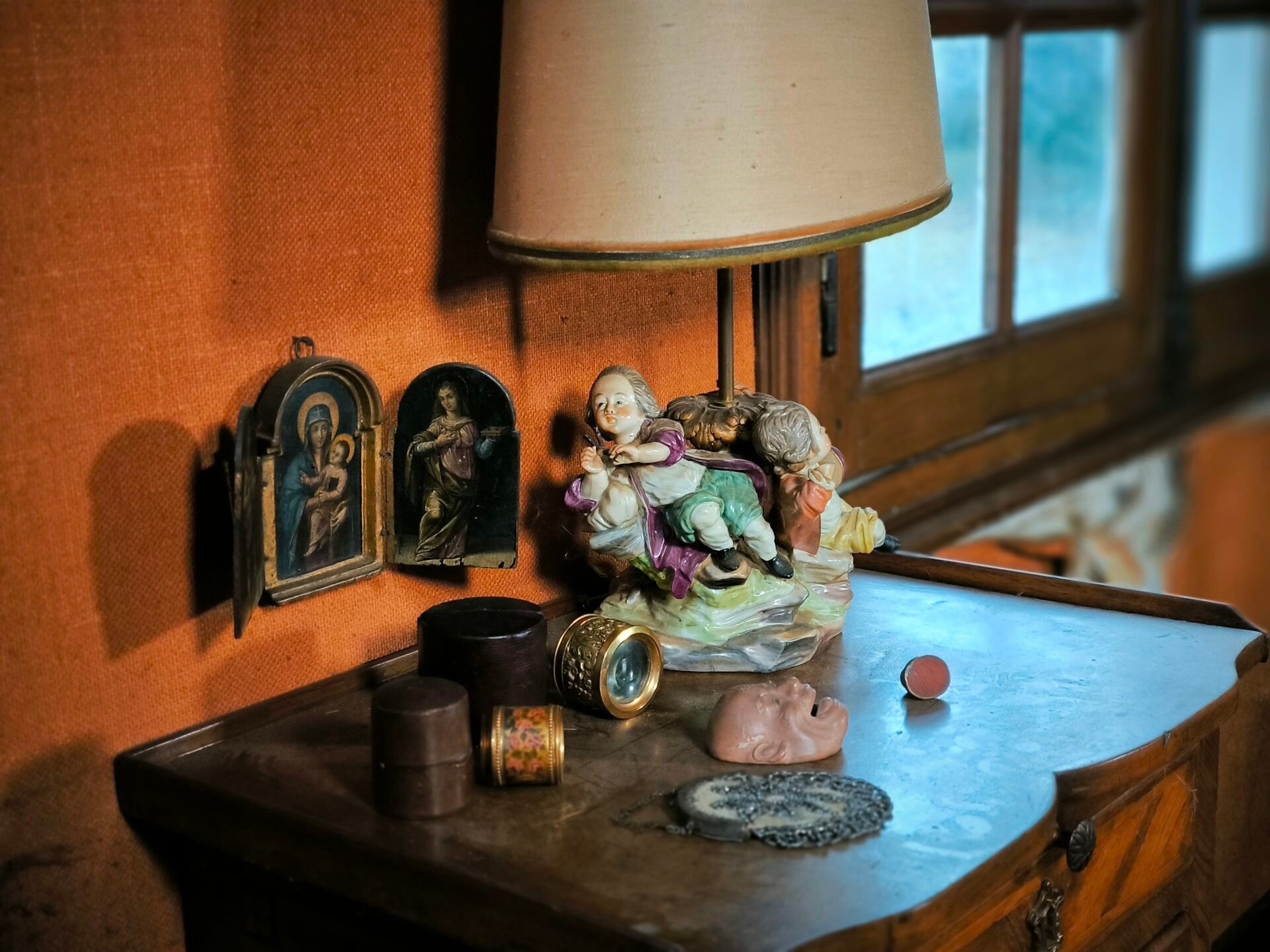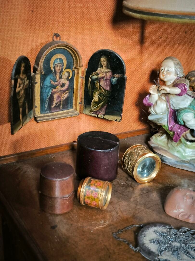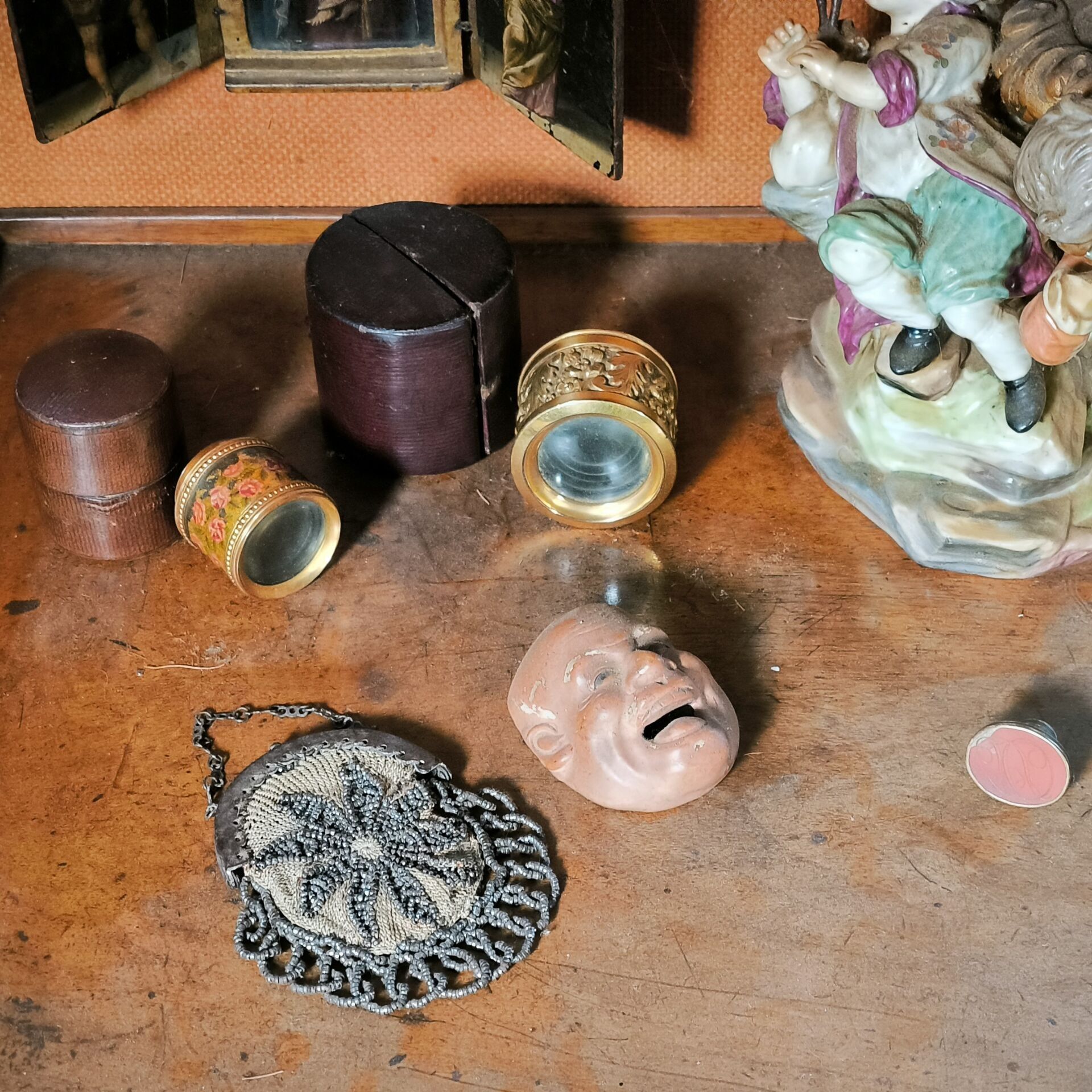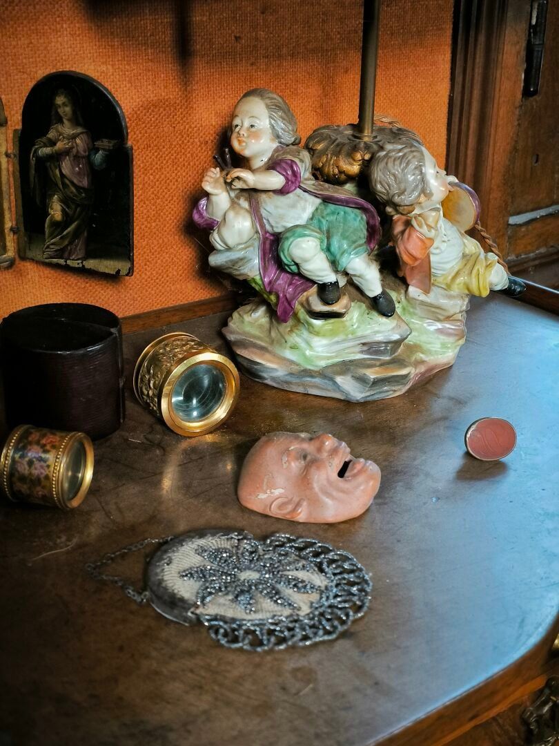 Lot (minor damage and missing parts): 2 theatrical lorgnons, a purse, a Japanese mask, a hard stone seal, a porcelain lamp, a small handle, and miscellaneous.