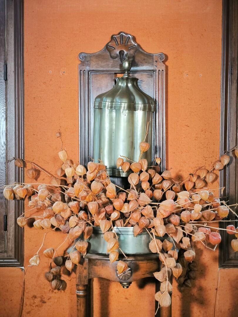 Pewter fountain and natural wood stand (assembly). Height 164 cm
