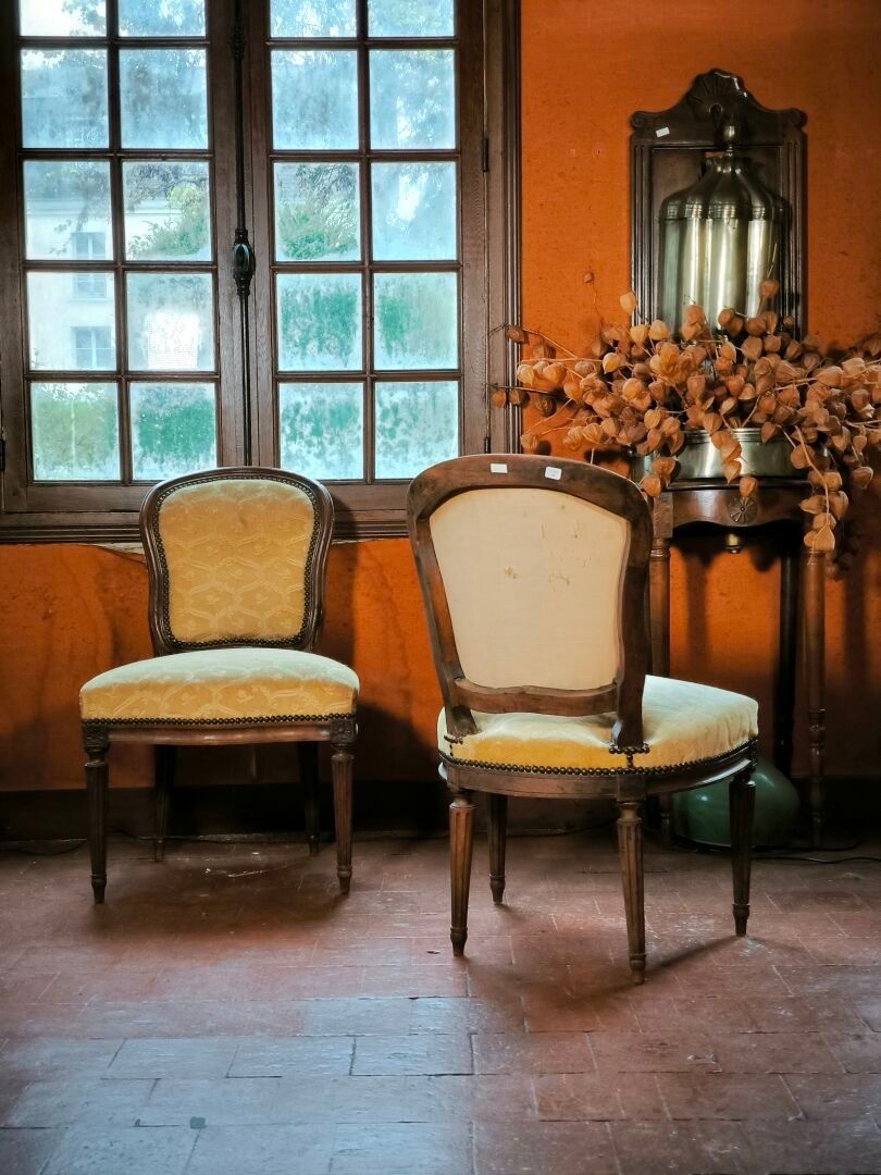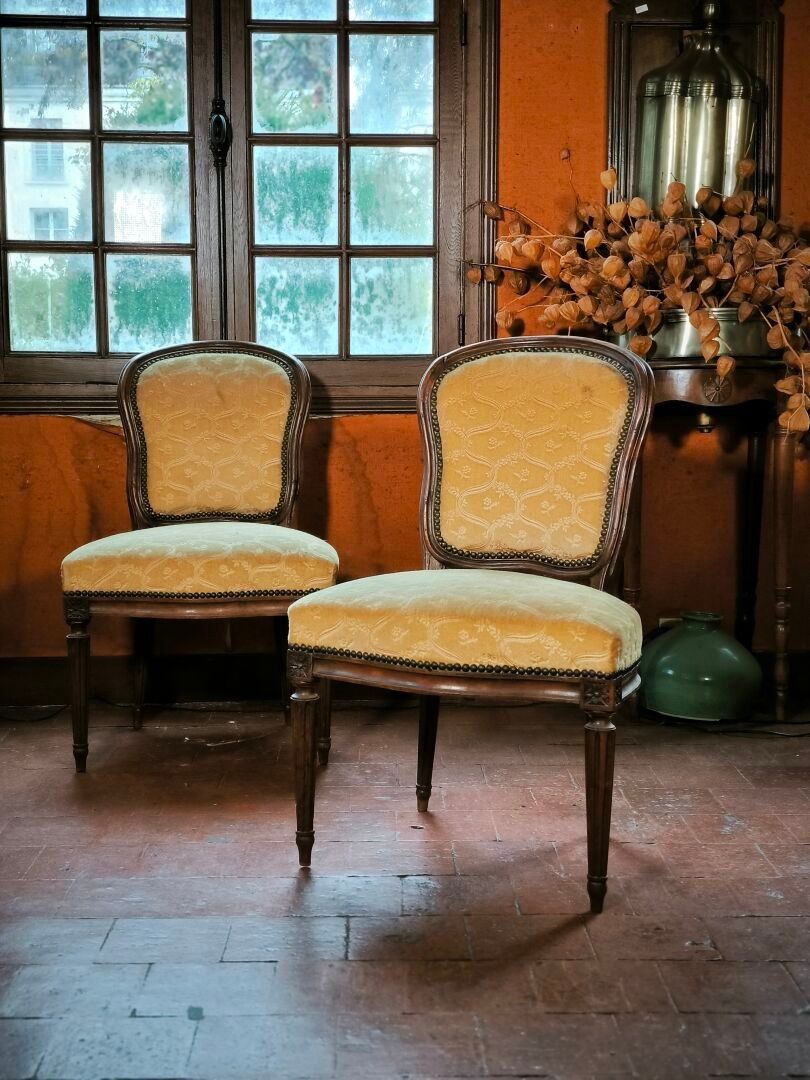 Pair of violoné chairs in natural wood, upholstered in yellow fabric. Louis XVI period (minor wear) Height 90 cm