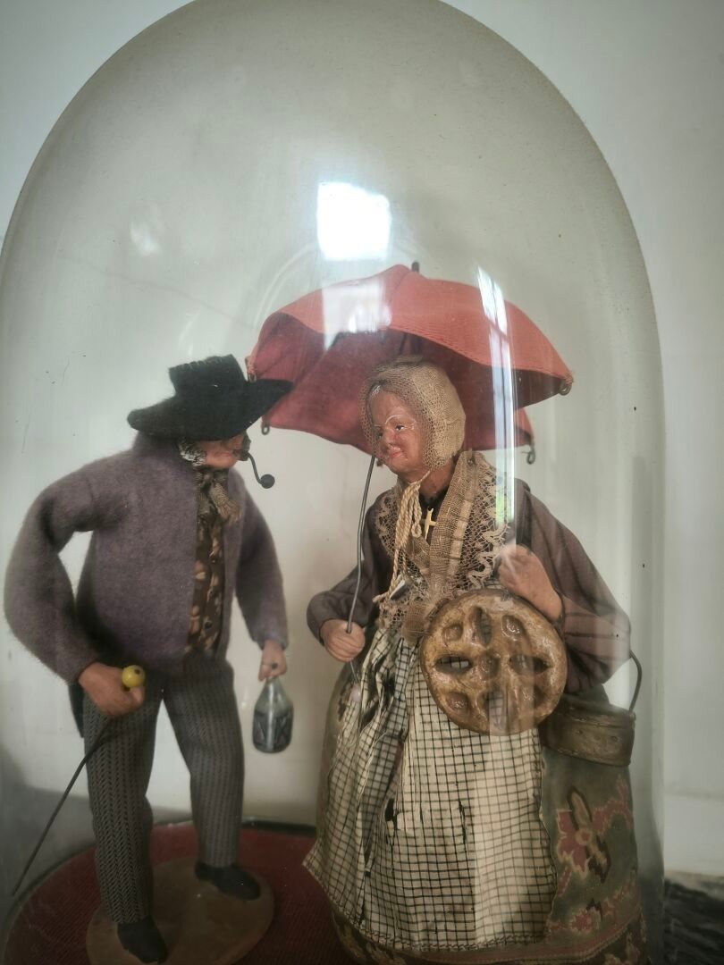Couple of old men, 2 old santons under a globe (minor wear) Height 28 cm (santons), Height 39 cm (globe)