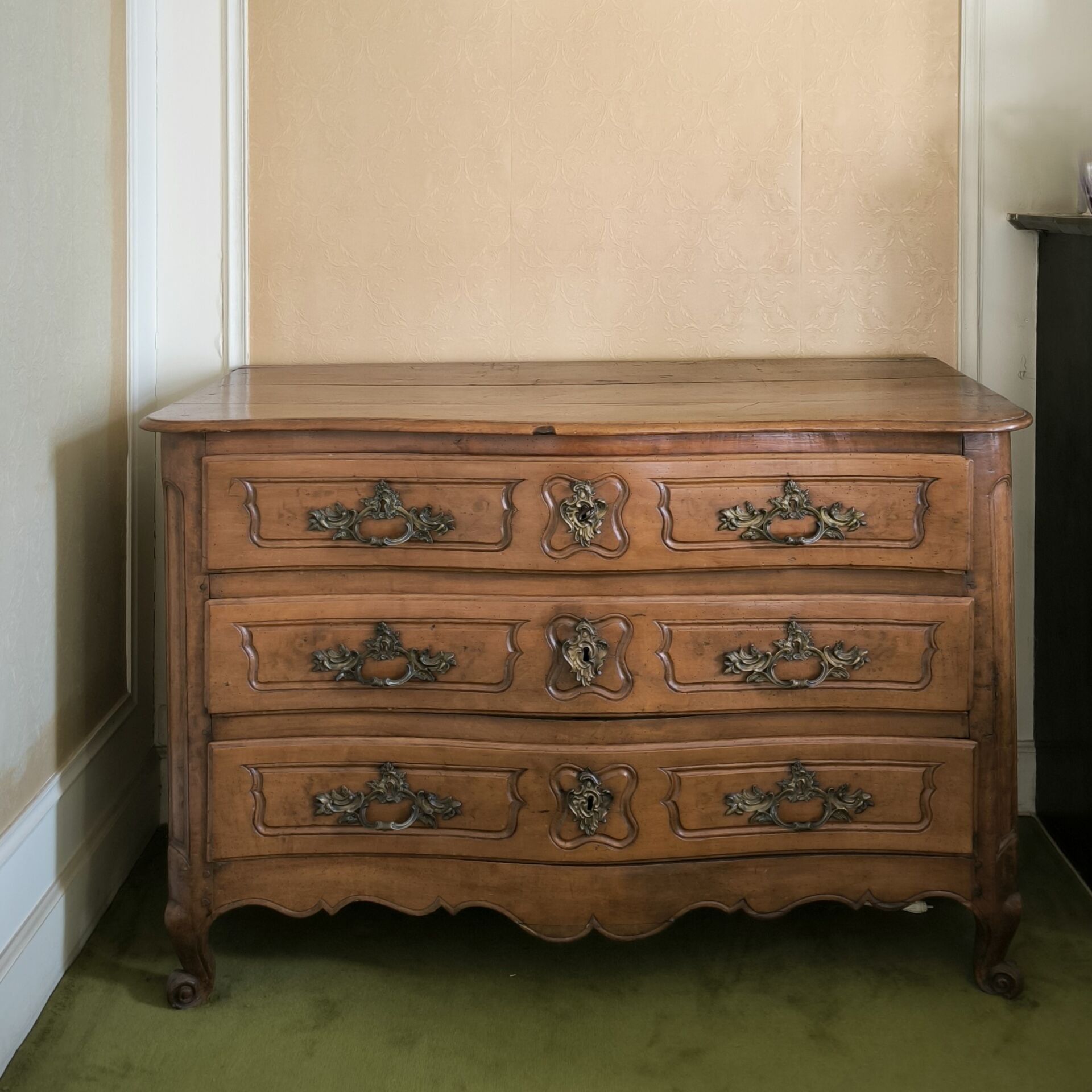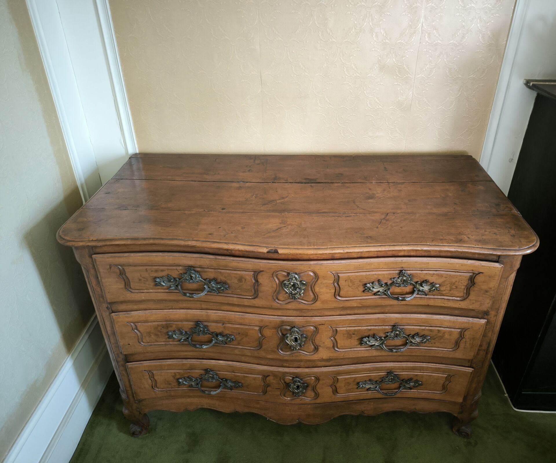 Walnut chest of drawers opening with three drawers. Louis XV period (damage, missing parts and restorations). 83.5 cm high, 130 cm long, 64 cm deep.