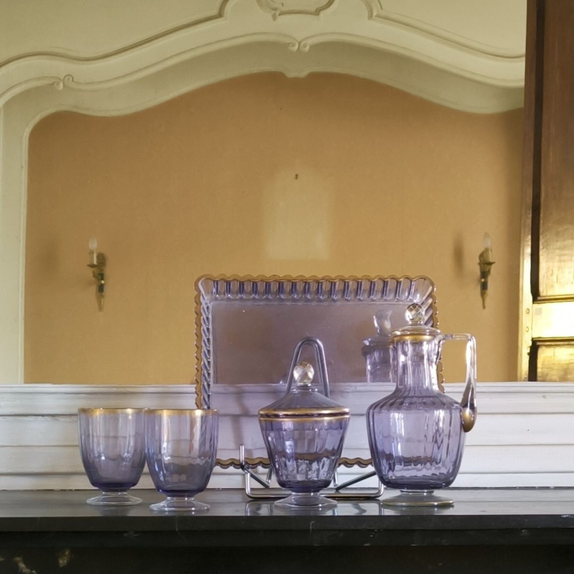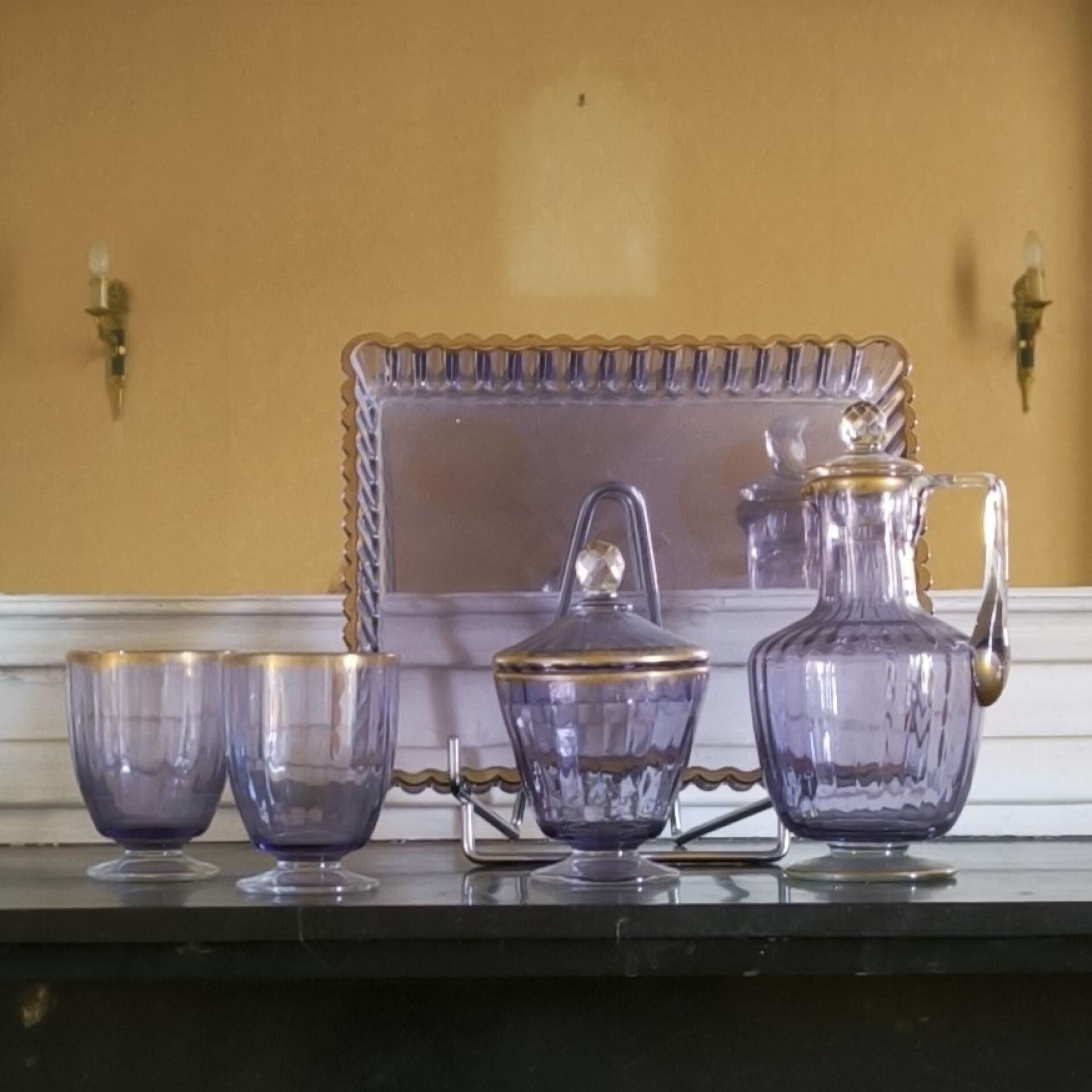 Purple crystal night service with gold edging (small chips): rectangular tray, carafe, sugar bowl, 2 glasses