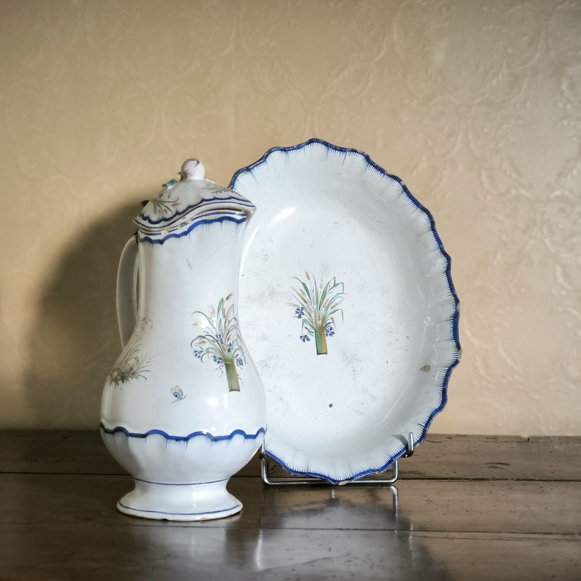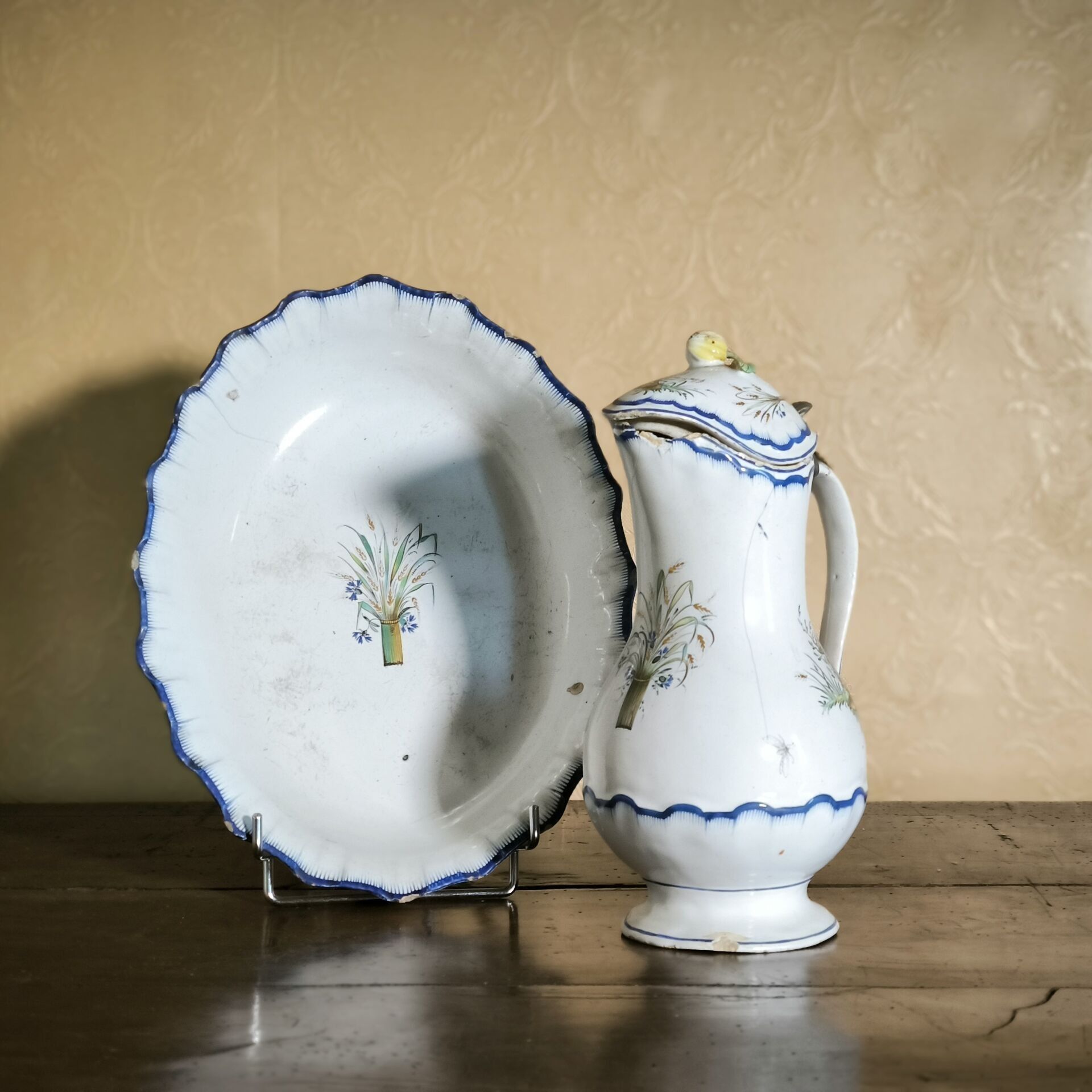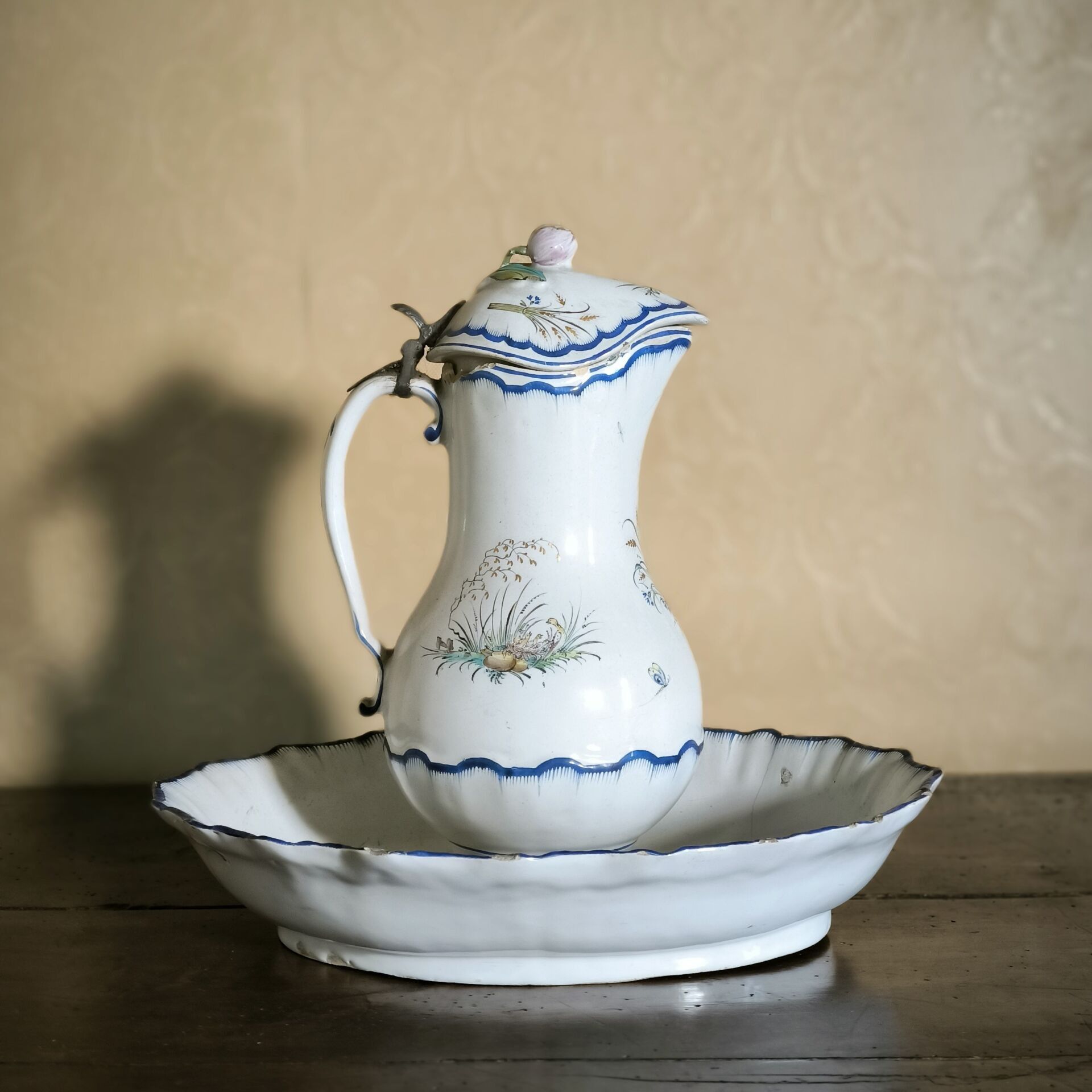 A polychrome earthenware ewer and basin decorated with a bouquet of flowers. 18th century (accidents, restorations, chips). Height 28 cm, length 33 cm