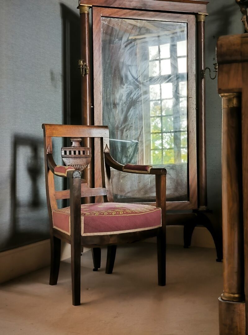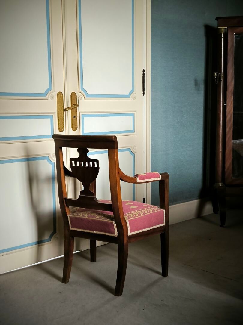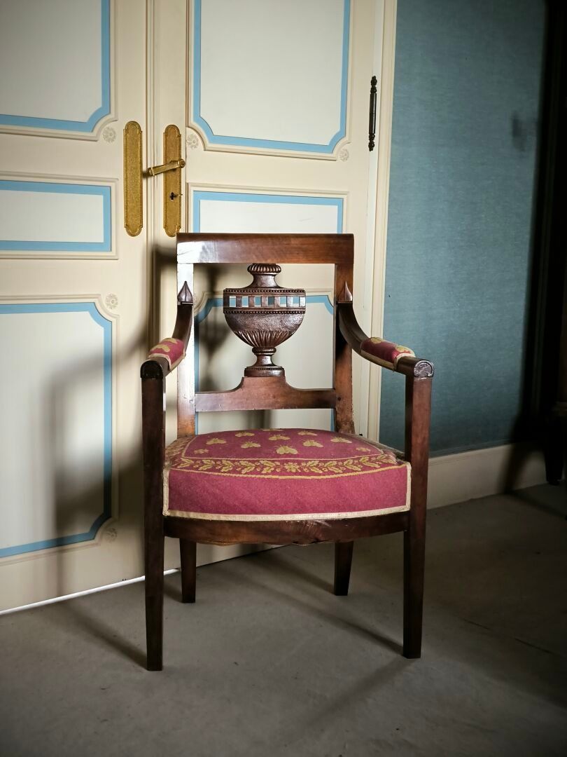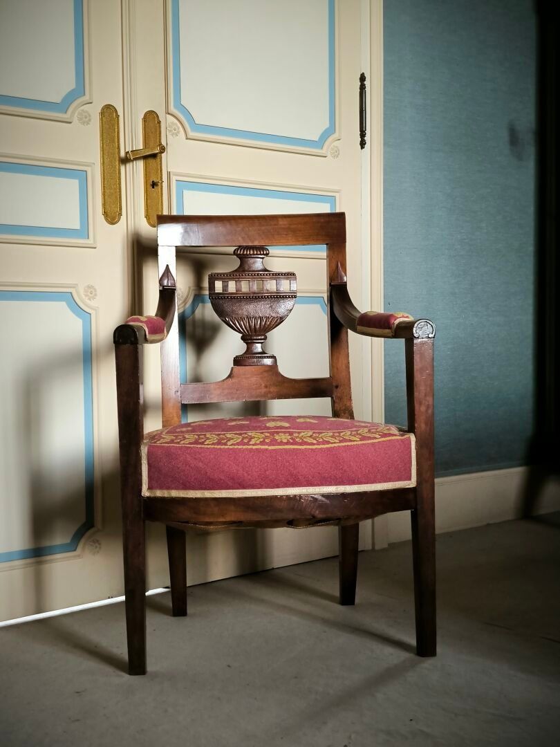Armchair in natural wood, the back openwork with an urn. Empire period (small acc.) Height 88 cm