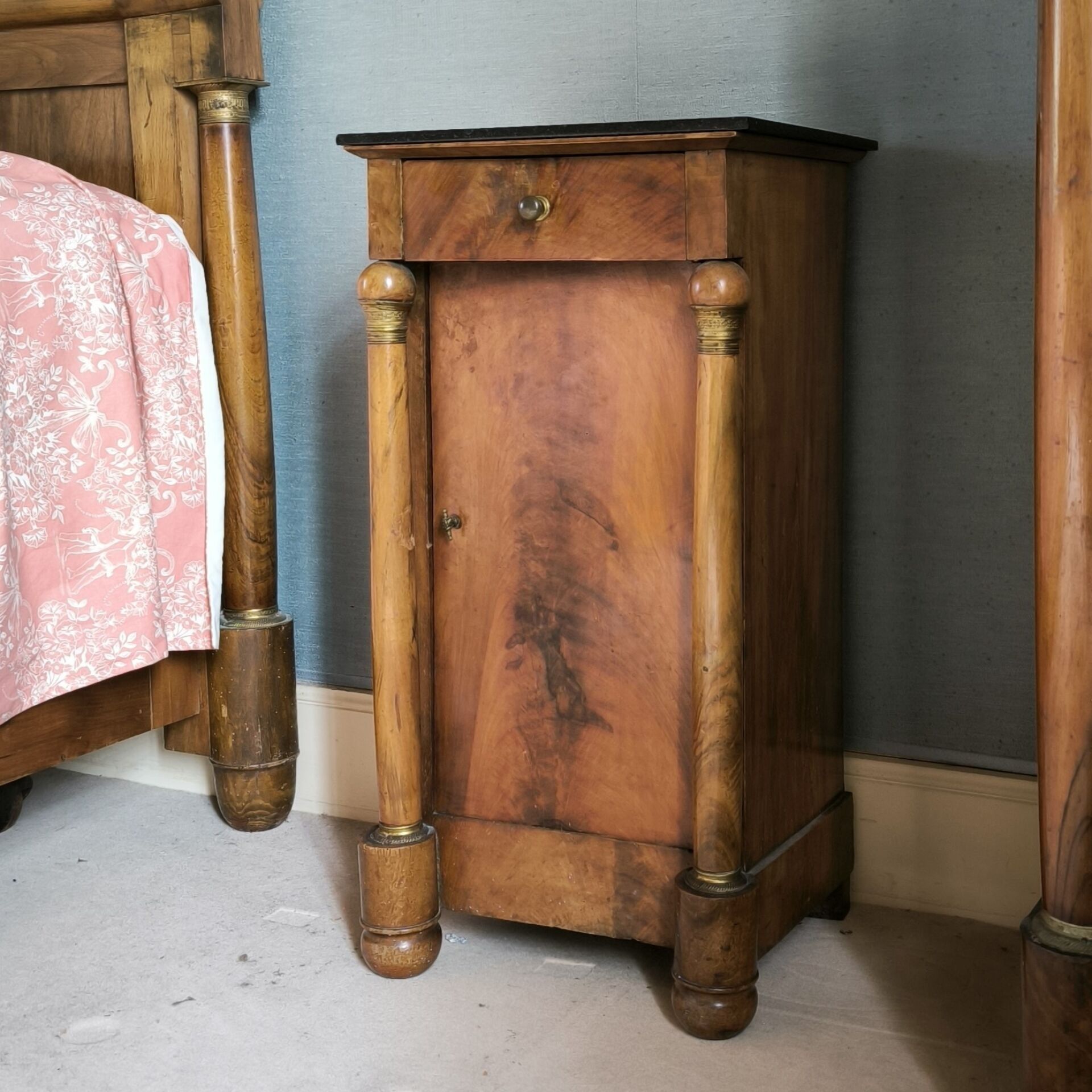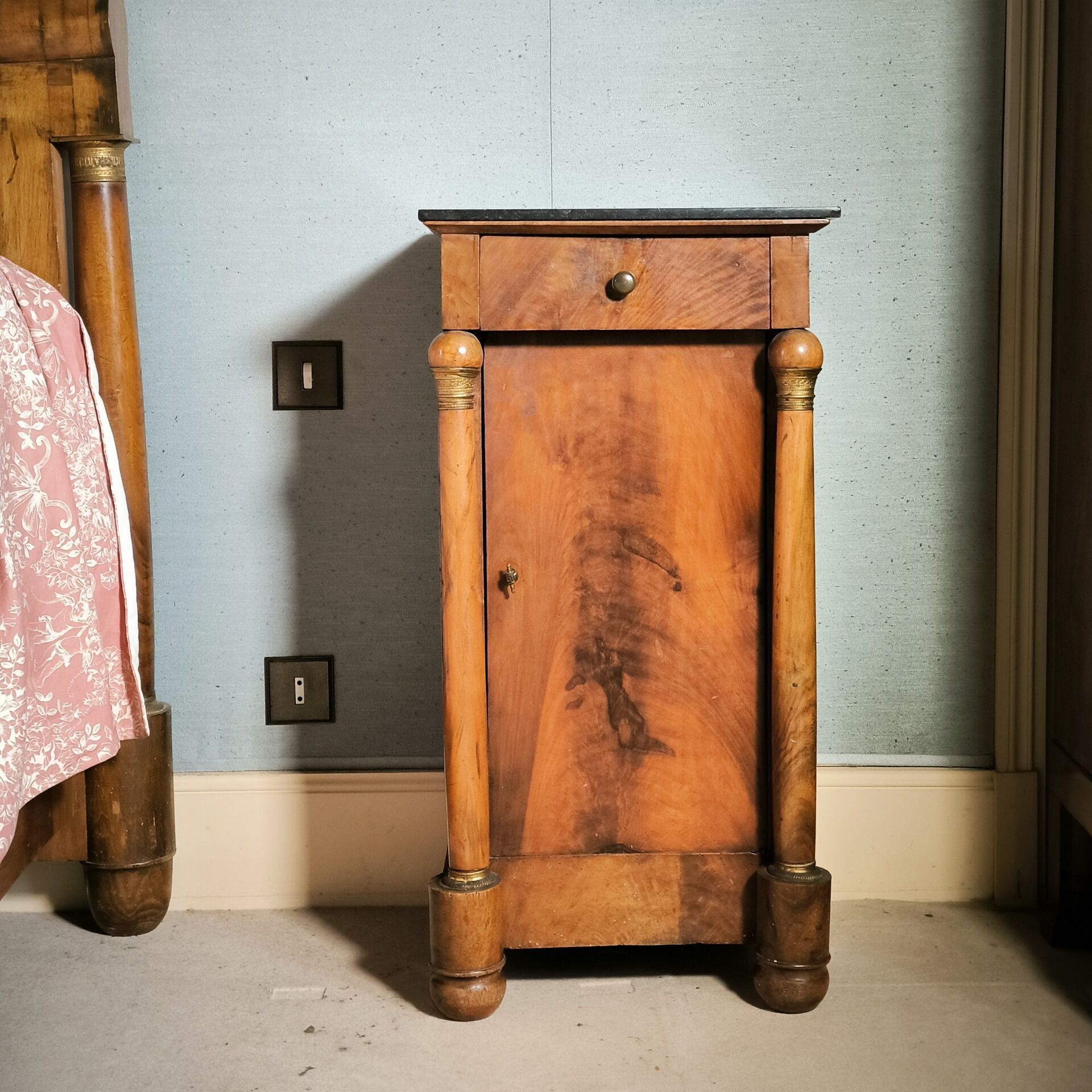 Walnut bedside table opening with a door and a drawer, with columns, bronze ornaments, marble top. Restoration period. (minor wear and acc.) Height 79 cm, length 41 cm, depth 35 cm