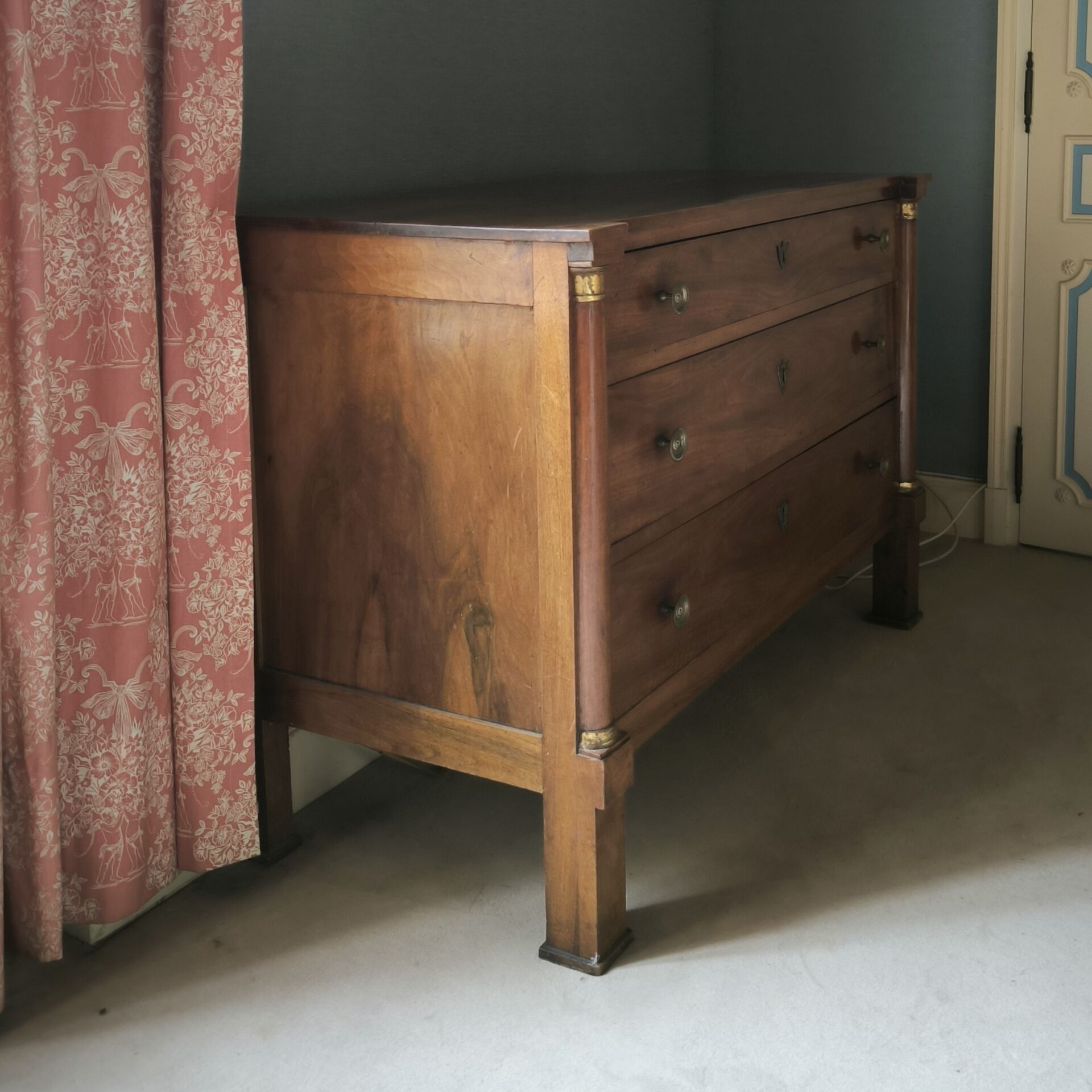 Walnut and veneered chest of drawers, opening with 3 drawers, bronze ornamentation. Empire period (minor damage). 89 cm high, 126 cm long, 59.6 cm deep.