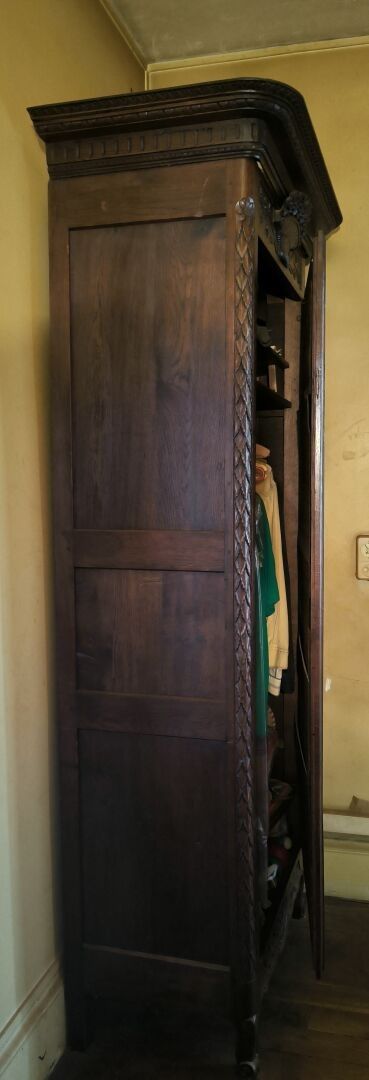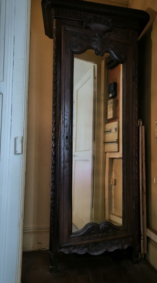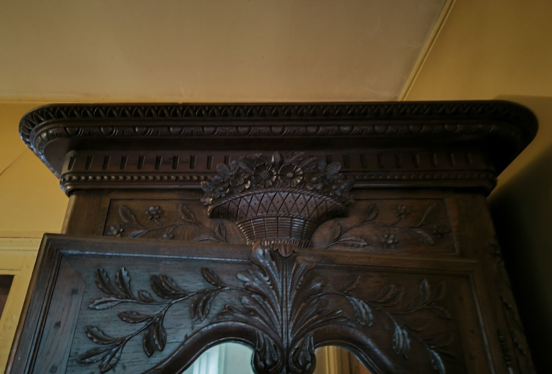 Carved oak Bonnetiere cupboard, opening through a door with a mirror, decorated with a frieze of foliage and a basket of flowers. Normandy, 19th century. Height 218 cm, length 91 cm, depth 60 cm