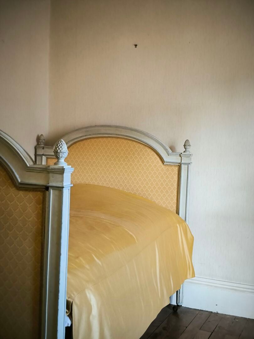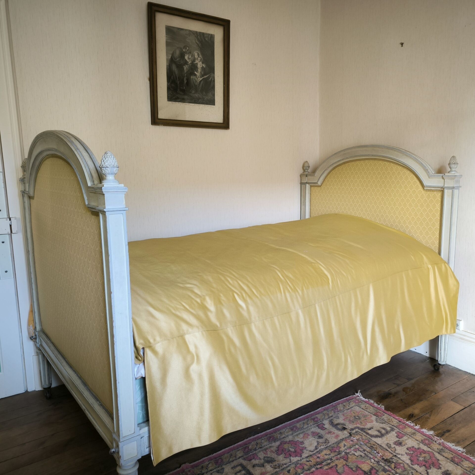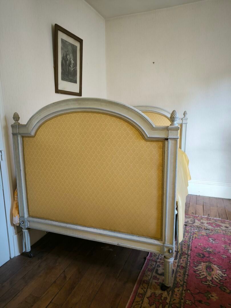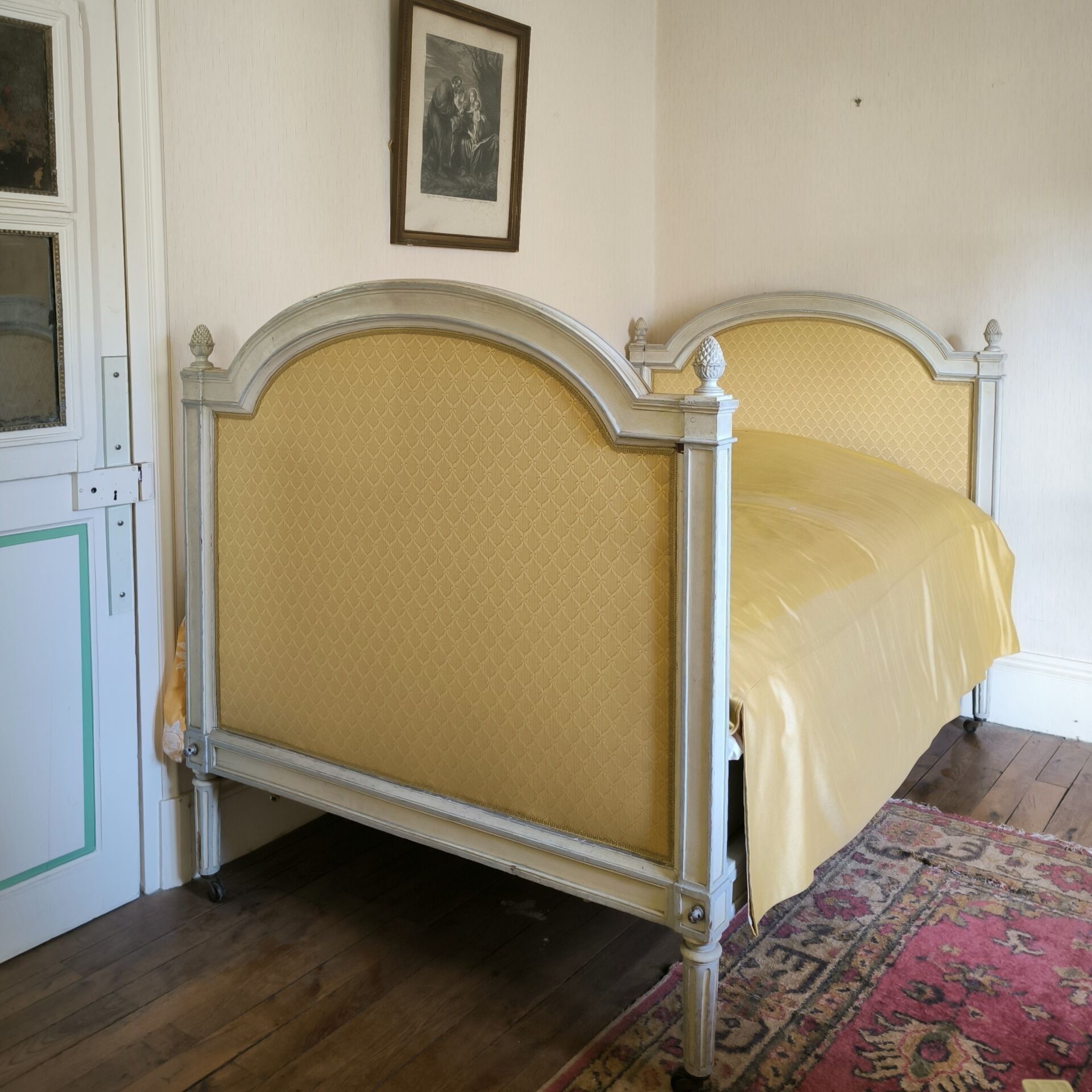 Painted wood bed, yellow fabric upholstery. Louis XVI period (minor wear and accidents). Height 137 cm, length 195 cm, depth 130 cm (without yellow satin top).